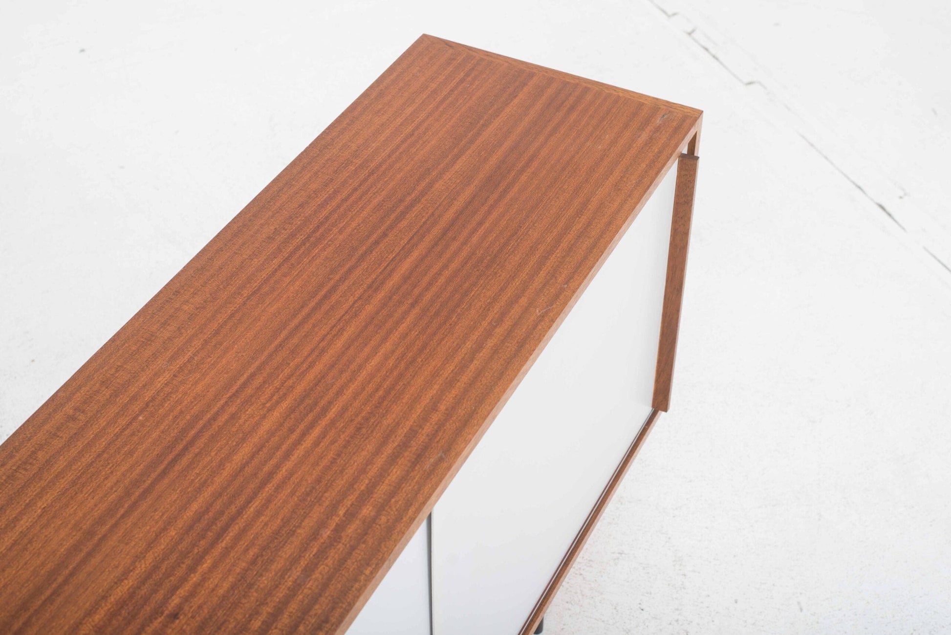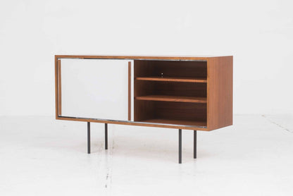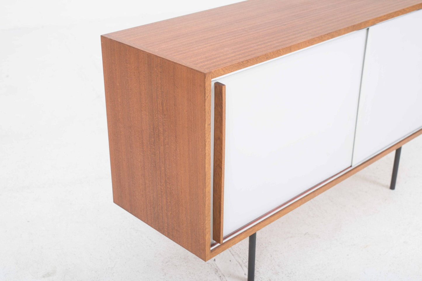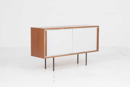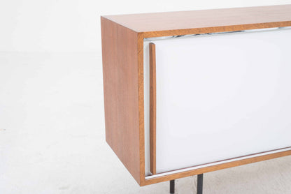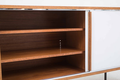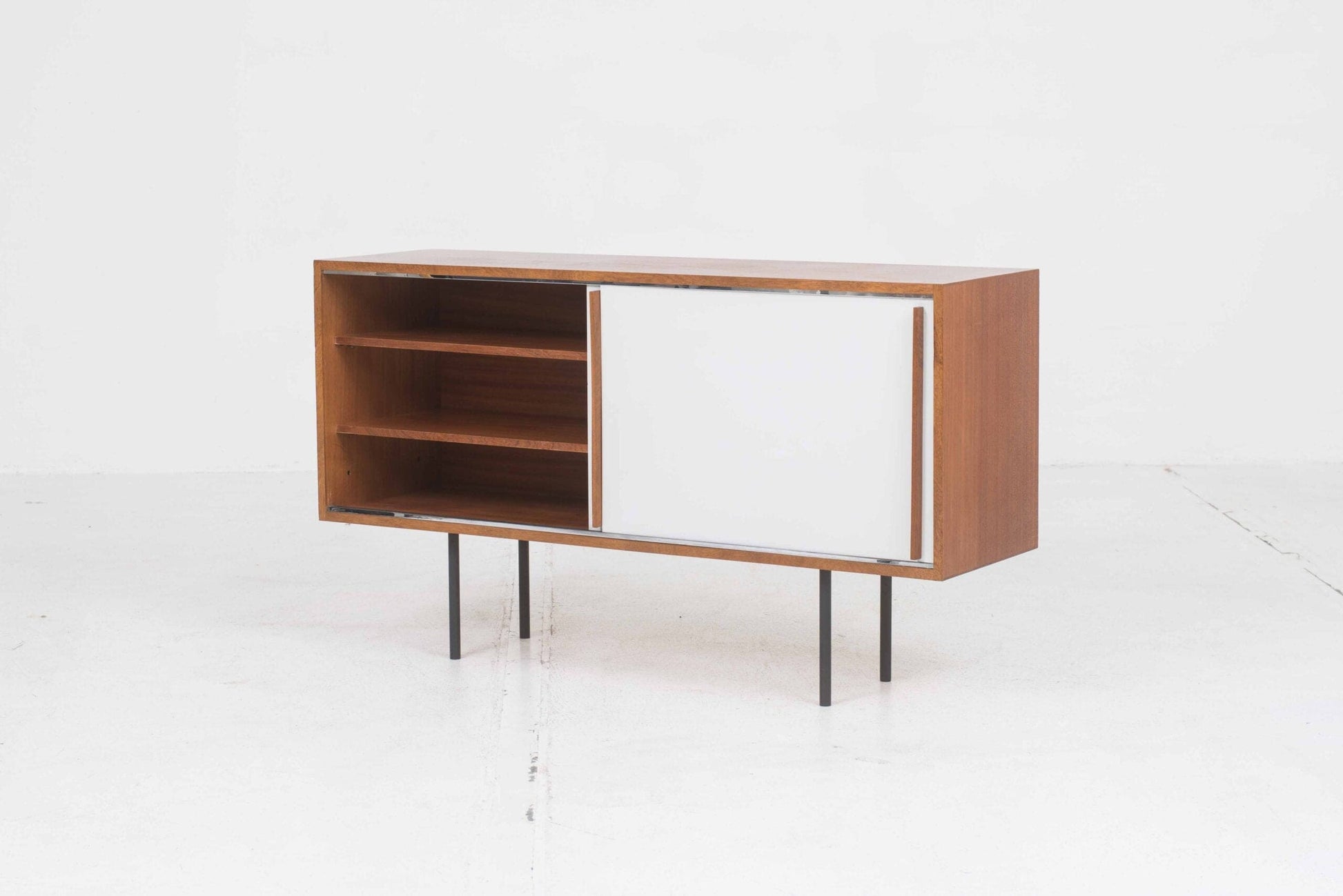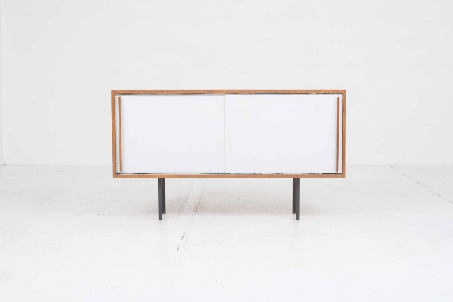 Discover the timeless design of Kurt Thut's vintage sideboard, a masterpiece of Swiss design. Known for his minimalist and functional designs, Kurt Thut created a piece with this sideboard that is both aesthetically pleasing and practical. The clean lines and use of minimal materials make it a perfect example of mid-century modern design. The light gray sliding doors add a touch of Space Age elegance to the sideboard.