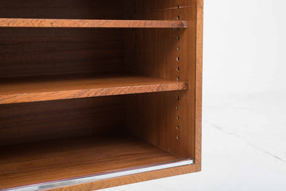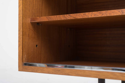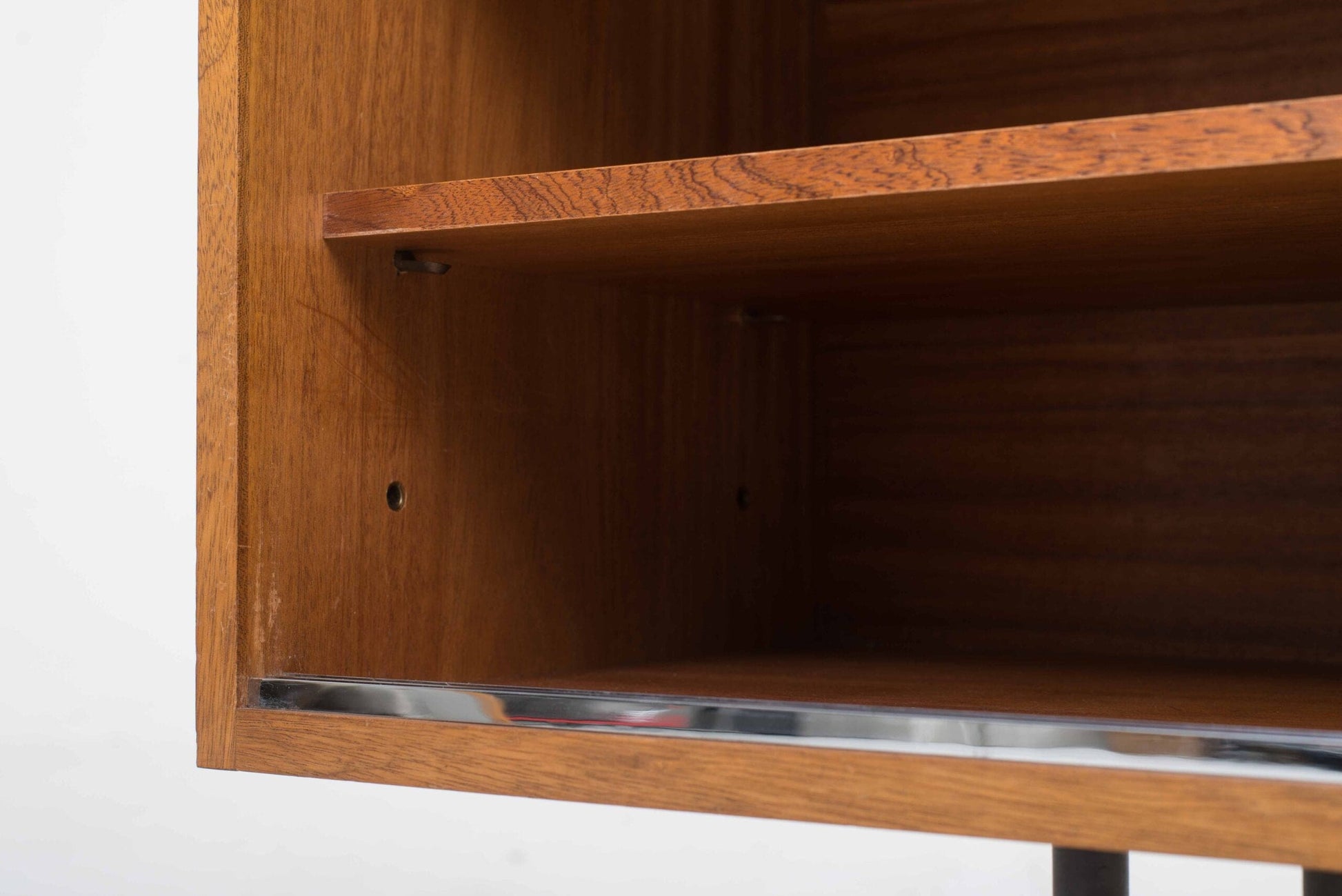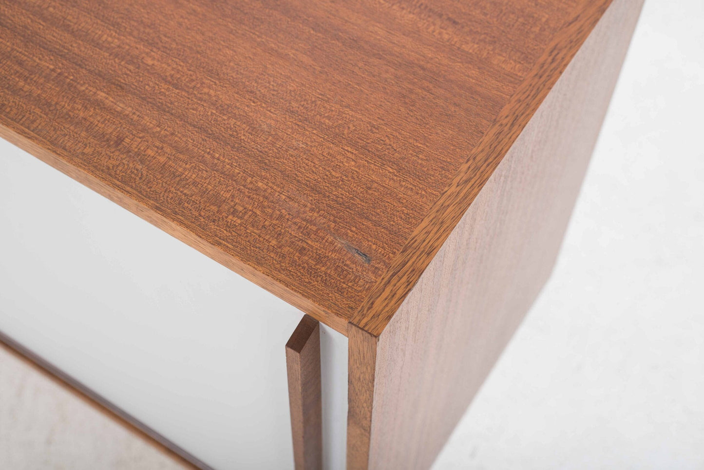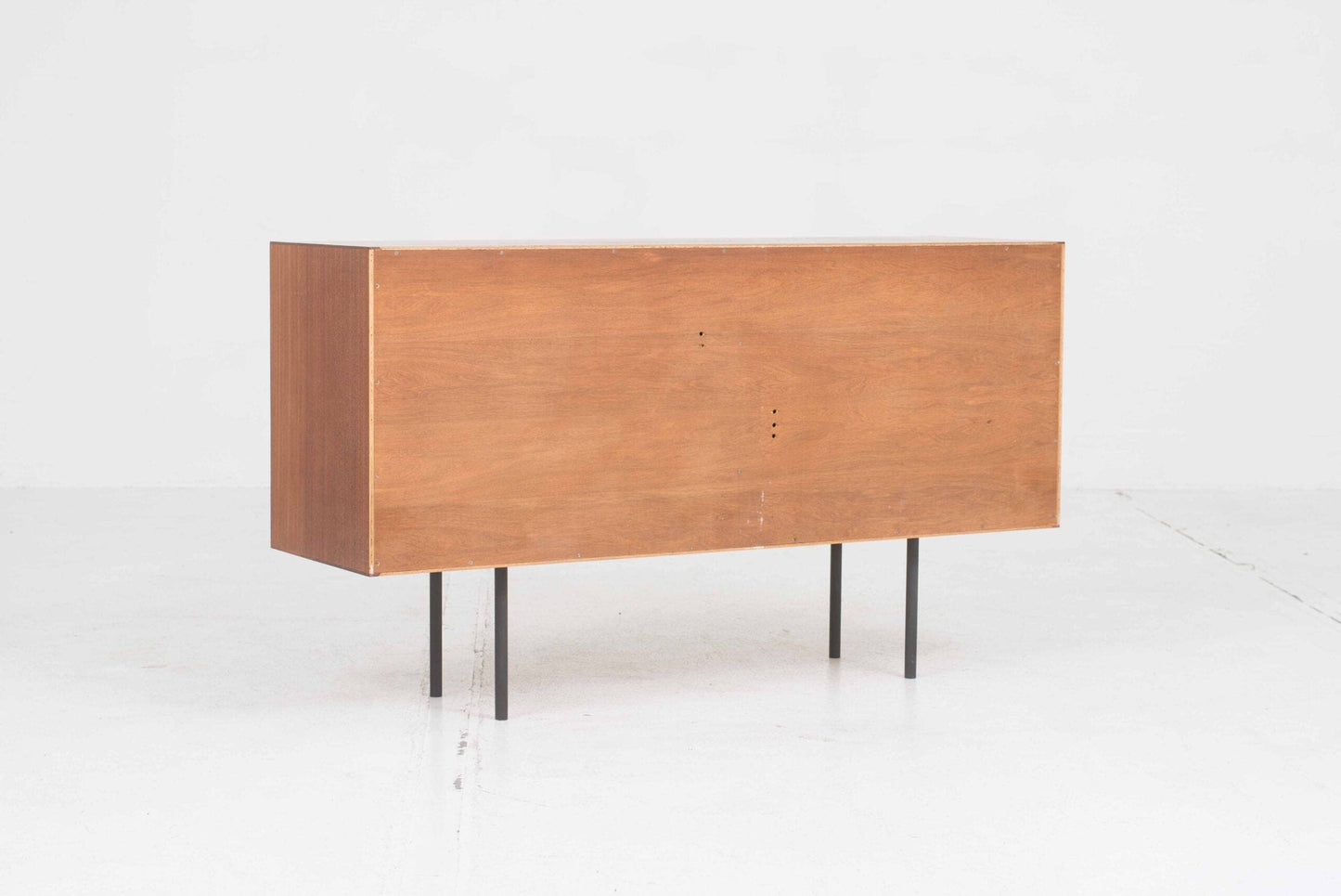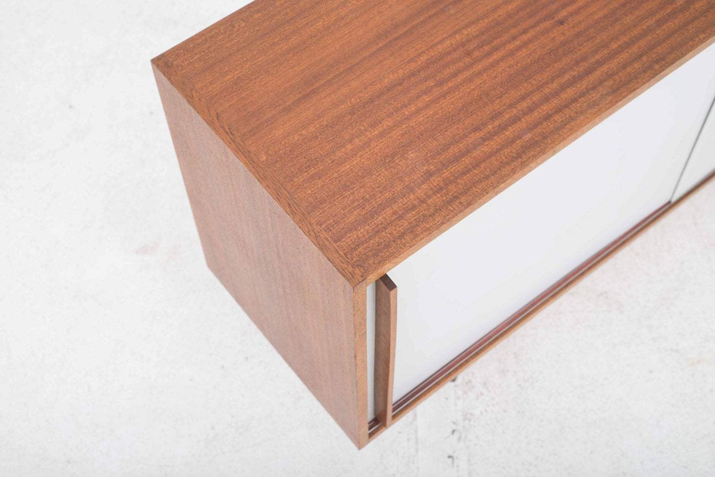 Discover the timeless design of Kurt Thut's vintage sideboard, a masterpiece of Swiss design. Known for his minimalist and functional designs, Kurt Thut created a piece with this sideboard that is both aesthetically pleasing and practical. The clean lines and use of minimal materials make it a perfect example of mid-century modern design. The light gray sliding doors add a touch of Space Age elegance to the sideboard.