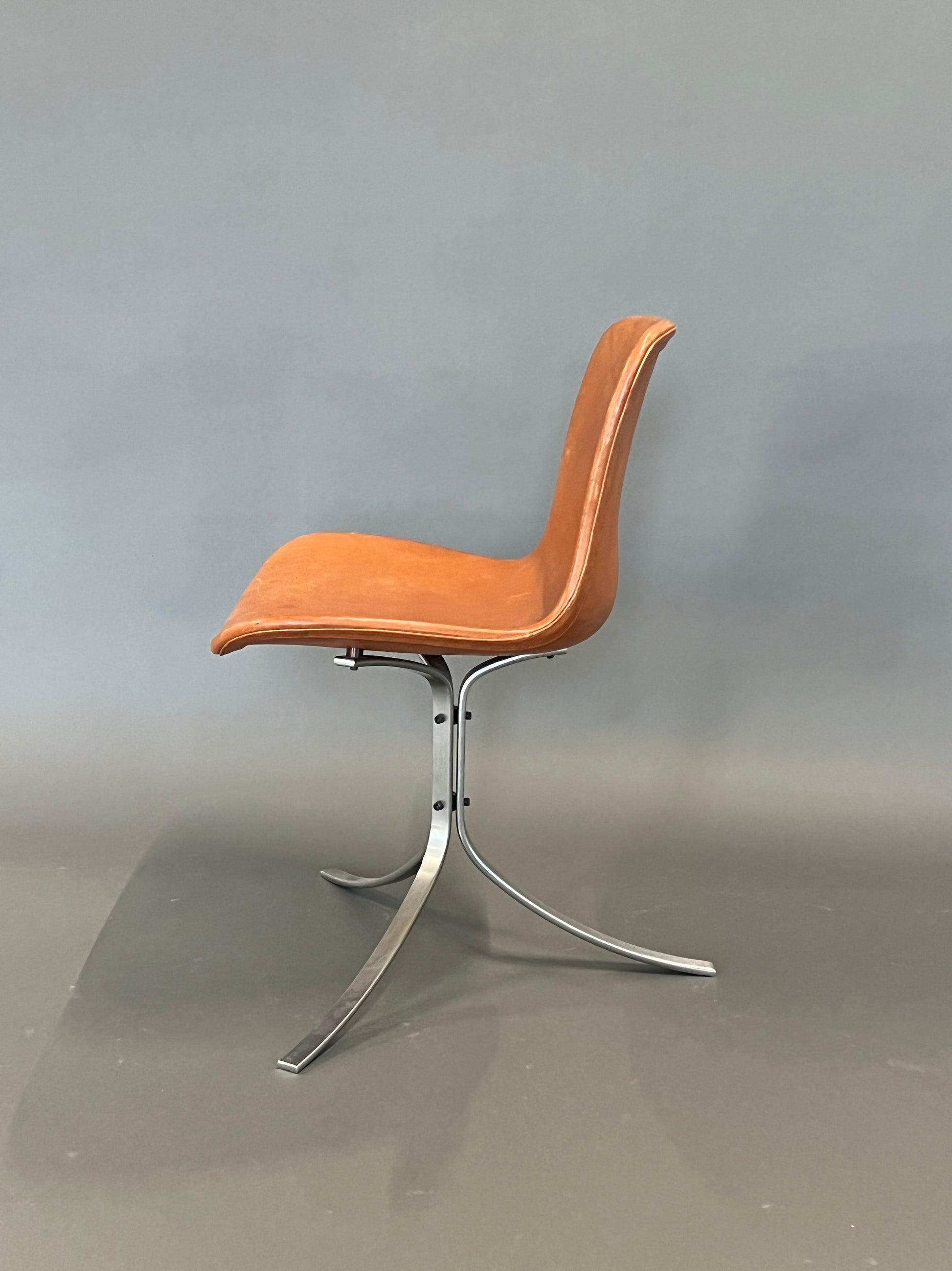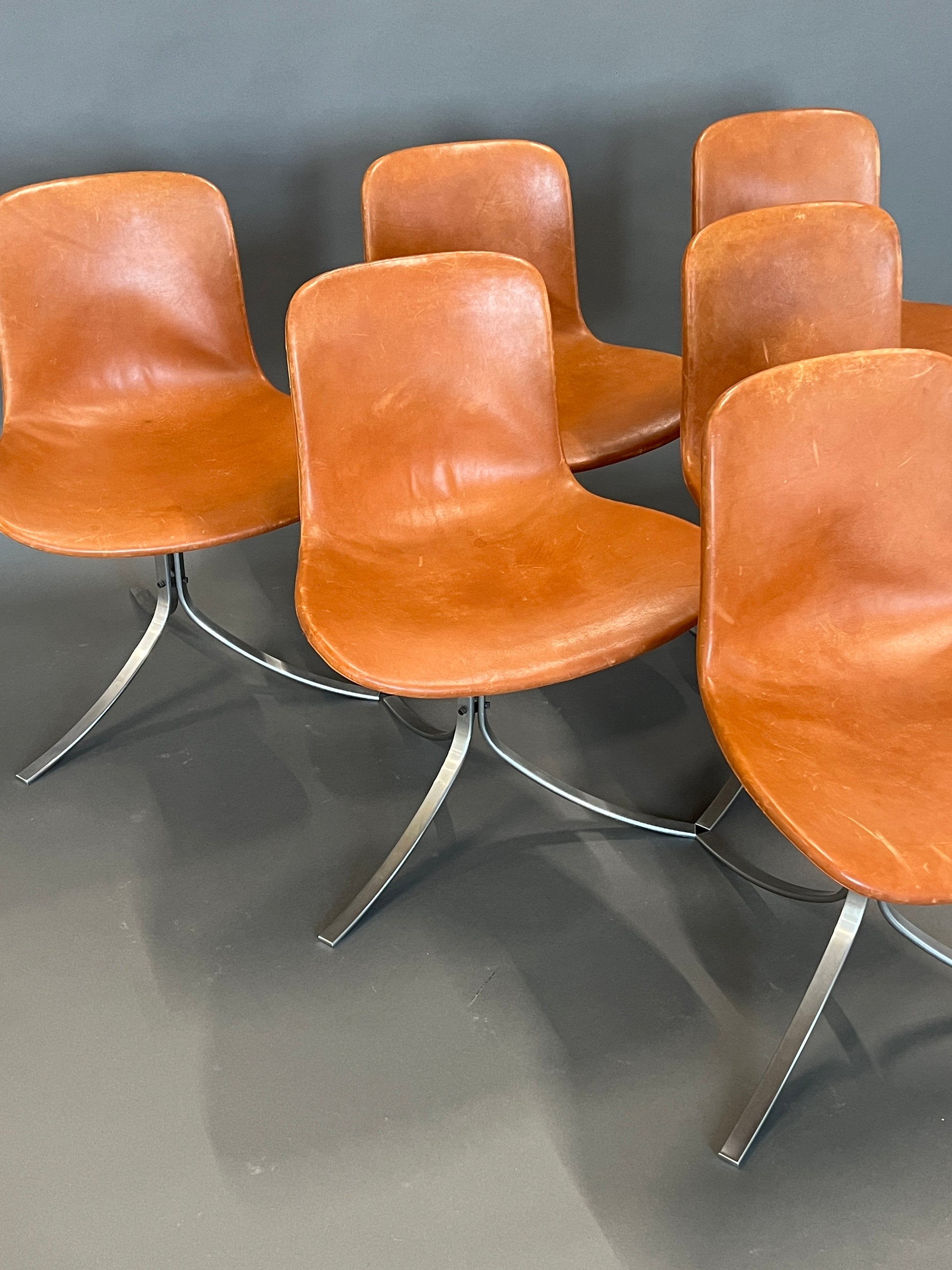 Six PK 9 chairs by Poul Kjærholm, clear and sculptural. Cognac-colored leather meets cool steel. The form is minimalist, the proportions precise. The seat welcomes without being ostentatious. The PK 9 embodies material honesty and tranquility. Mid-century at its core, with a subtle touch of space age. In the dining area, the set establishes a calm rhythm. It combines comfort with structure while remaining understated. A piece of design history that doesn't make a fuss, but convinces – through its lines, its poise, and its confident presence in the room.