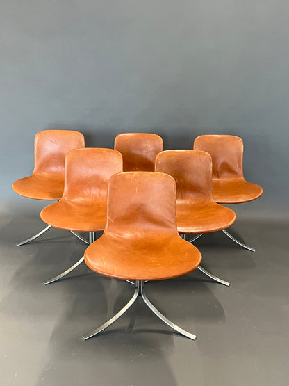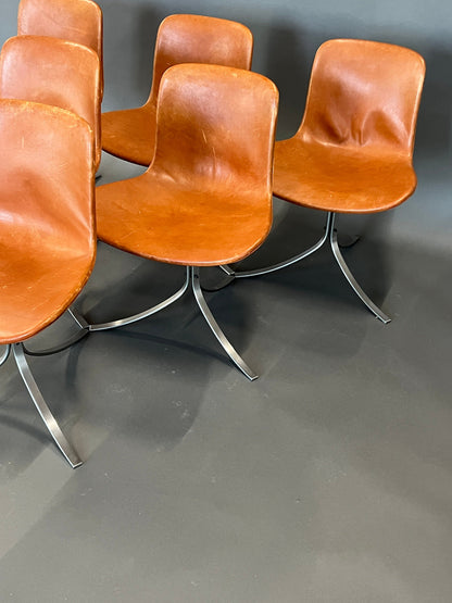 - Special features: Set of 6 PK 9 chairs; clean lines and precise proportions; steel frame with leather upholstery; subtle space-age feel.