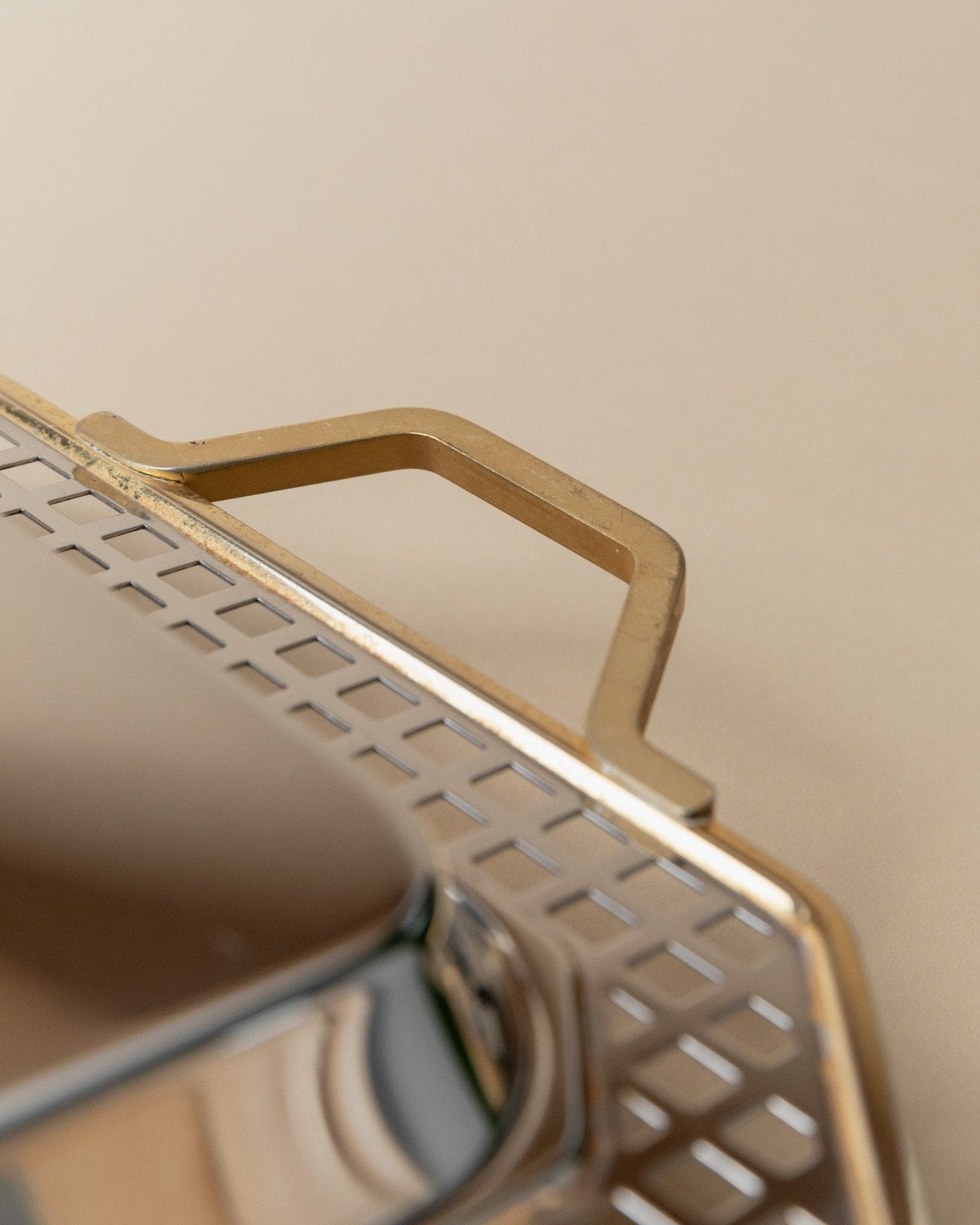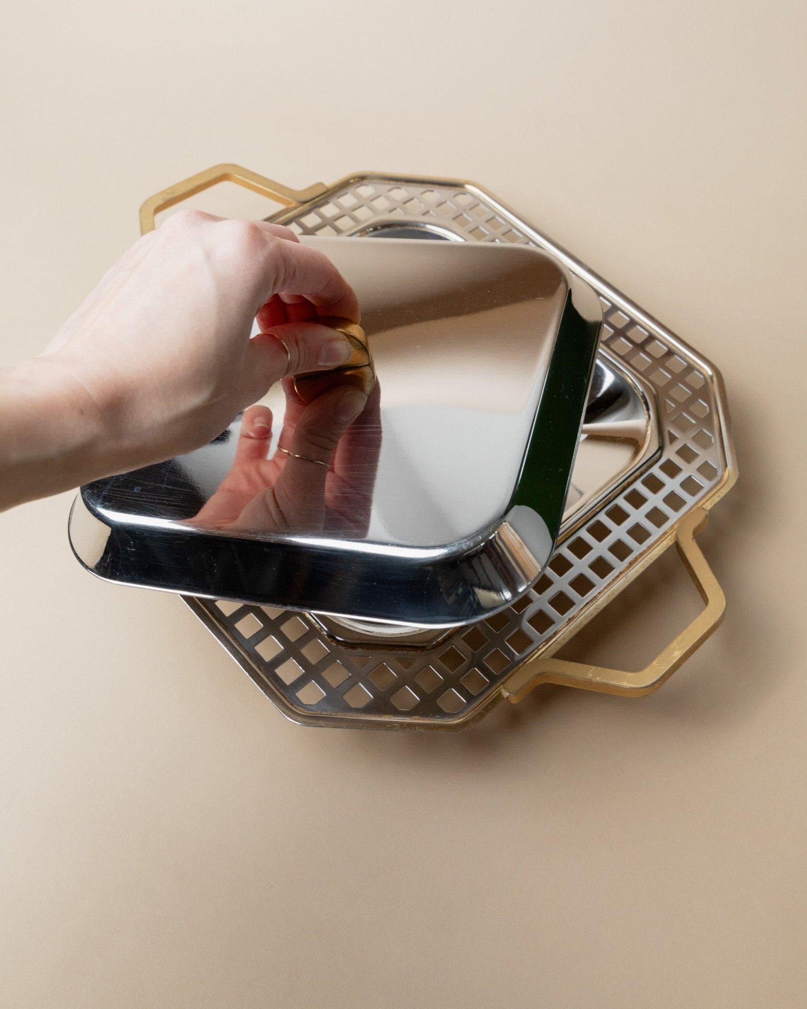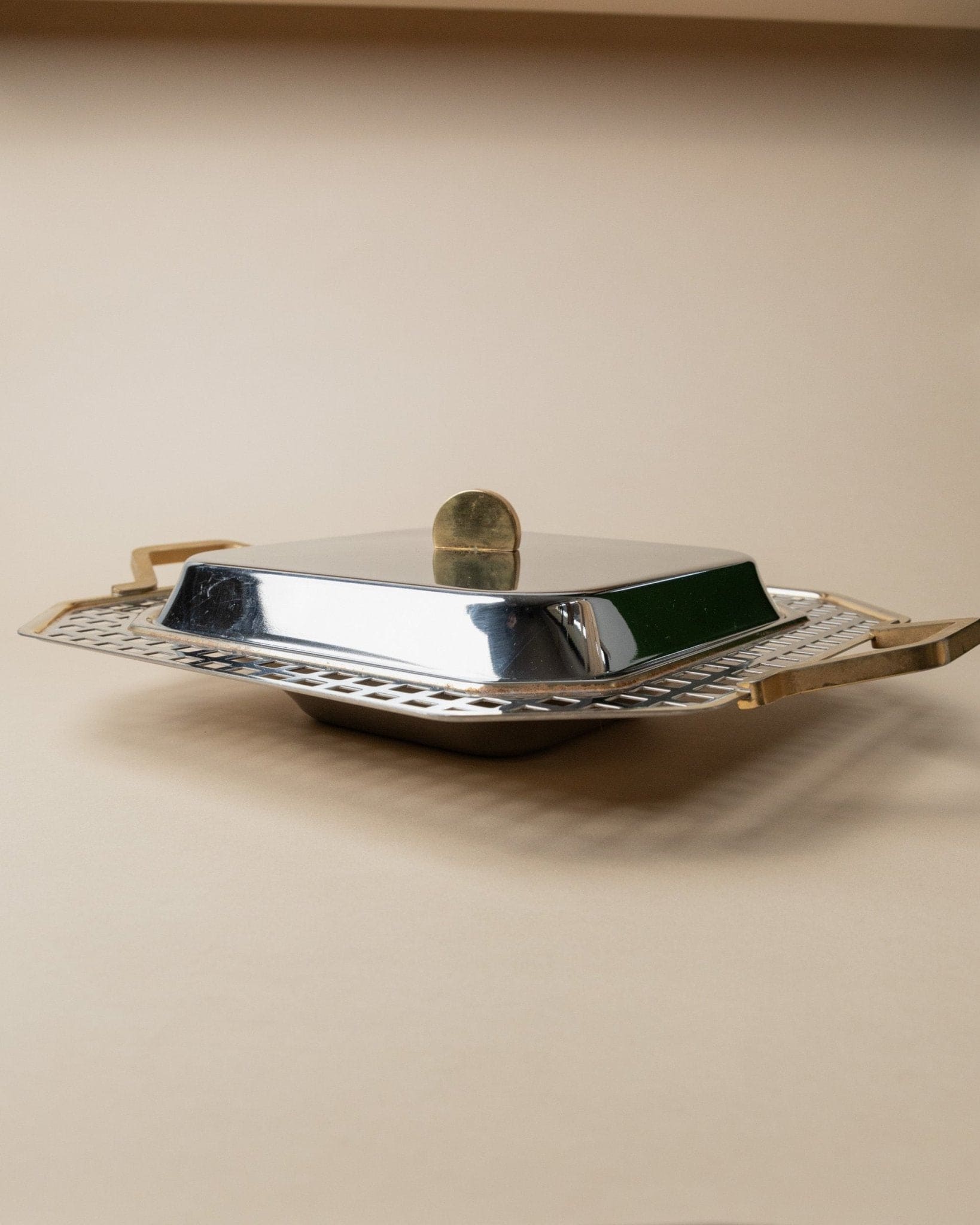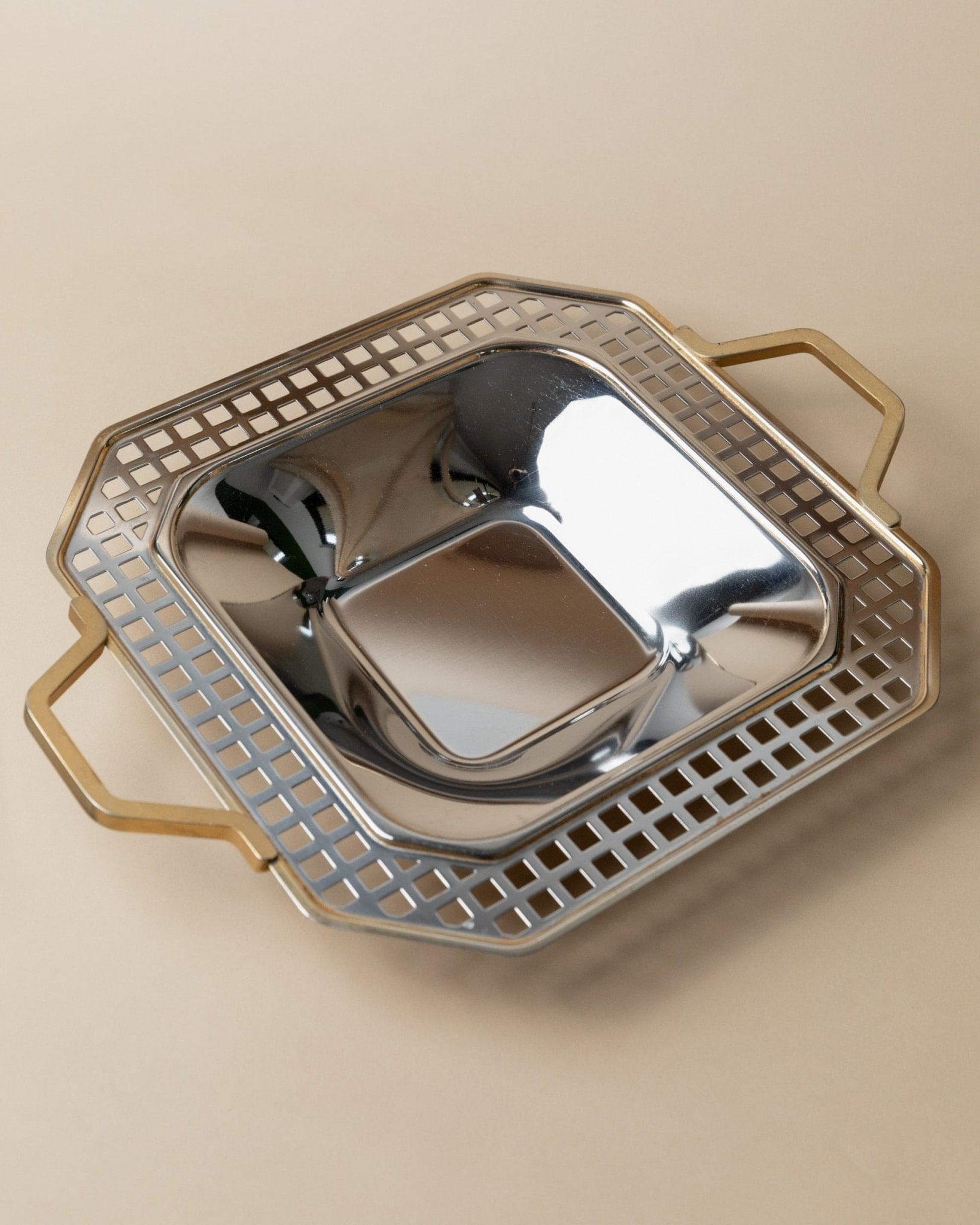 Discover the timeless design of the Vintage Tray made of stainless steel by Inoxpran, part of the Orchidea line. With its elegant gold rim and artistic checkered details along the edge, this tray is a true gem from the 1980s. Combining functionality with aesthetics, it is both a practical serving piece and a stylish decorative object for your table. Whether for special occasions or everyday use, this tray ensures a stylish presentation of your food.
