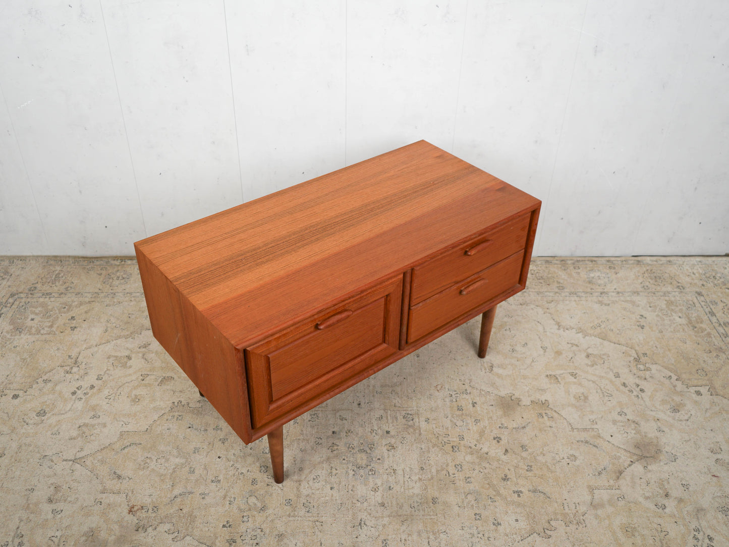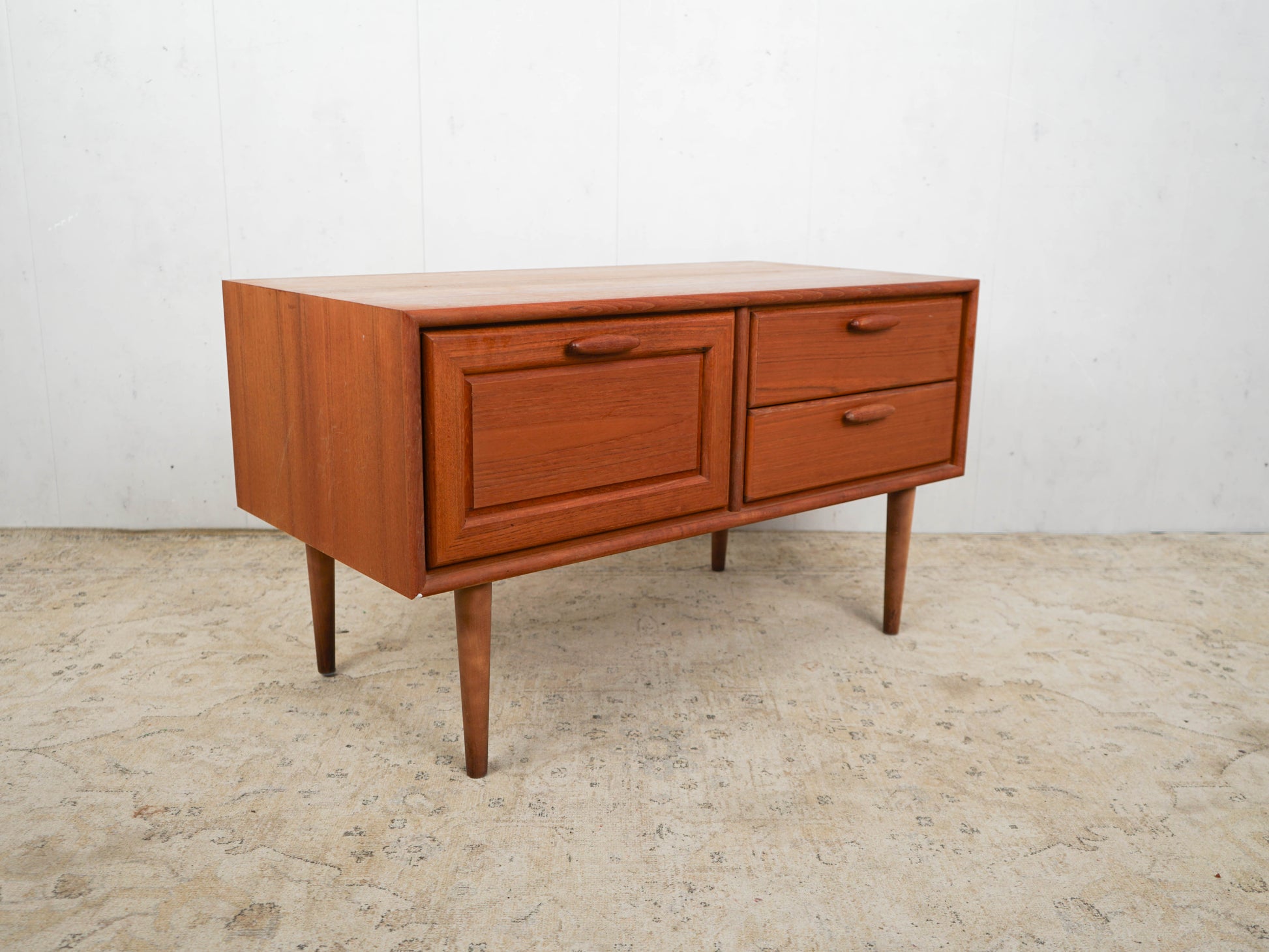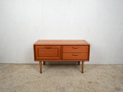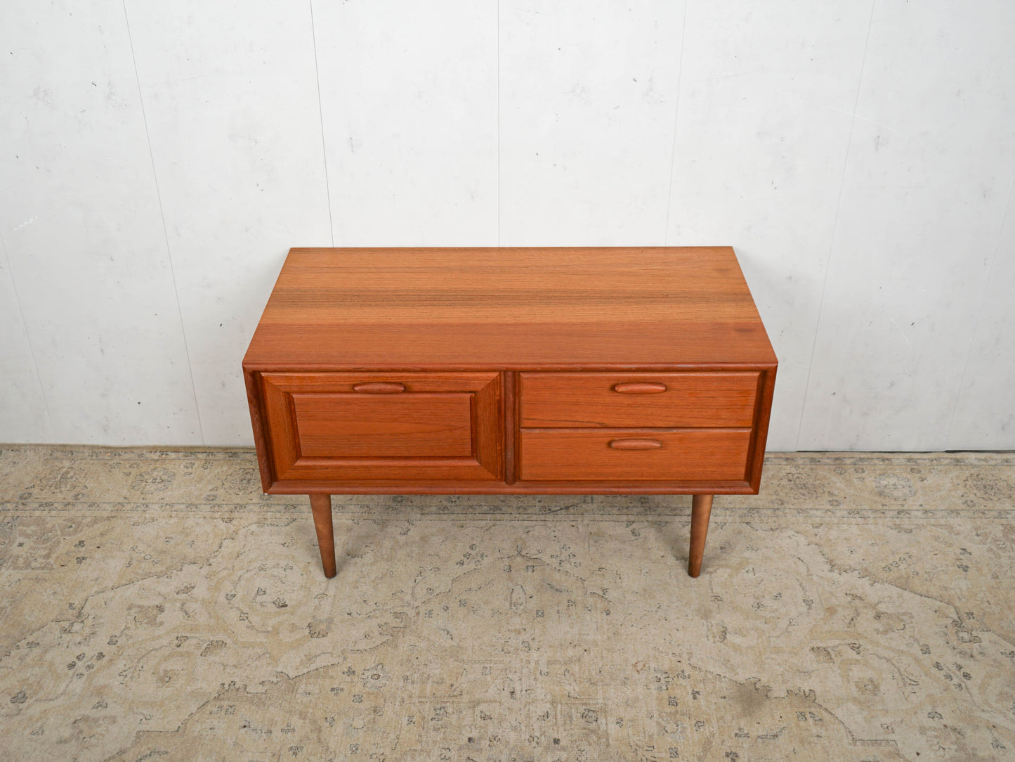 Discover the timeless design of this Danish teak sideboard from the 1960s, which shines in excellent vintage condition. Combining functionality and style, this sideboard is a perfect example of mid-century modern design. The warm radiance of the teak and the clean lines make it an eye-catcher in any room. Ideal for lovers of space-age furniture looking for a unique piece.