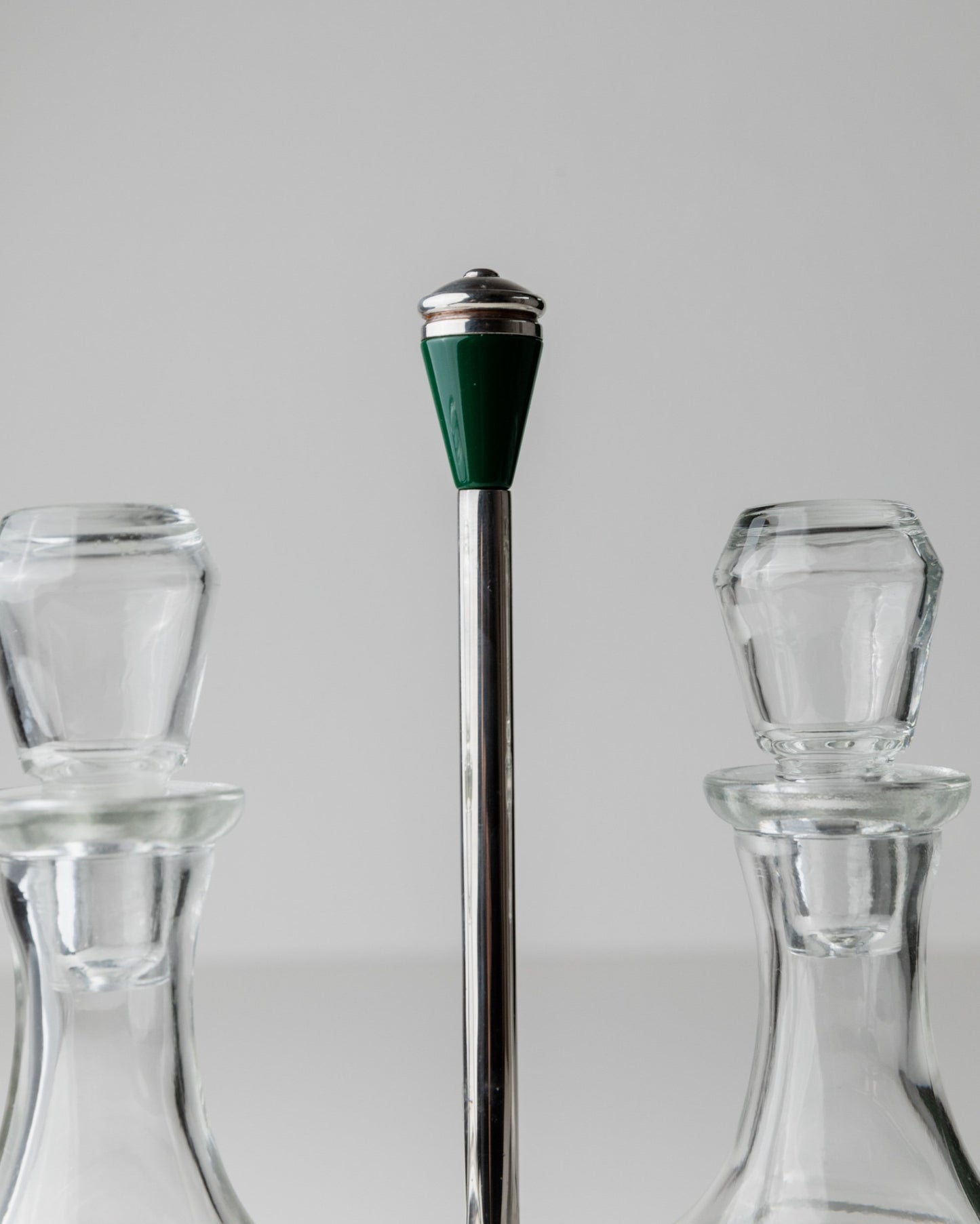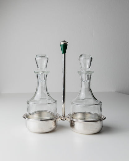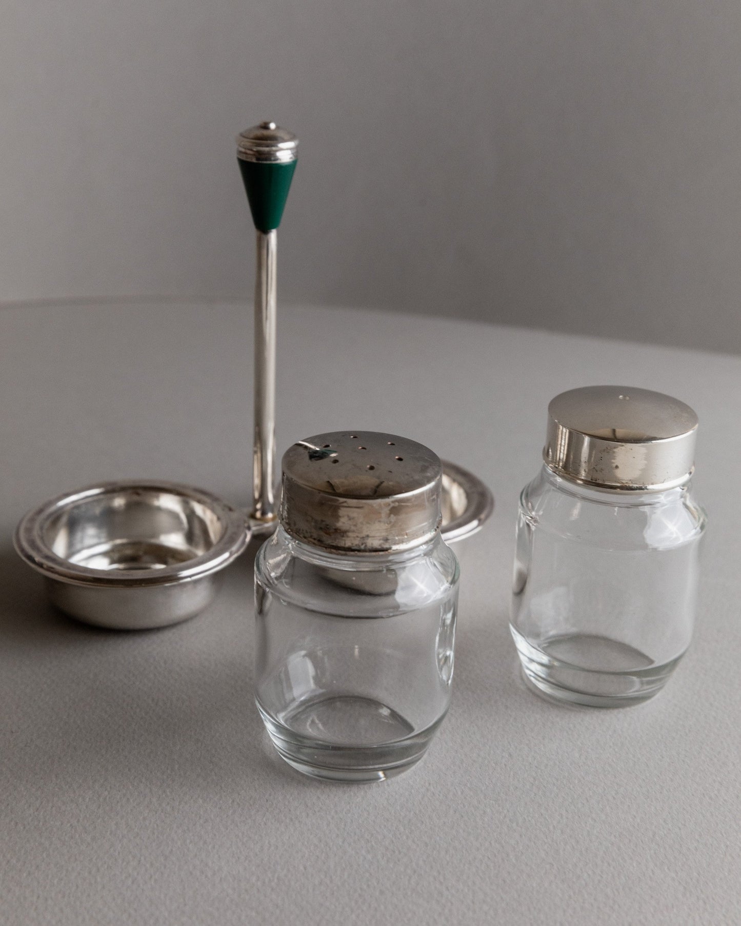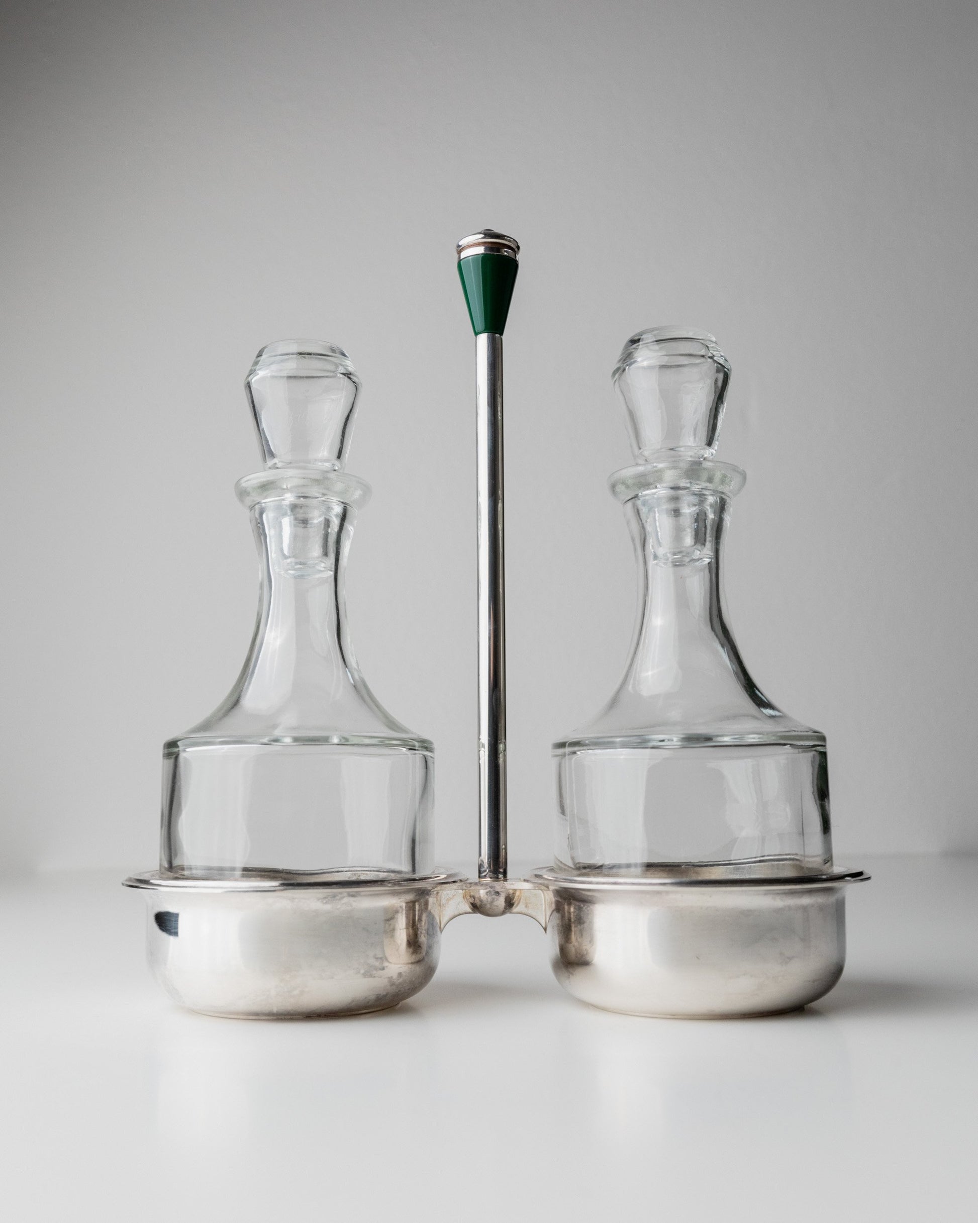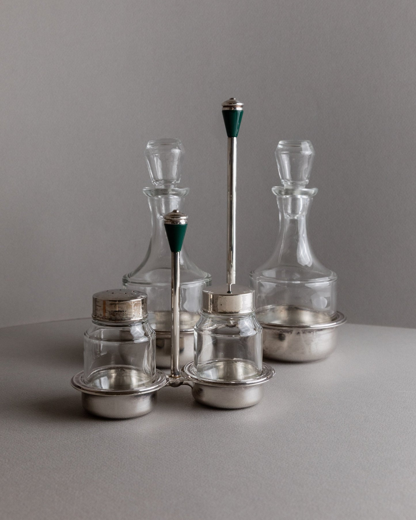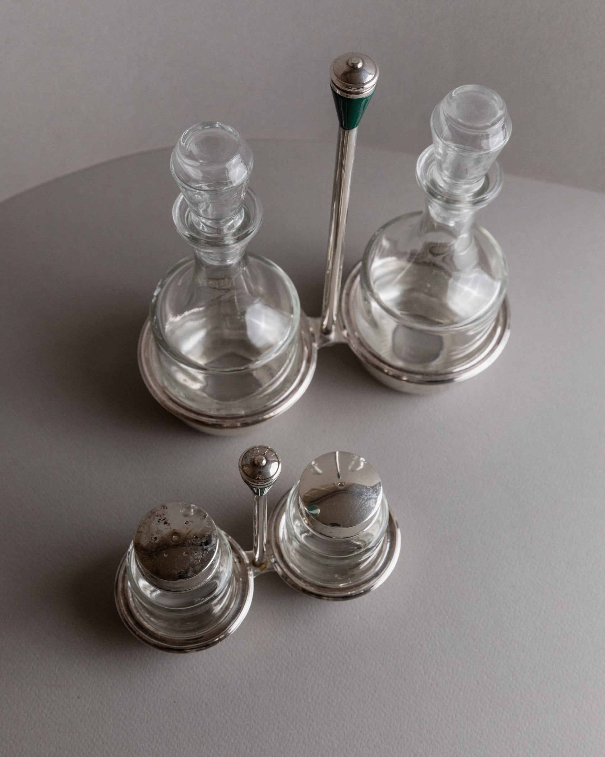 Discover the timeless design of the vintage placemat from the 1970s, which combines functionality and elegance in one. This set consists of salt and pepper shakers and vinegar and oil bottles, presented in silver-plated holders. Each piece features a green detail on the stem, making it not only practical but also a real eye-catcher on your table. A perfect gift for design lovers and an elegant addition to your table decoration.