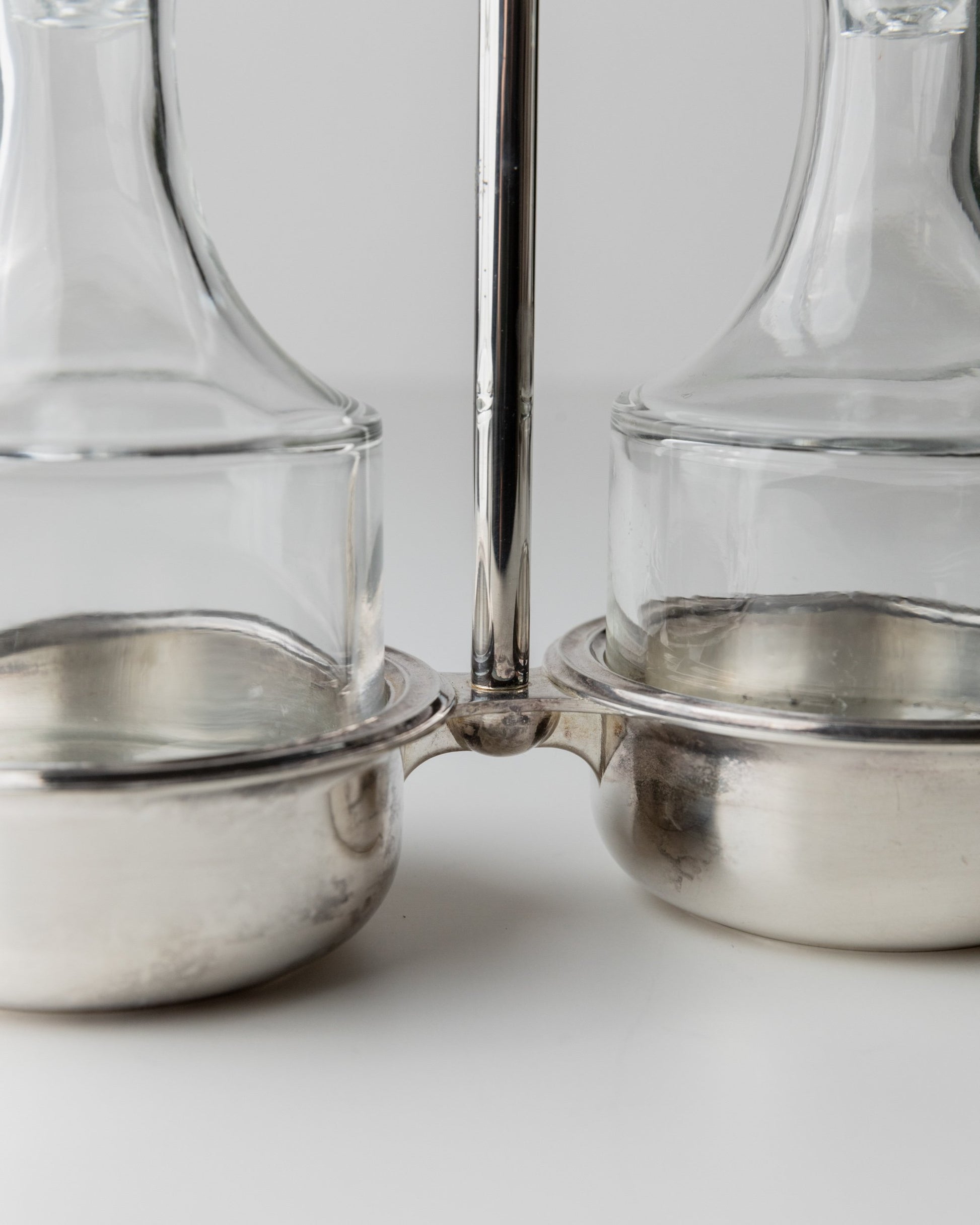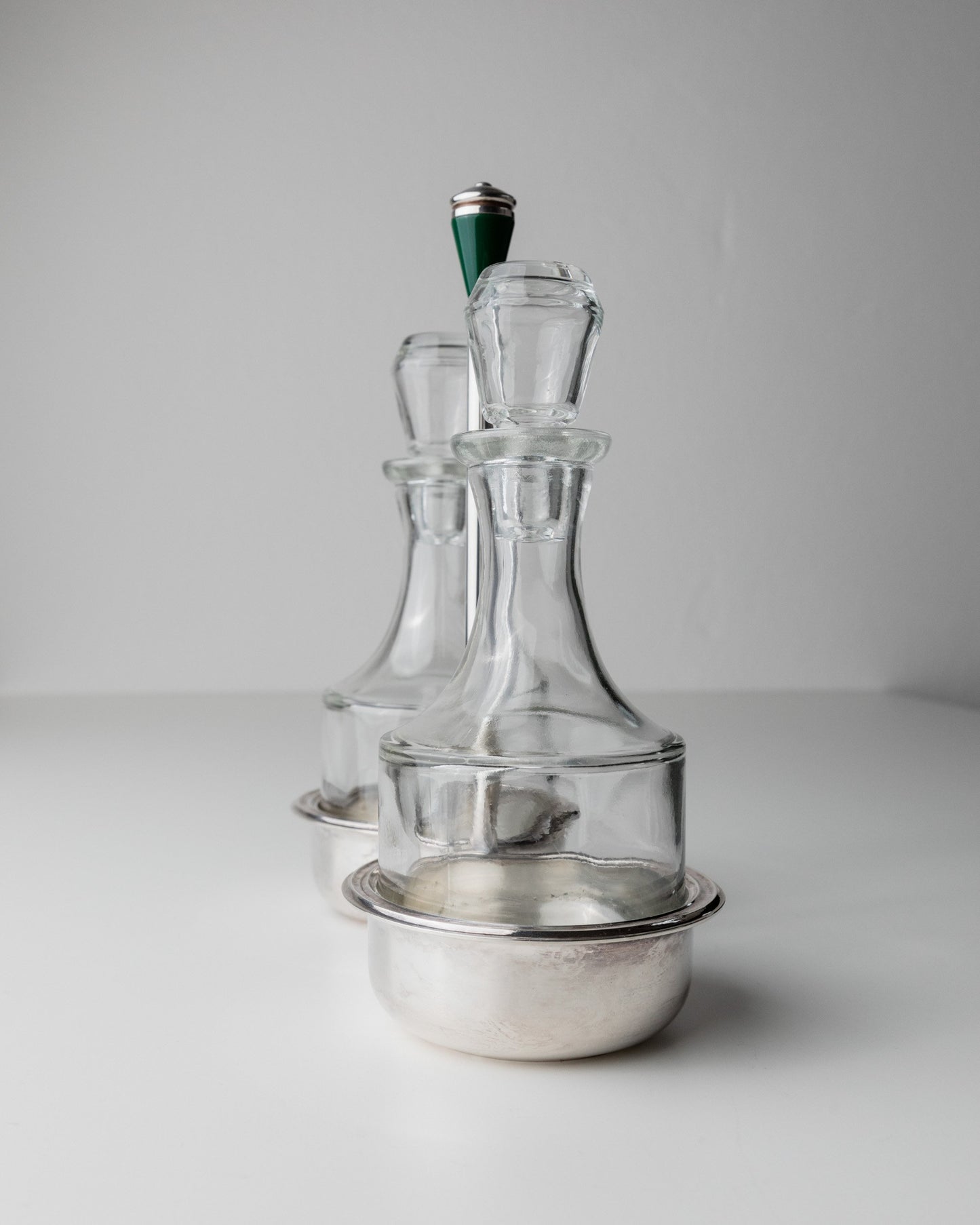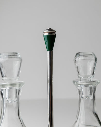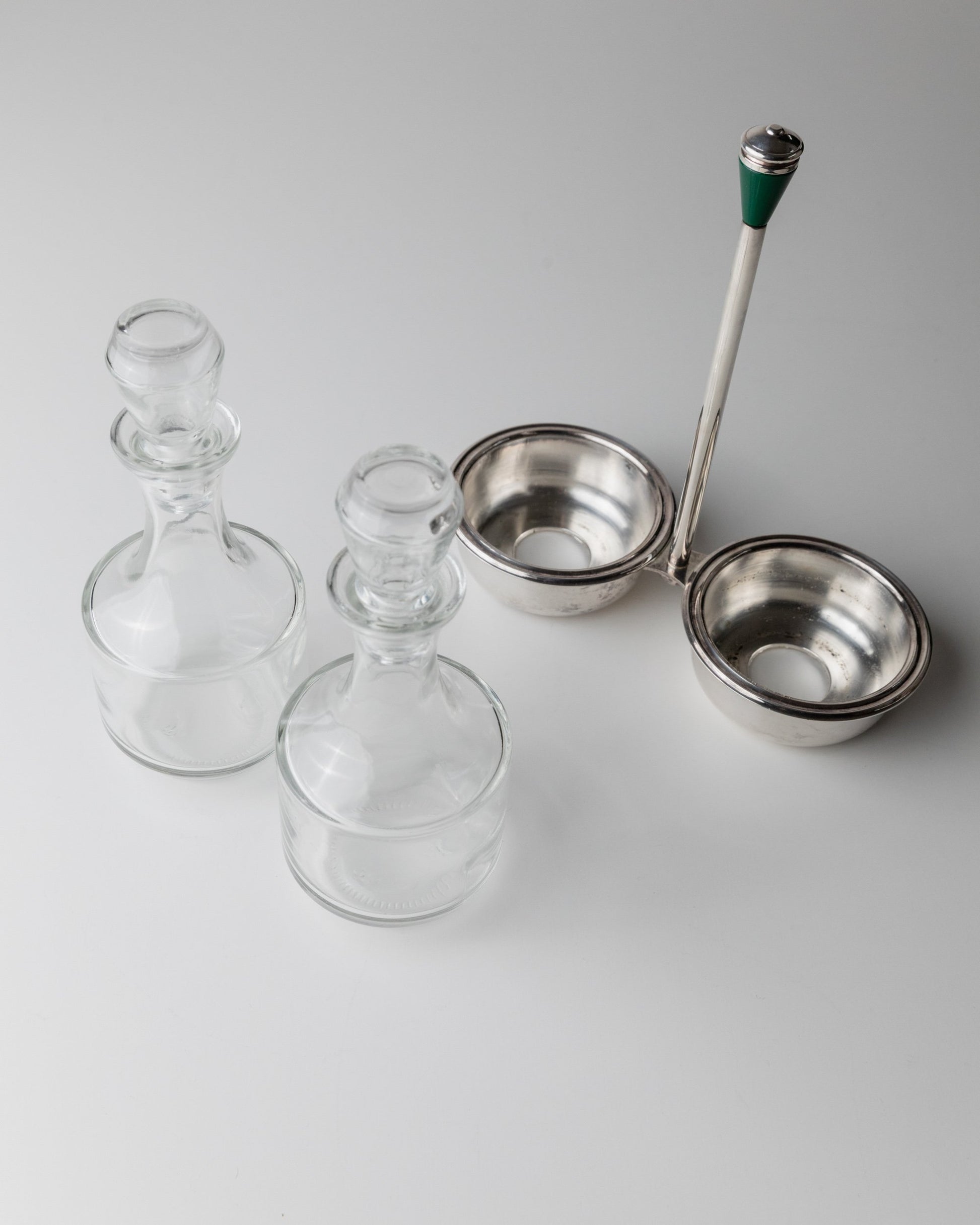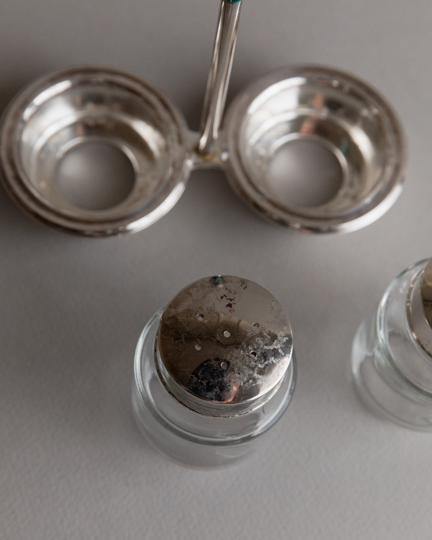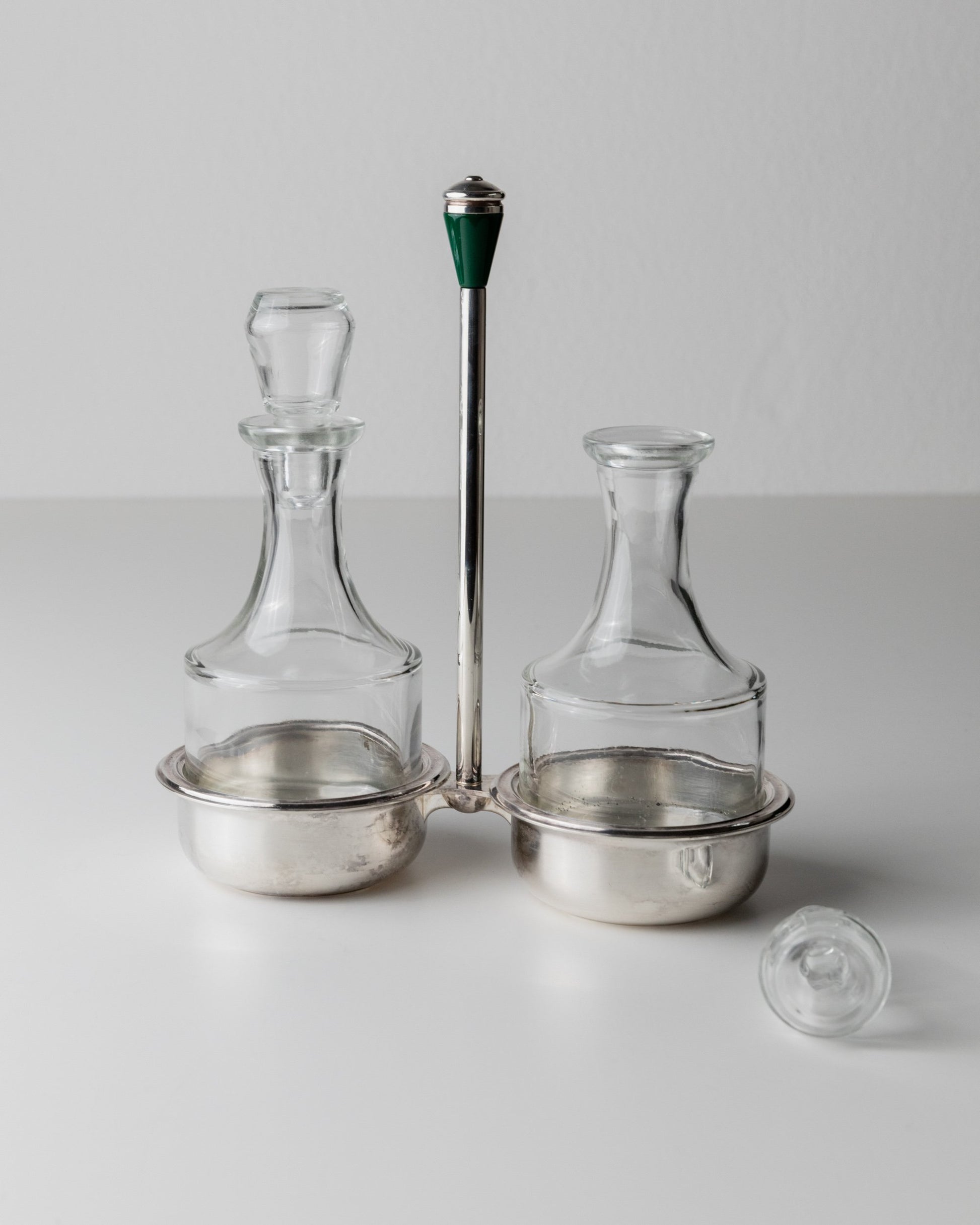 Discover the timeless design of the vintage placemat from the 1970s, which combines functionality and elegance in one. This set consists of salt and pepper shakers and vinegar and oil bottles, presented in silver-plated holders. Each piece features a green detail on the stem, making it not only practical but also a real eye-catcher on your table. A perfect gift for design lovers and an elegant addition to your table decoration.