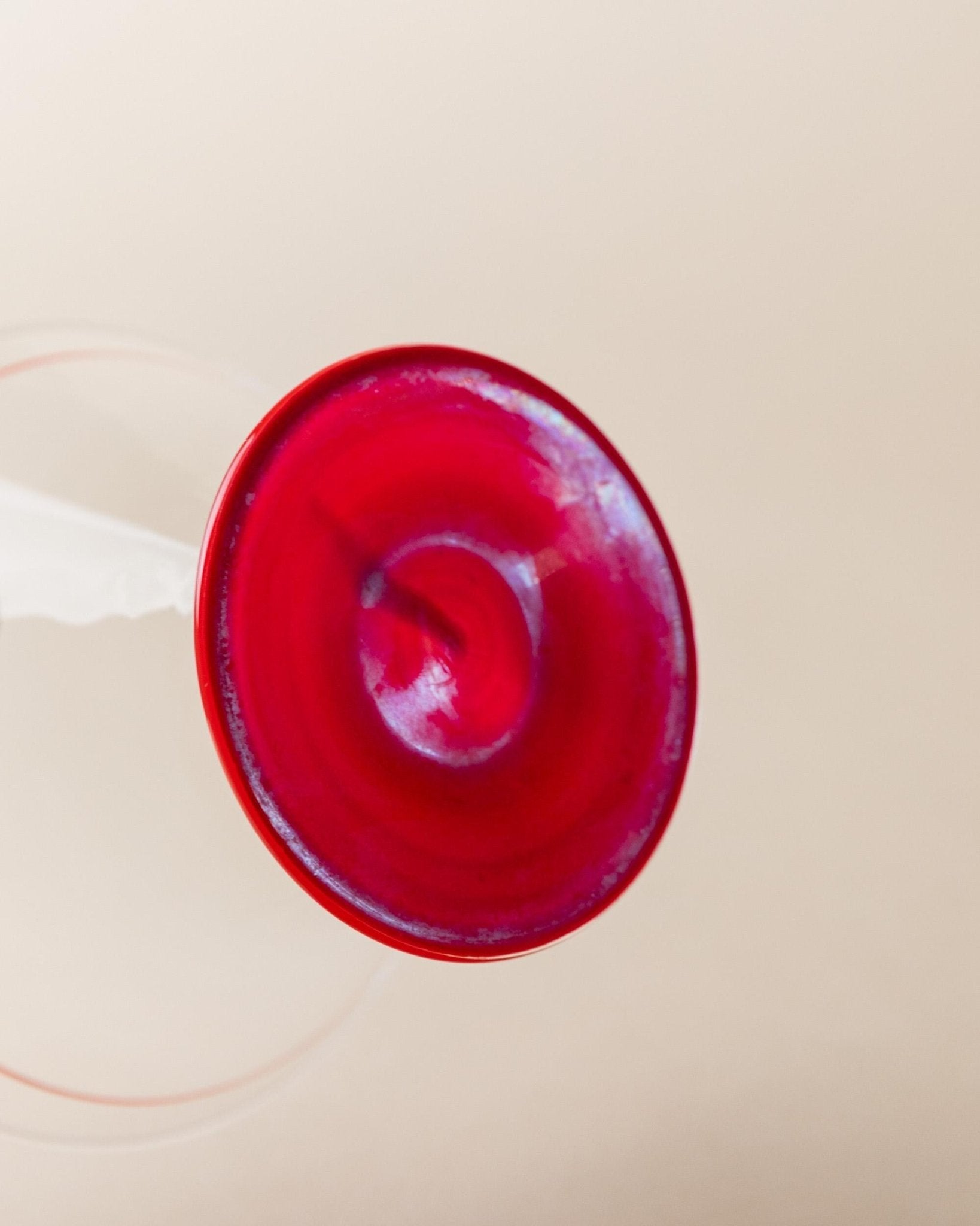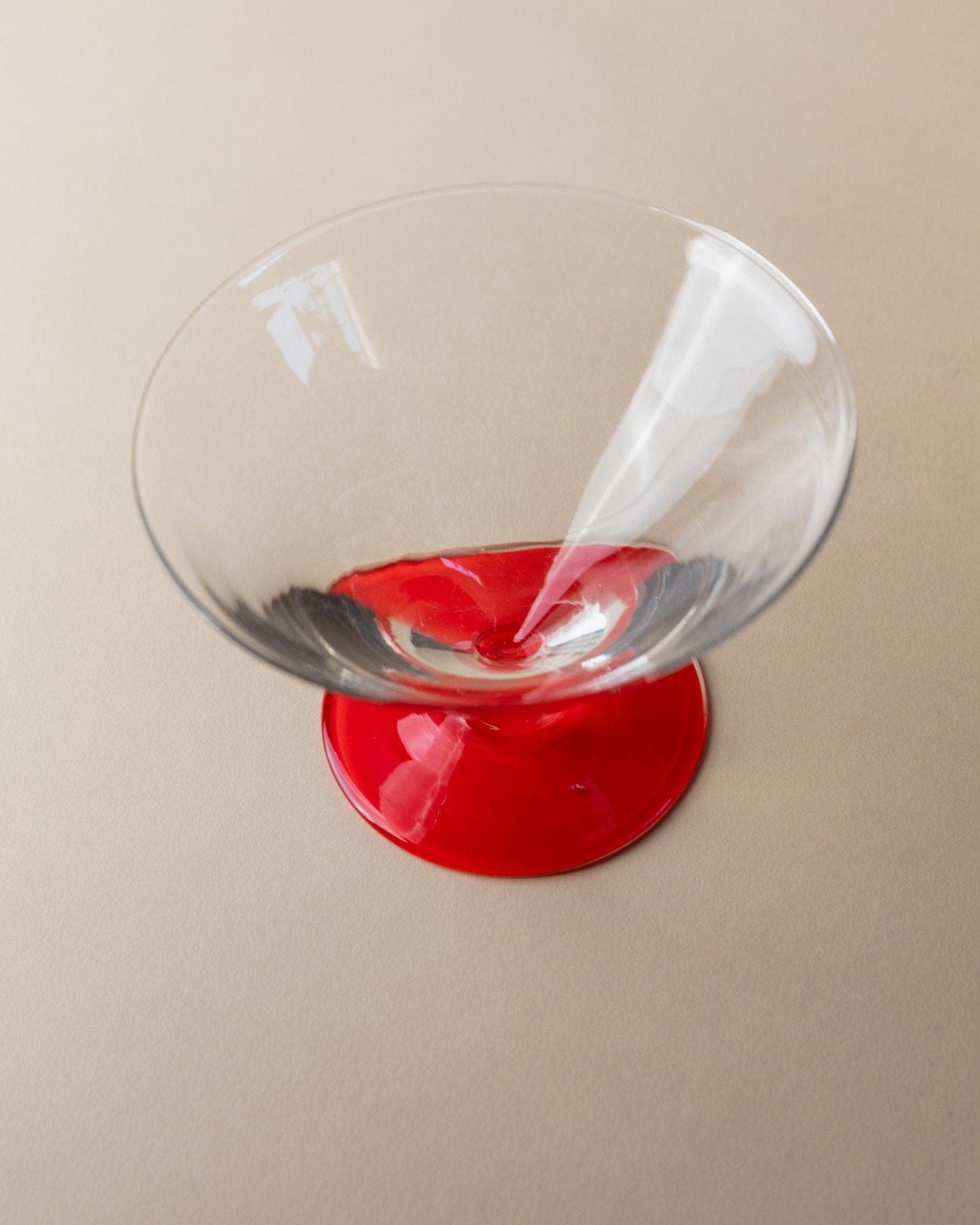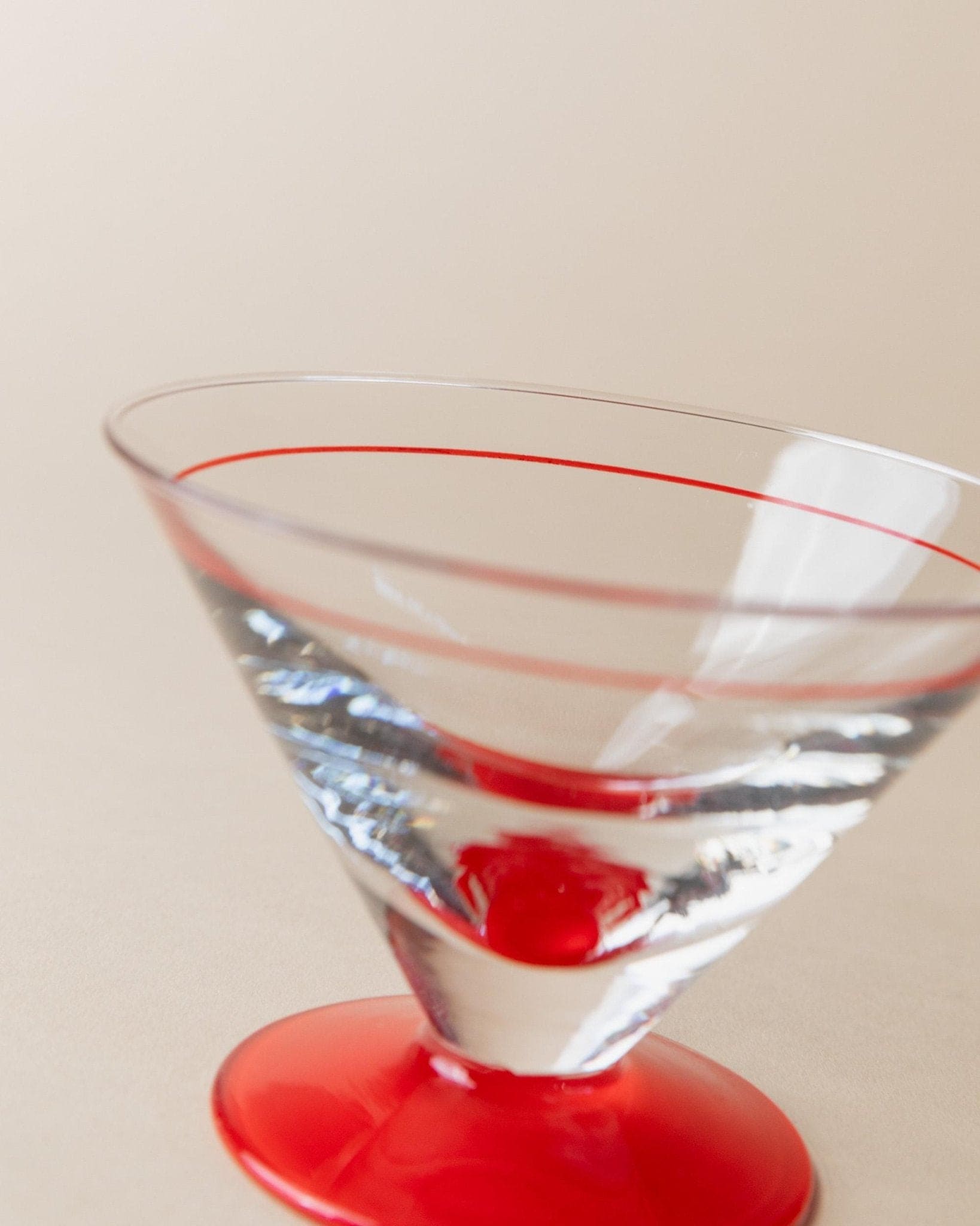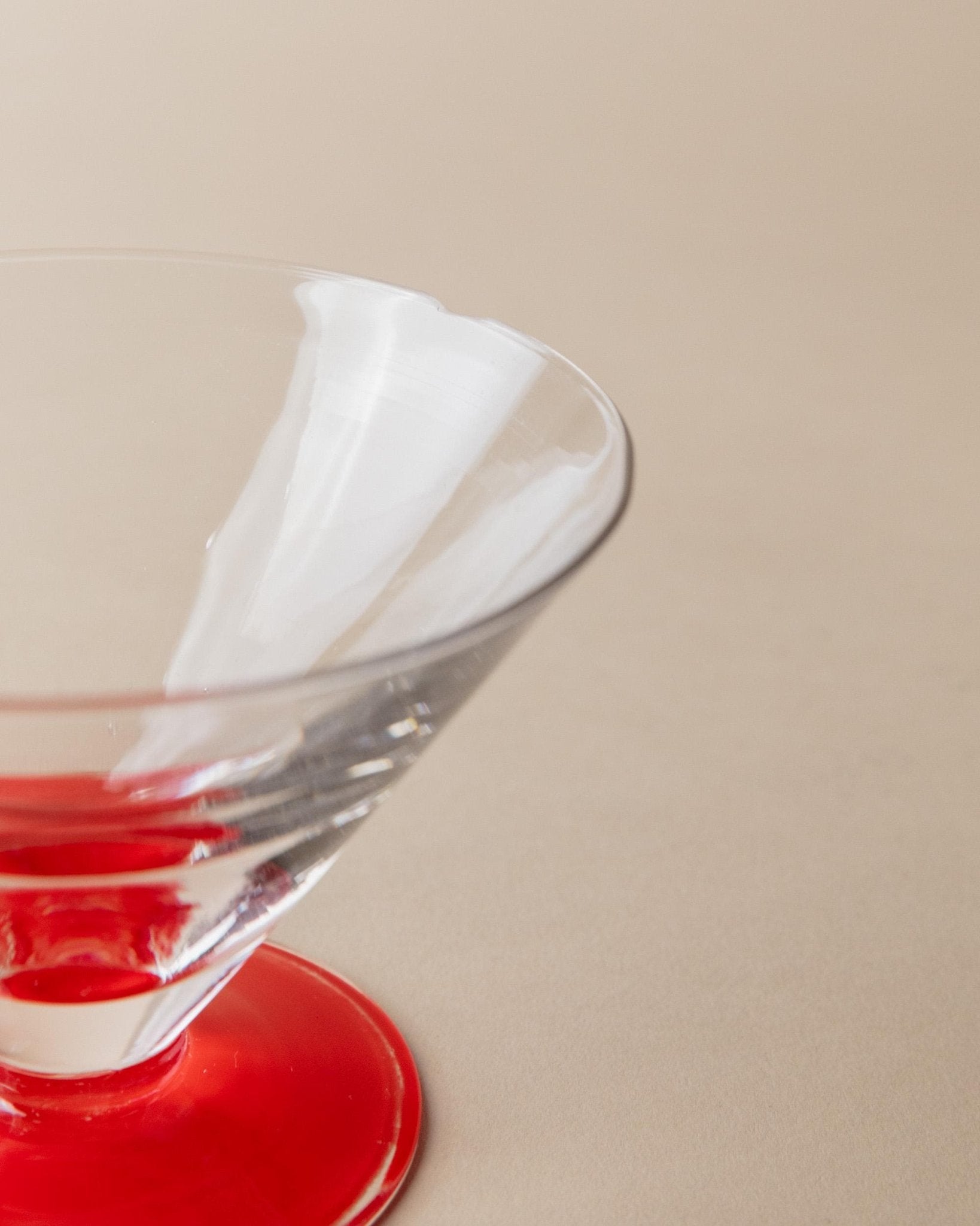 Discover an extraordinary set of six vintage drinking glasses in the iconic postmodern Memphis style of the 1980s. The bright red color and cylindrical shape with matching red stems and bases make these glasses a real eye-catcher on any table. Two of the glasses are additionally decorated with delicate red stripes, giving the set a special retro charm. Perfect for cocktails, ice cream, or as a decorative highlight in your space-age or mid-century modern interior.