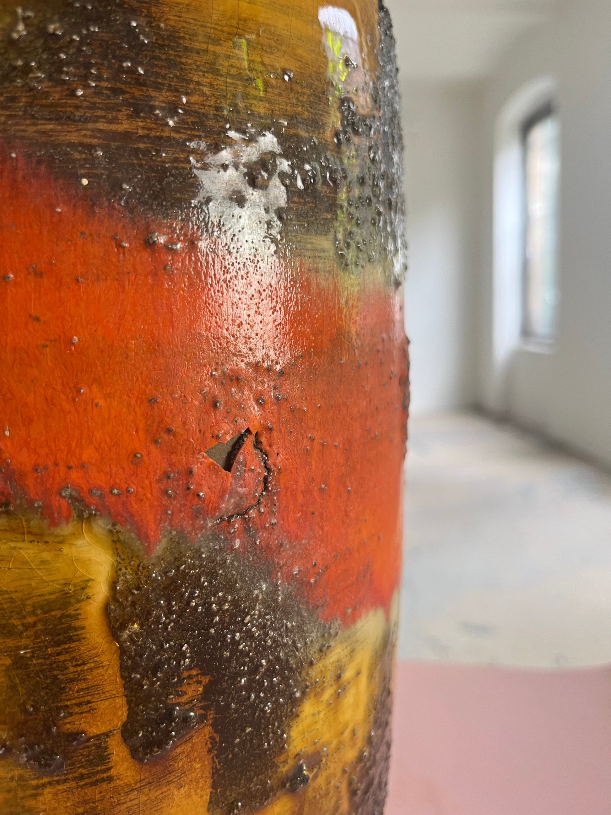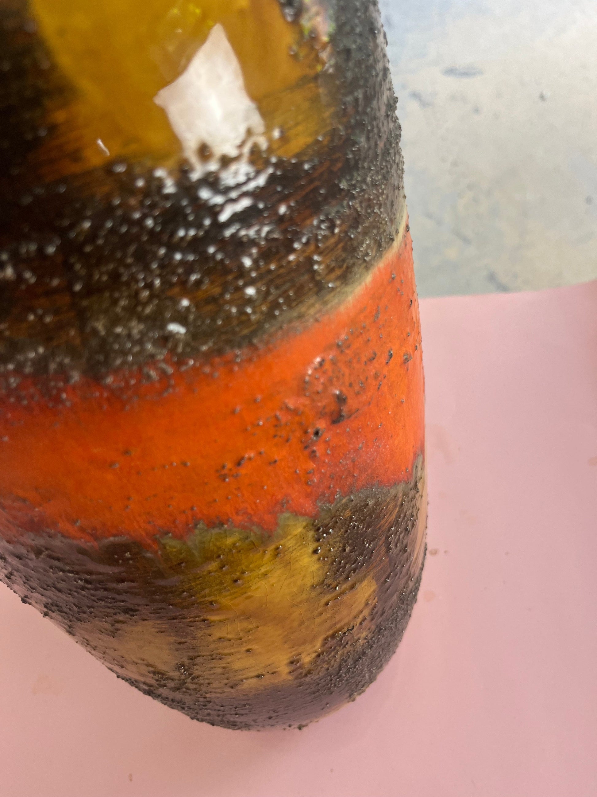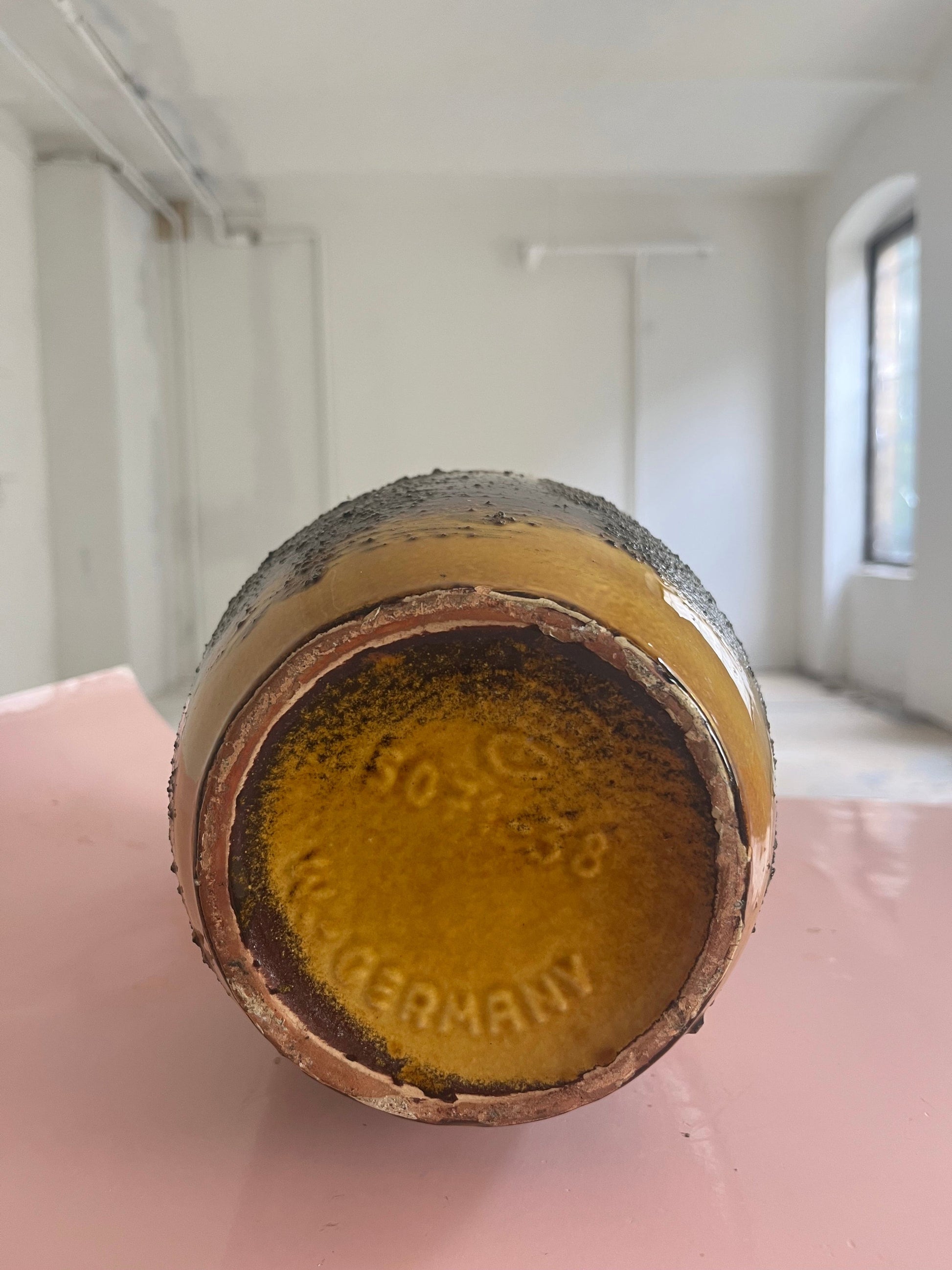 Discover the unique vintage vase 5071-38 by Carstens Keramik – a true highlight from the West German era. The iconic fat lava design in bold orange, brown, and yellow brings authentic mid-century flair to your home. The vase impresses with its striking glaze and characteristic shape, making it a coveted collector's item. Despite minor chips in two places, it remains a real eye-catcher.