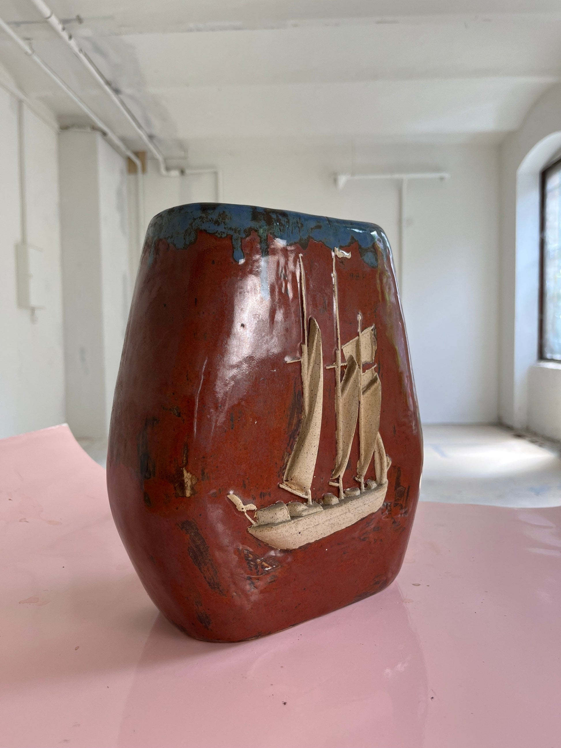 Add a touch of Scandinavian elegance to your home with this vintage "Ship" vase from Denmark. Its unique design in warm brown, beige, and blue tones makes it a stylish eye-catcher in any room. The high-quality ceramic ensures a sophisticated look and a pleasant feel. Perfect for fresh flowers or as a decorative stand-alone piece.
