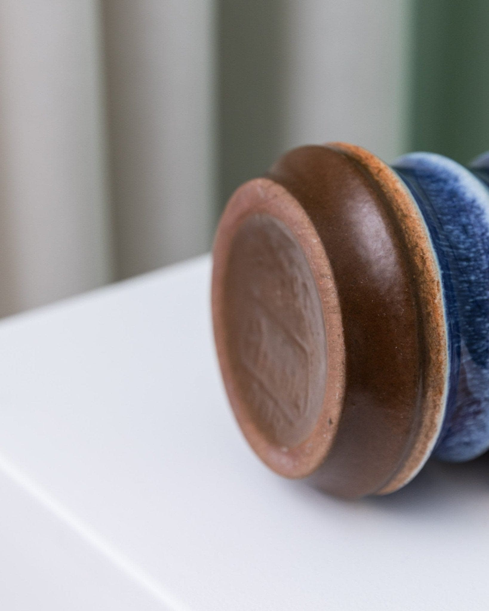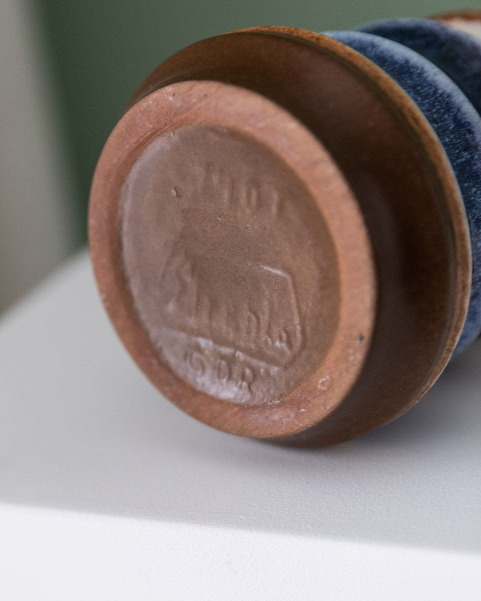 Discover the timeless elegance of the 1960s with this vintage vase from Strehla Keramik. The characteristic Mid-Century Modern design and striking blue and white striped glaze make this piece a true eye-catcher in any room. Combining Space Age aesthetics with excellent quality, the vase is an authentic collector's item for lovers of vintage style. Strehla, known for its high-quality ceramics, stands for excellent craftsmanship and innovative designs from the GDR era.