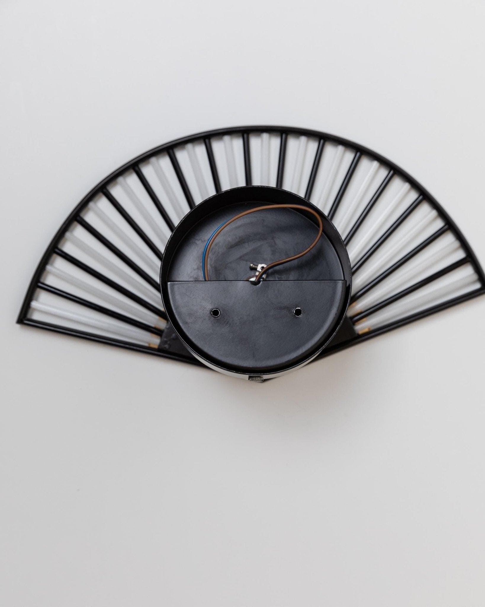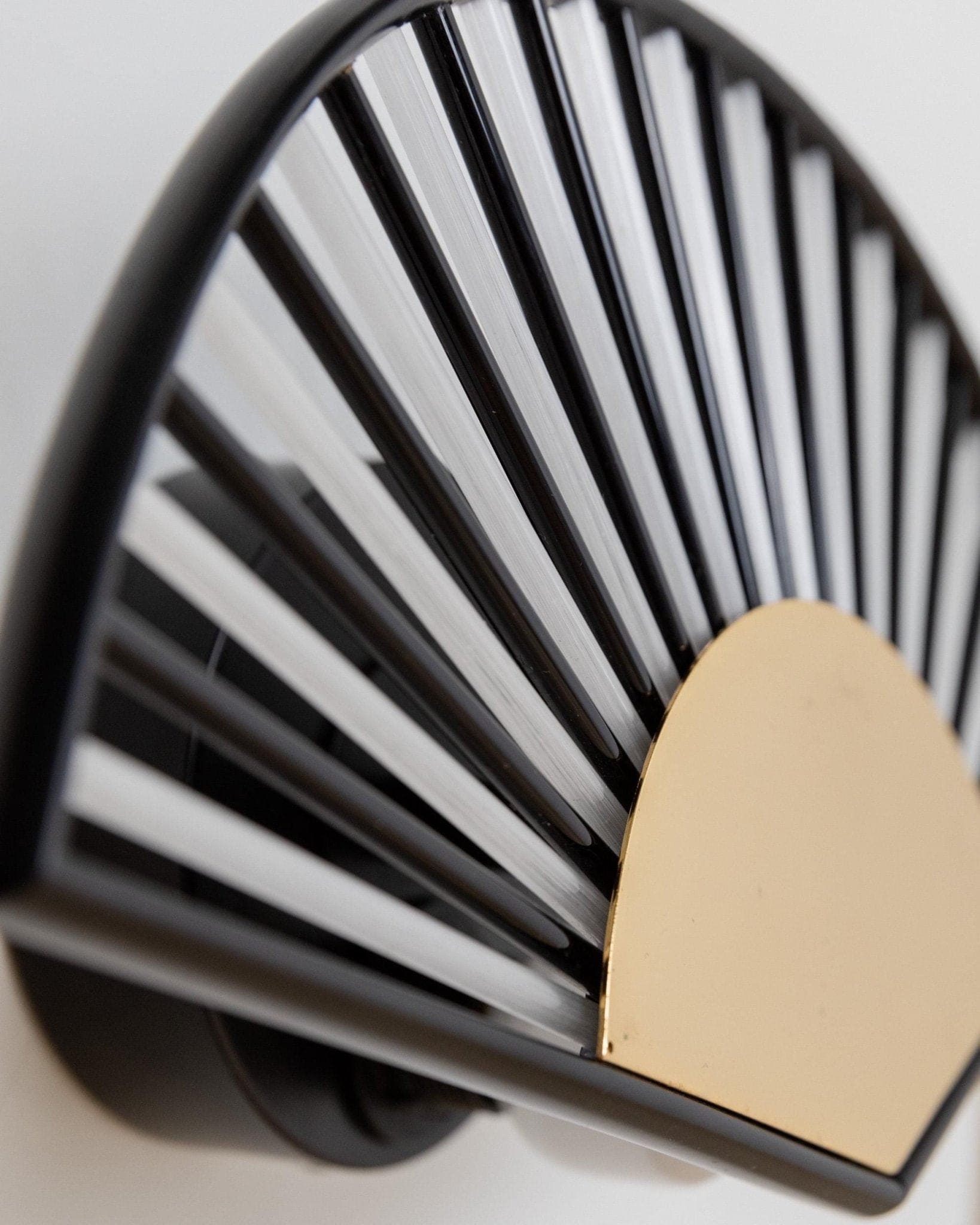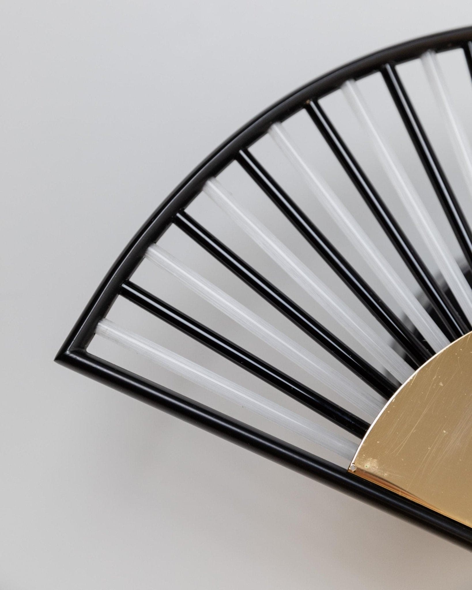 Experience the glamour of the 1980s with this vintage fan-shaped wall sconce, which embodies the best of Hollywood Regency style. The combination of black and white Murano glass tubes and gold-colored metal creates a mesmerizing play of light and adds a luxurious, sculptural touch to any room. This mid-century modern Space Age lamp is not only a functional light source but also a true design statement—ideal for enhancing your home with Italian glass art or as an exceptional gift. The high-quality craftsmanship and iconic design make it a sought-after collector's item.