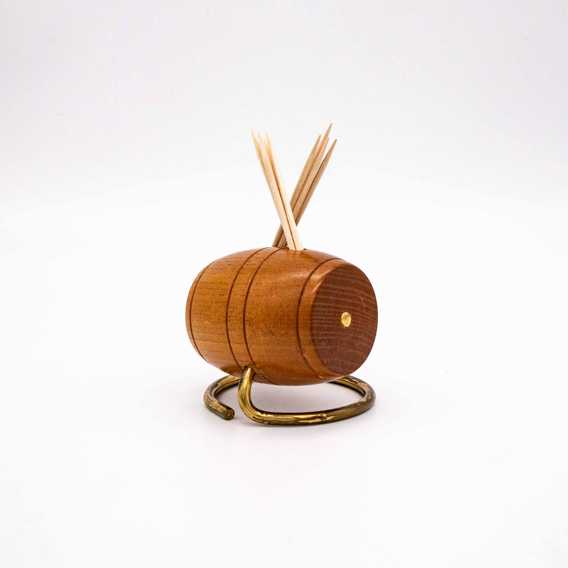 Discover the charm of the 1950s with our vintage barrel-shaped toothpick holder. This exquisite piece is a must-have for lovers of mid-century modern design and adds an elegant touch to any table. The curved brass fittings and Carl Auböck-style design make this toothpick holder a stylish eye-catcher. Perfect for anyone who values stylish details and wants to enhance their table setting.