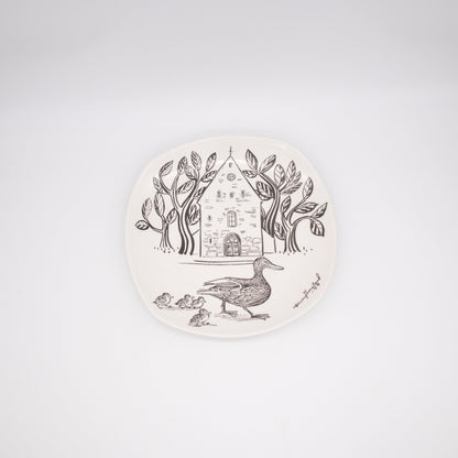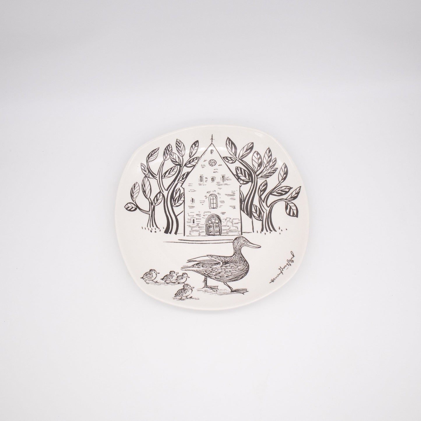 This Norwegian wall plate was designed by Henry Imsland for Figgjo Norway in 1977. It depicts a village church in Stavanger with a duck and four little chicks. The plate is in the collection of the Norwegian Graphic Museum.