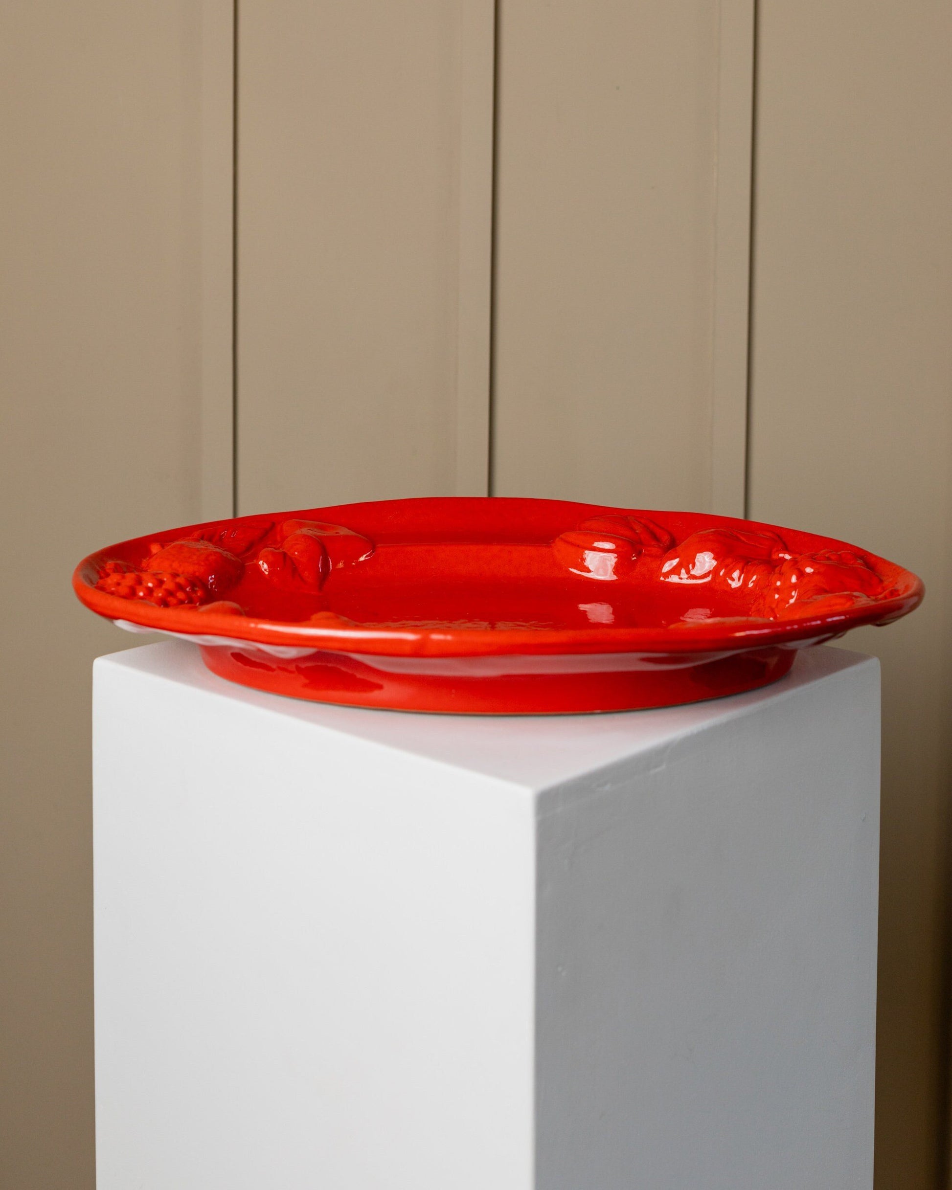 Experience the nostalgic flair of the 1980s with our unique handmade vintage ceramic plate! This oval fruit plate in bright red with charming fruit relief and glossy glaze adds a special touch to any table. Versatile as a salad bowl or fruit platter, this handmade piece of Italian craftsmanship brings warmth and character to your home. Enjoy free worldwide shipping now!
