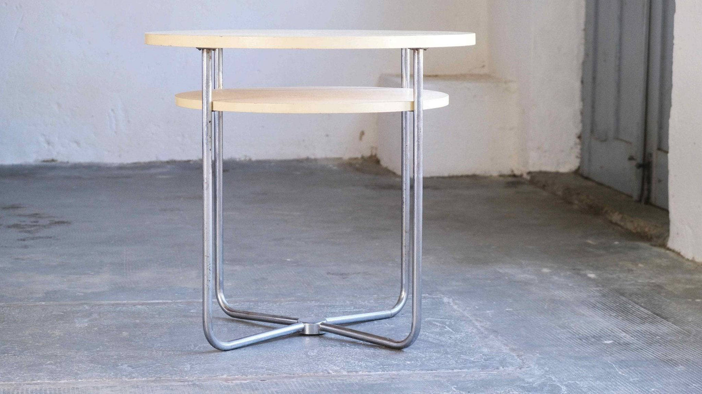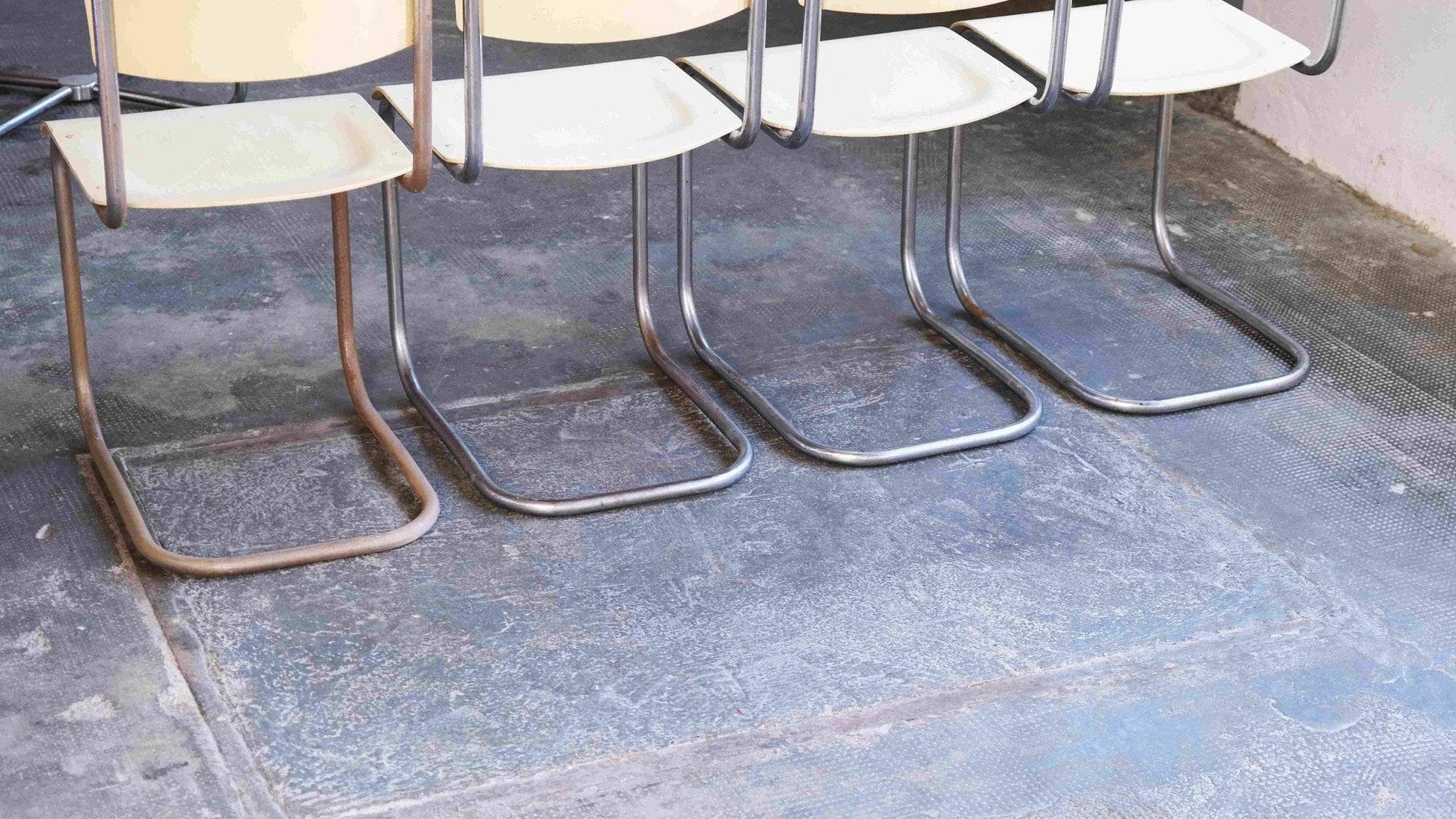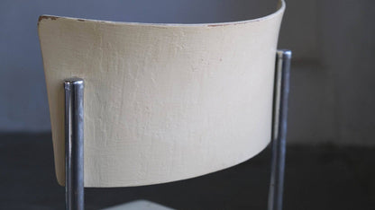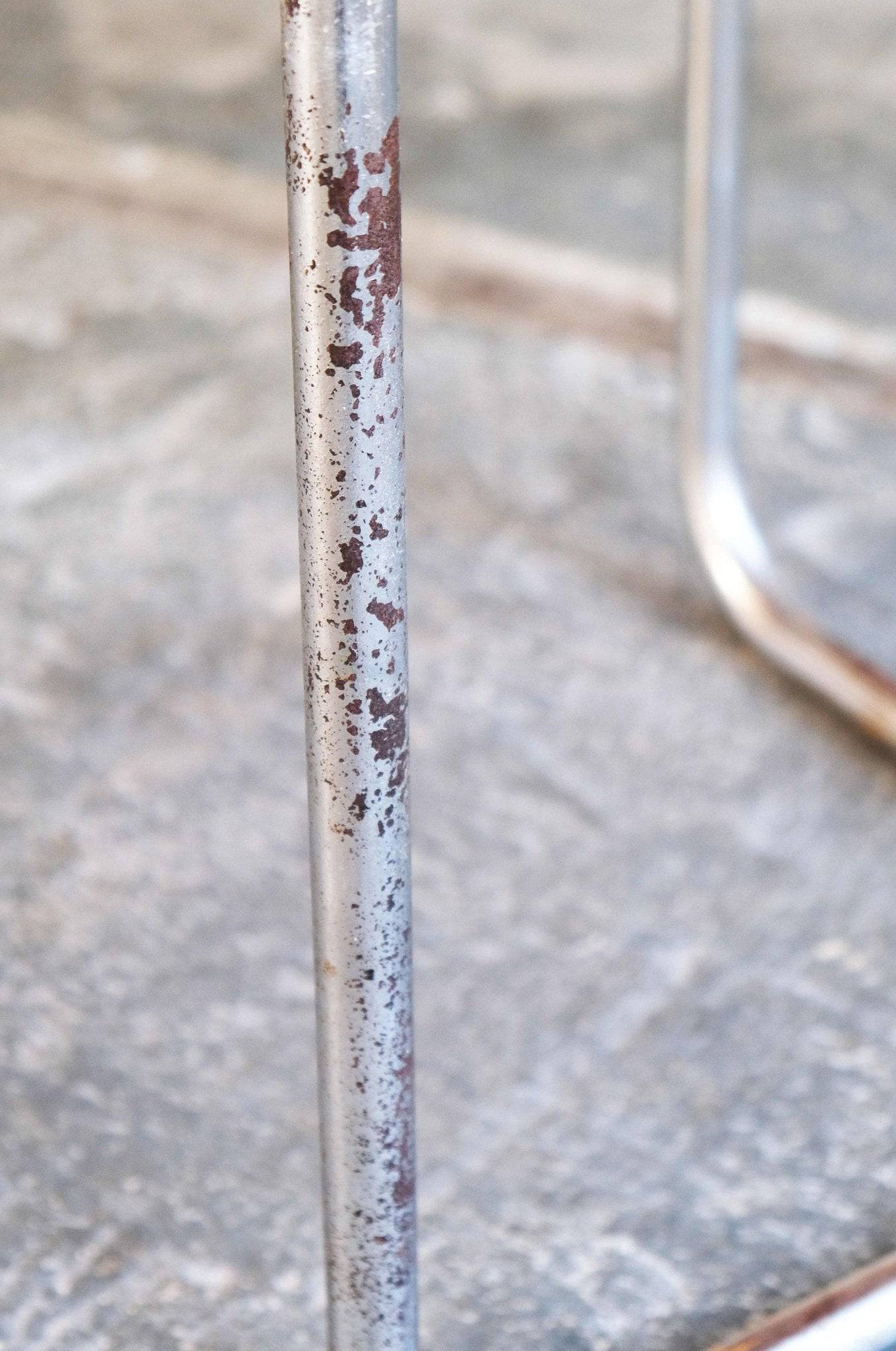 Tous les éléments en bois ont été peints en beige de manière artisanale dans le passé et auraient donc besoin d'être rénovés. Le chromage de la table présente une certaine corrosion, mais présente dans l'ensemble un bel éclat. Trois des quatre chaises ont également un chromage acceptable ; Cependant, une chaise est gravement endommagée dans la zone inférieure et doit être rechromée.