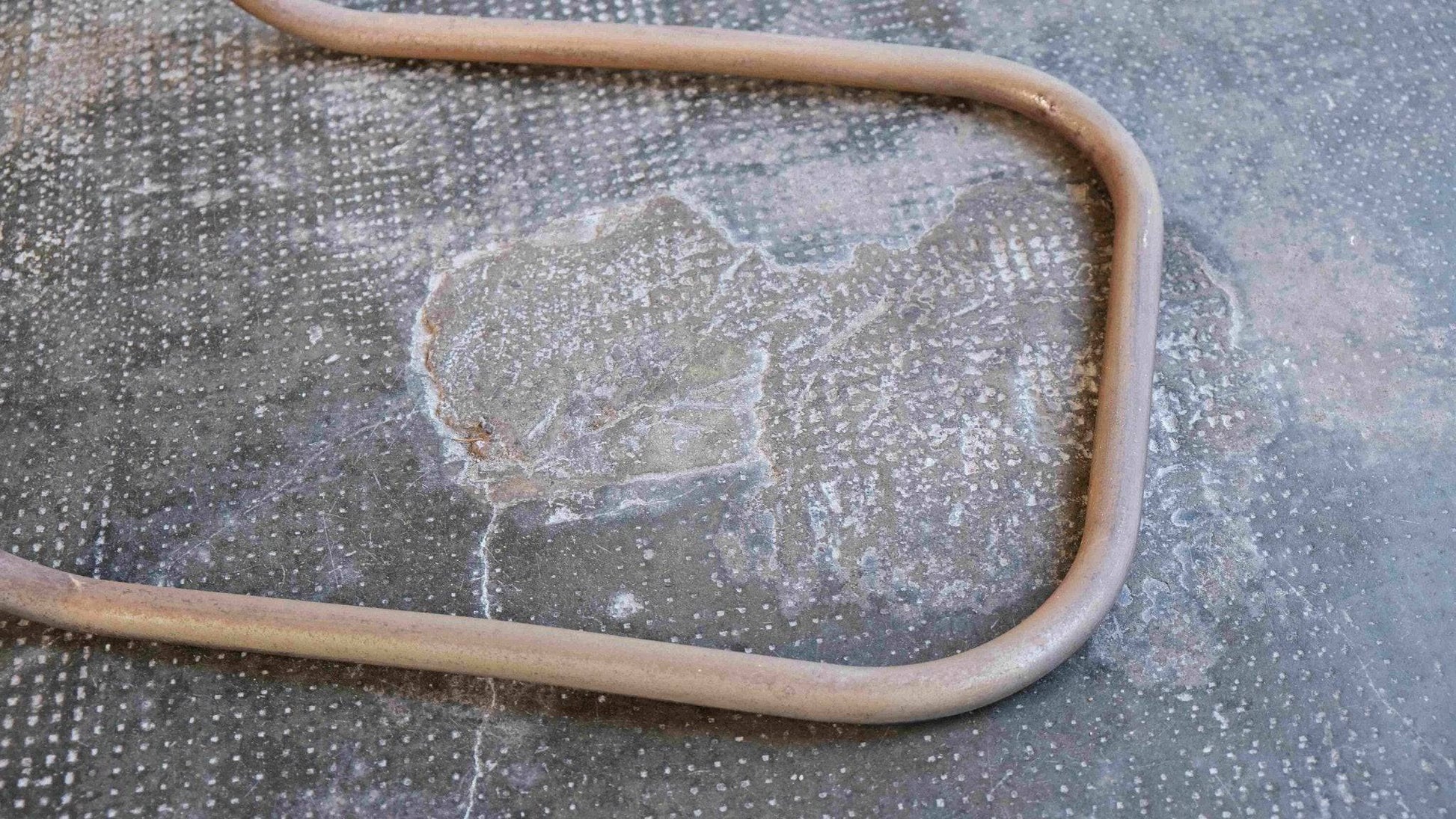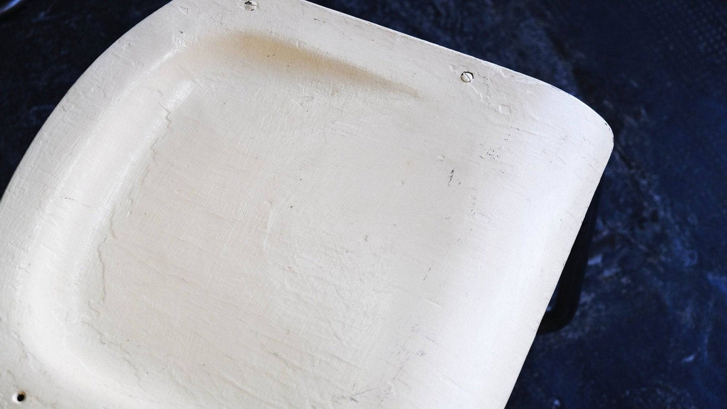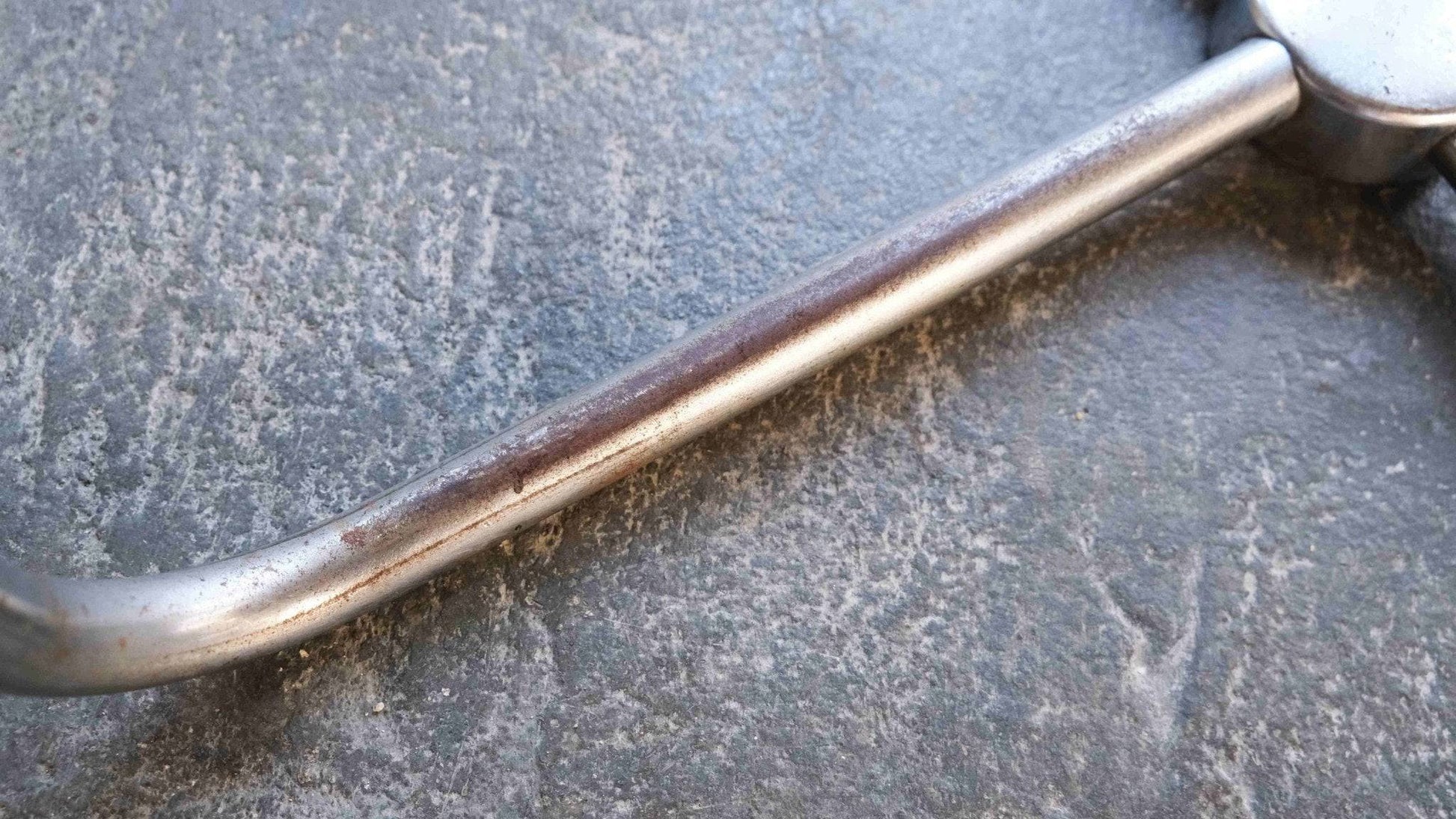 Tous les éléments en bois ont été peints en beige de manière artisanale dans le passé et auraient donc besoin d'être rénovés. Le chromage de la table présente une certaine corrosion, mais présente dans l'ensemble un bel éclat. Trois des quatre chaises ont également un chromage acceptable ; Cependant, une chaise est gravement endommagée dans la zone inférieure et doit être rechromée.