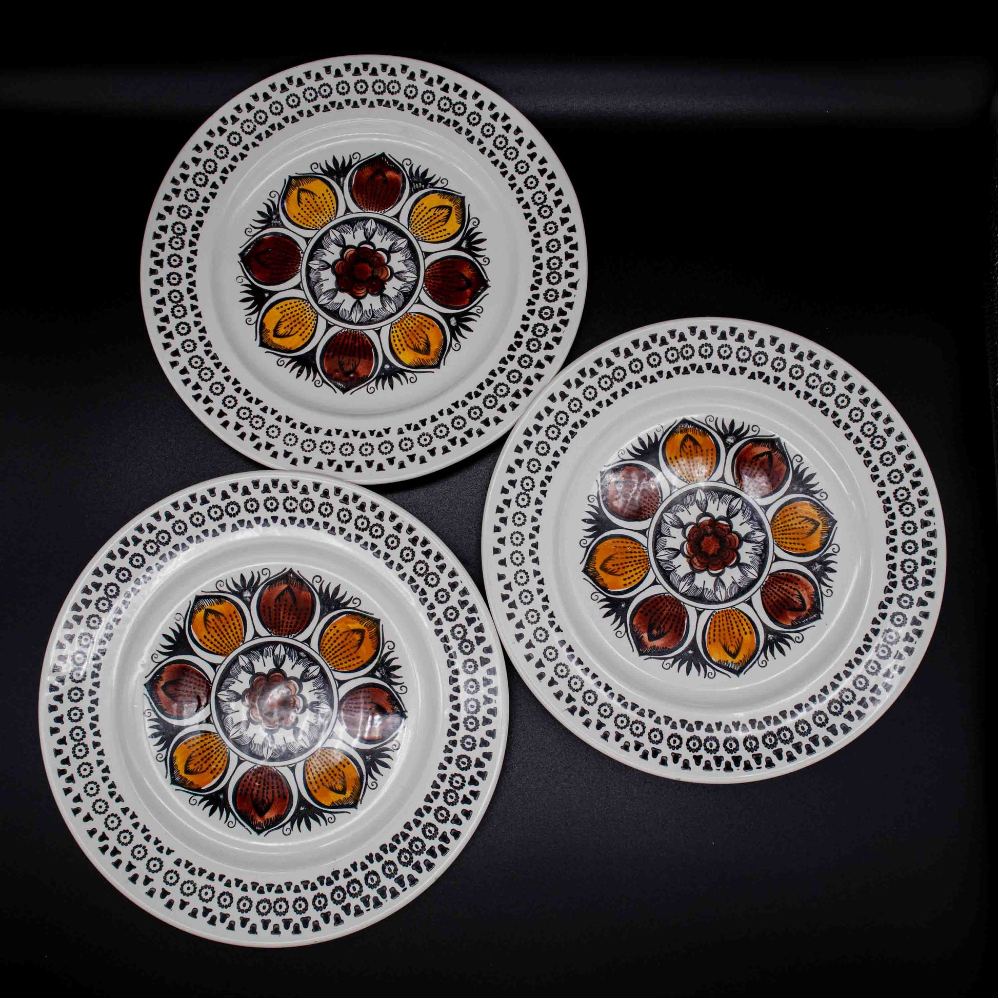 Le bel ensemble se compose de 6 assiettes plates des années 1960. Il a été produit par Broadhurst en Angleterre. Le design est de Kathie Winkle et s'appelle Octobre.