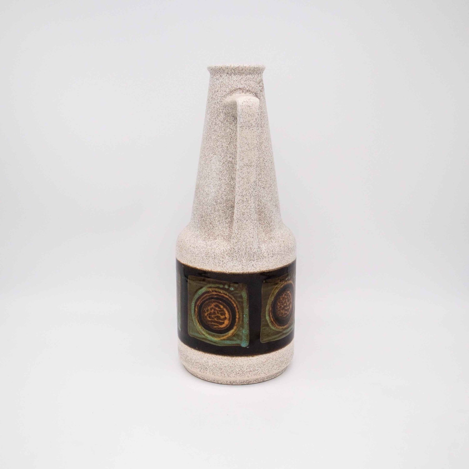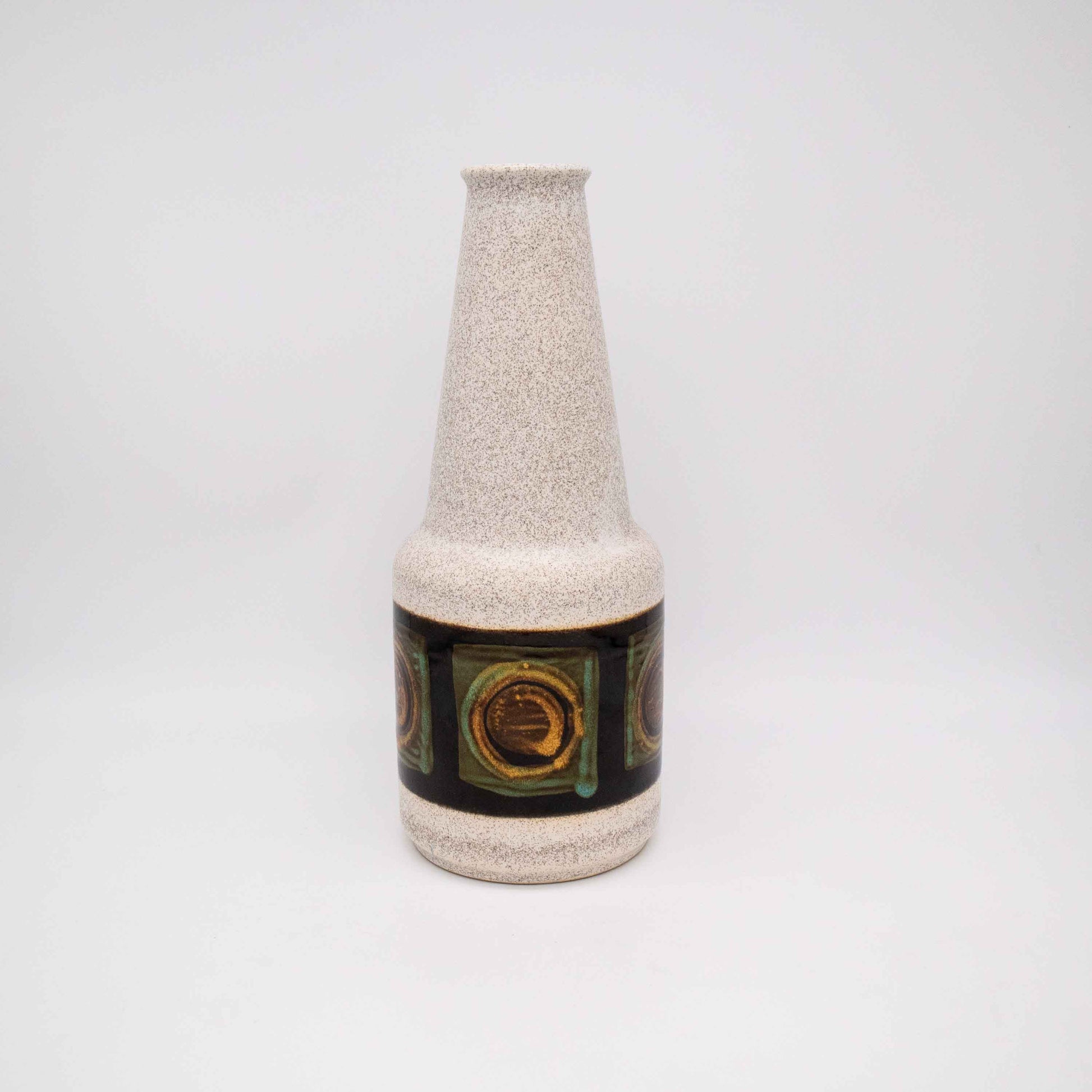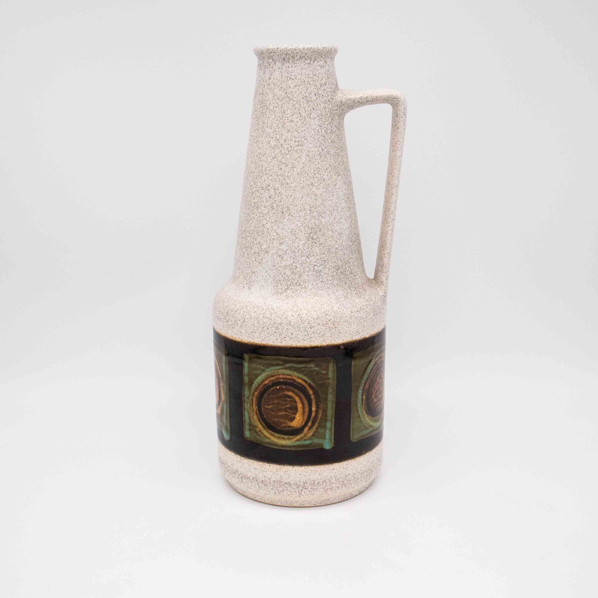 Ce vase de Dümler et Breiden impressionne par son vernis moucheté et sa décoration circulaire peinte à la main en forme de bande. Le vase est jaune à l'intérieur.