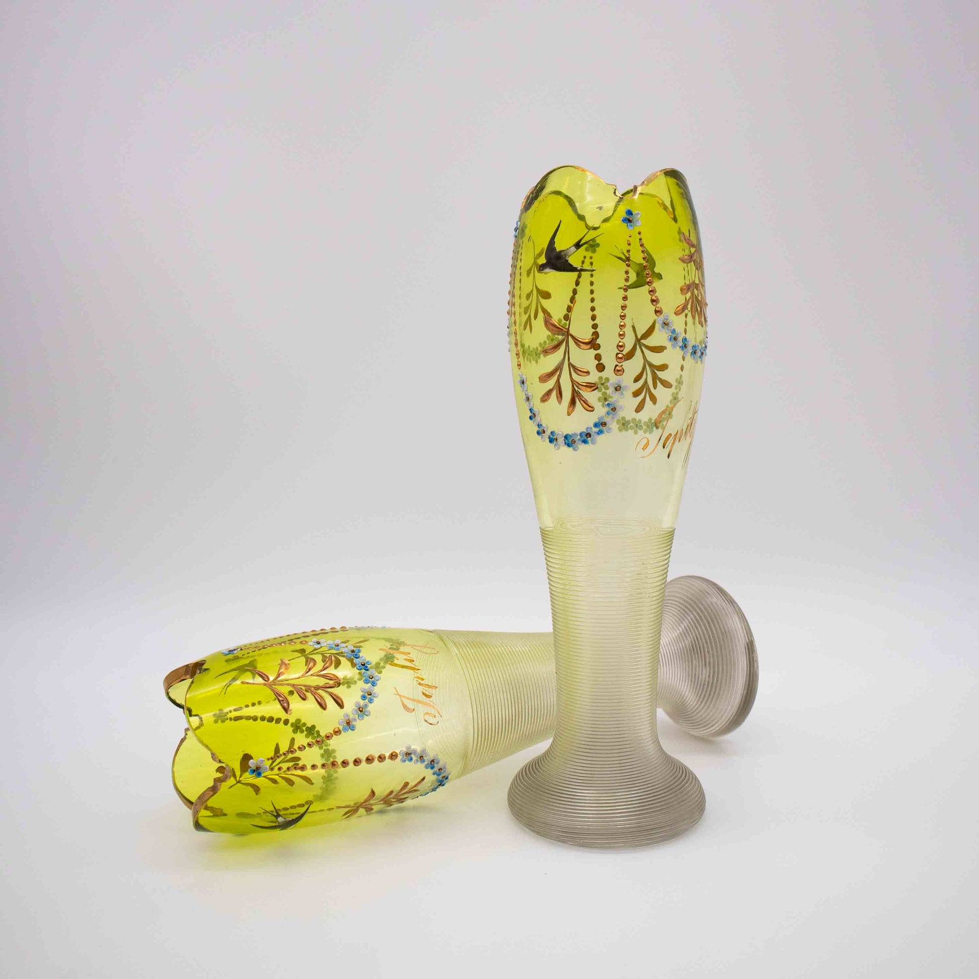 La paire de lunettes est un souvenir de Teplitz. Ils y étaient Fabriqué à la main et peint vers 1890 . Les verres sont très bien conservés et sont de véritables objets de collection avec leur forme passionnante, leur peinture en or et émail et leur design unique.