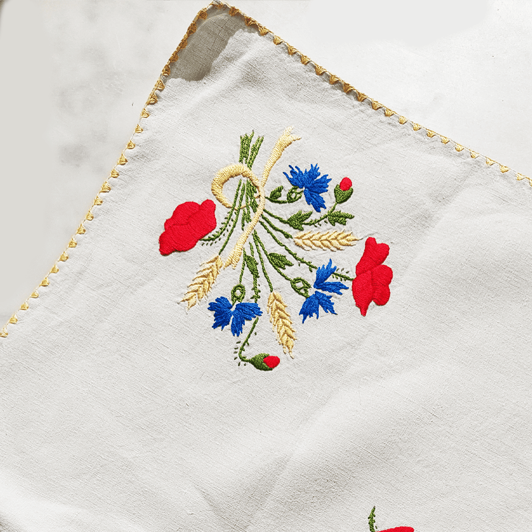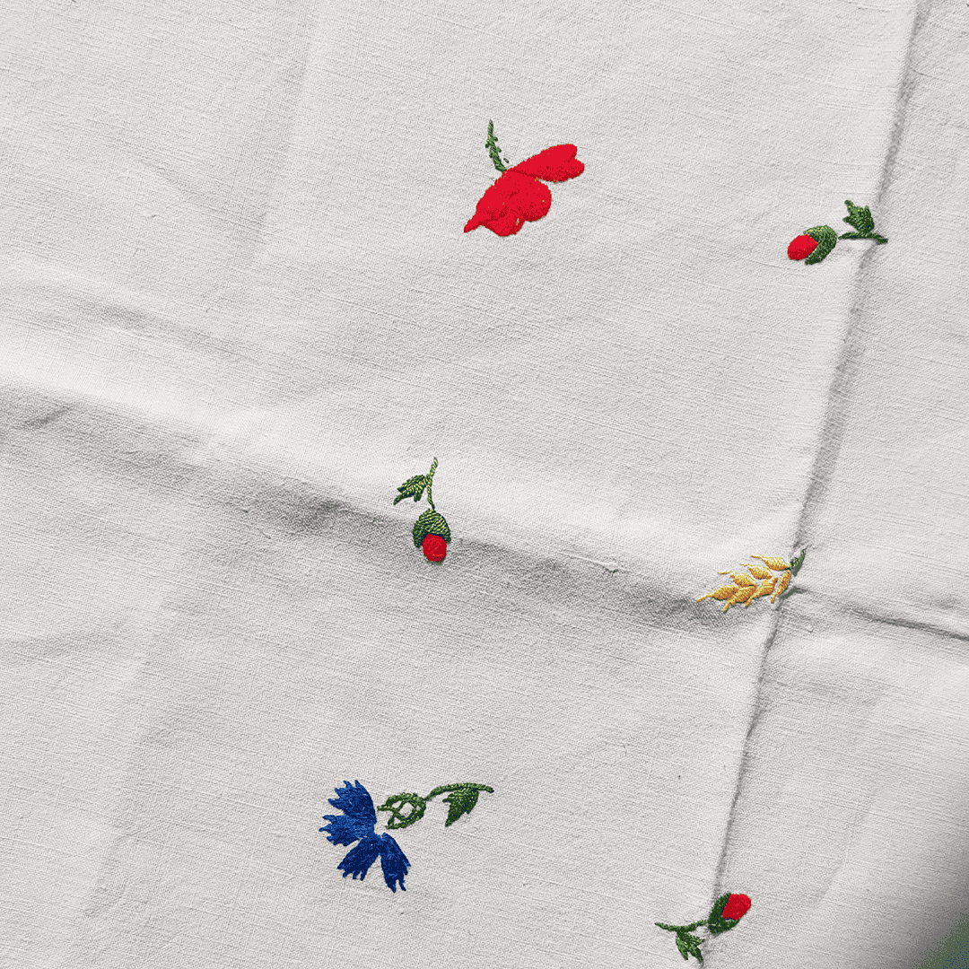 Petite nappe fleurie en coton épais aspect lin, décorée de motifs floraux brodés. Cette nappe est un article d'occasion qui a déjà été utilisé et apportera une touche d'élégance à votre intérieur. Fini en blanc classique, il s'intègre parfaitement à différents styles d'intérieur.