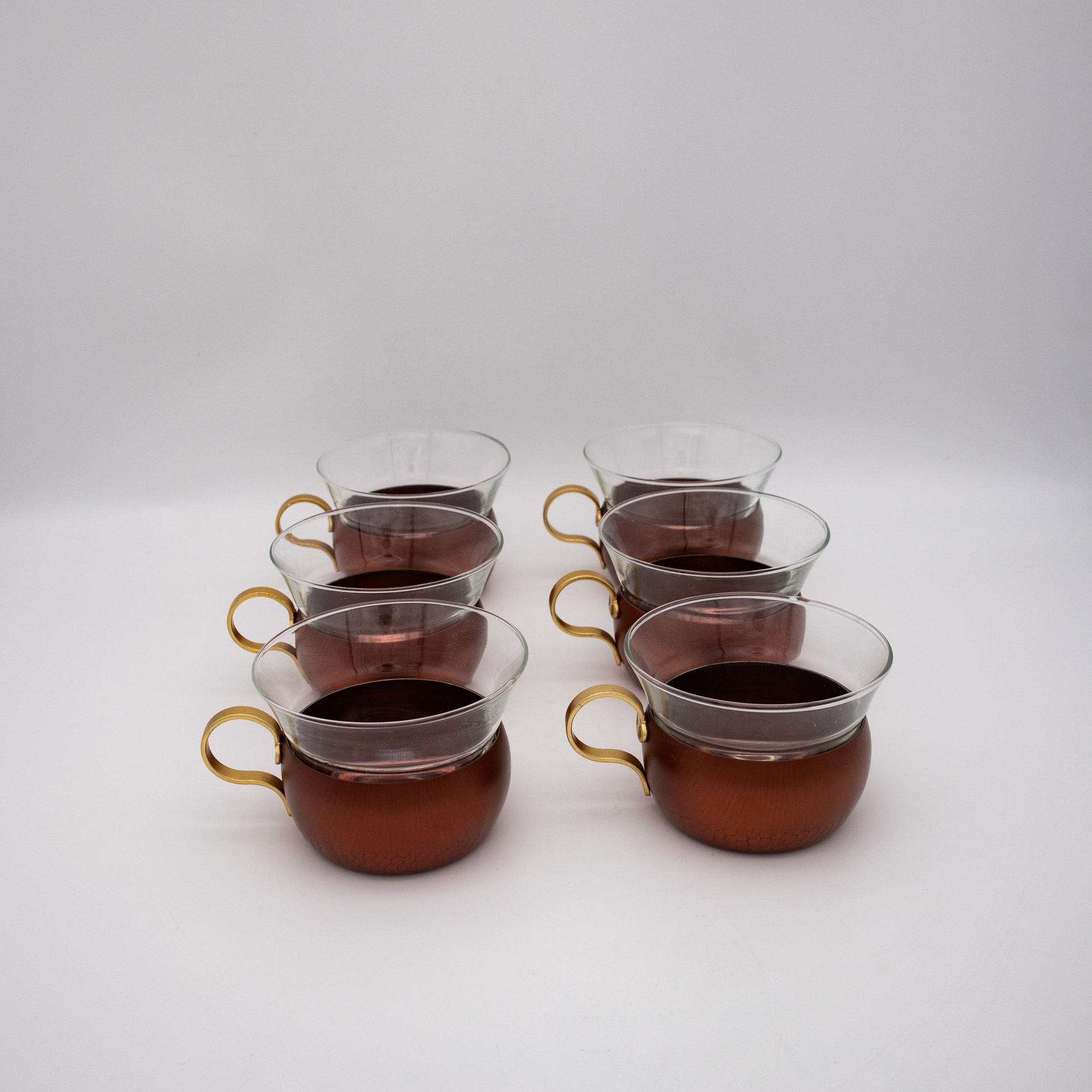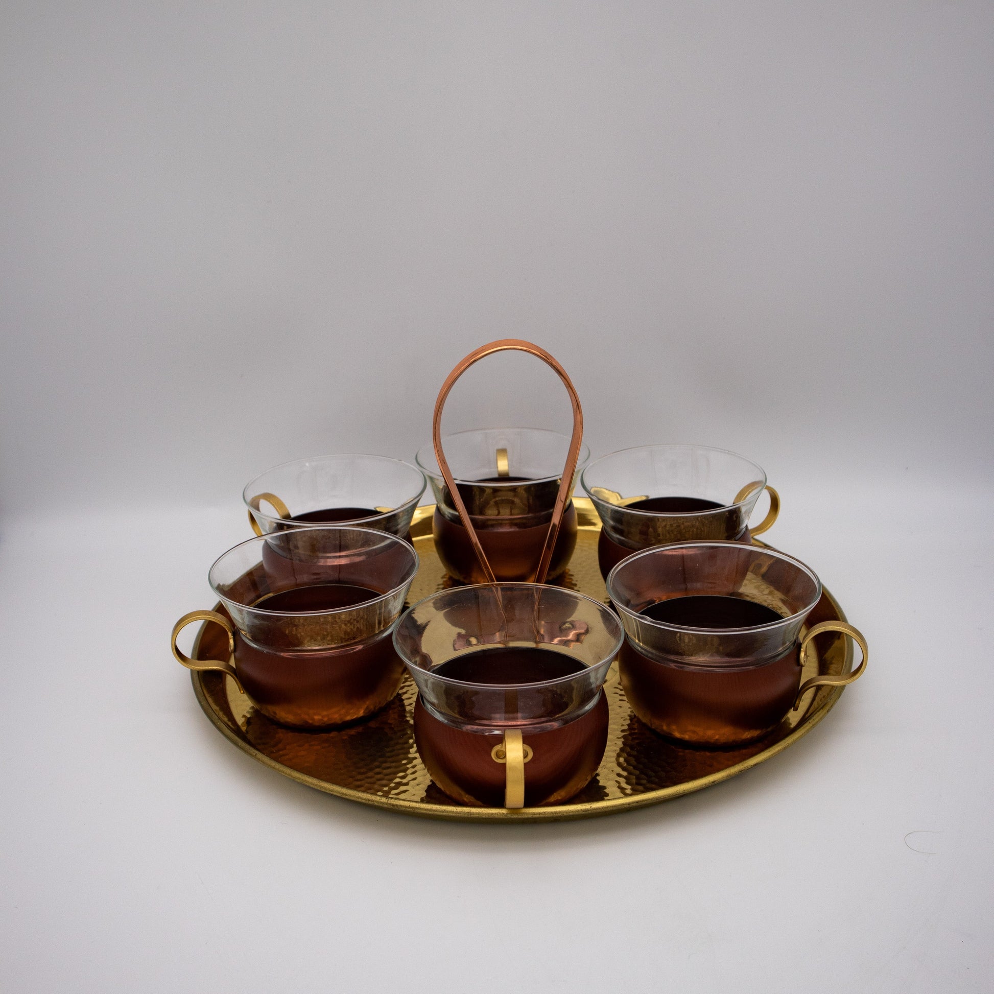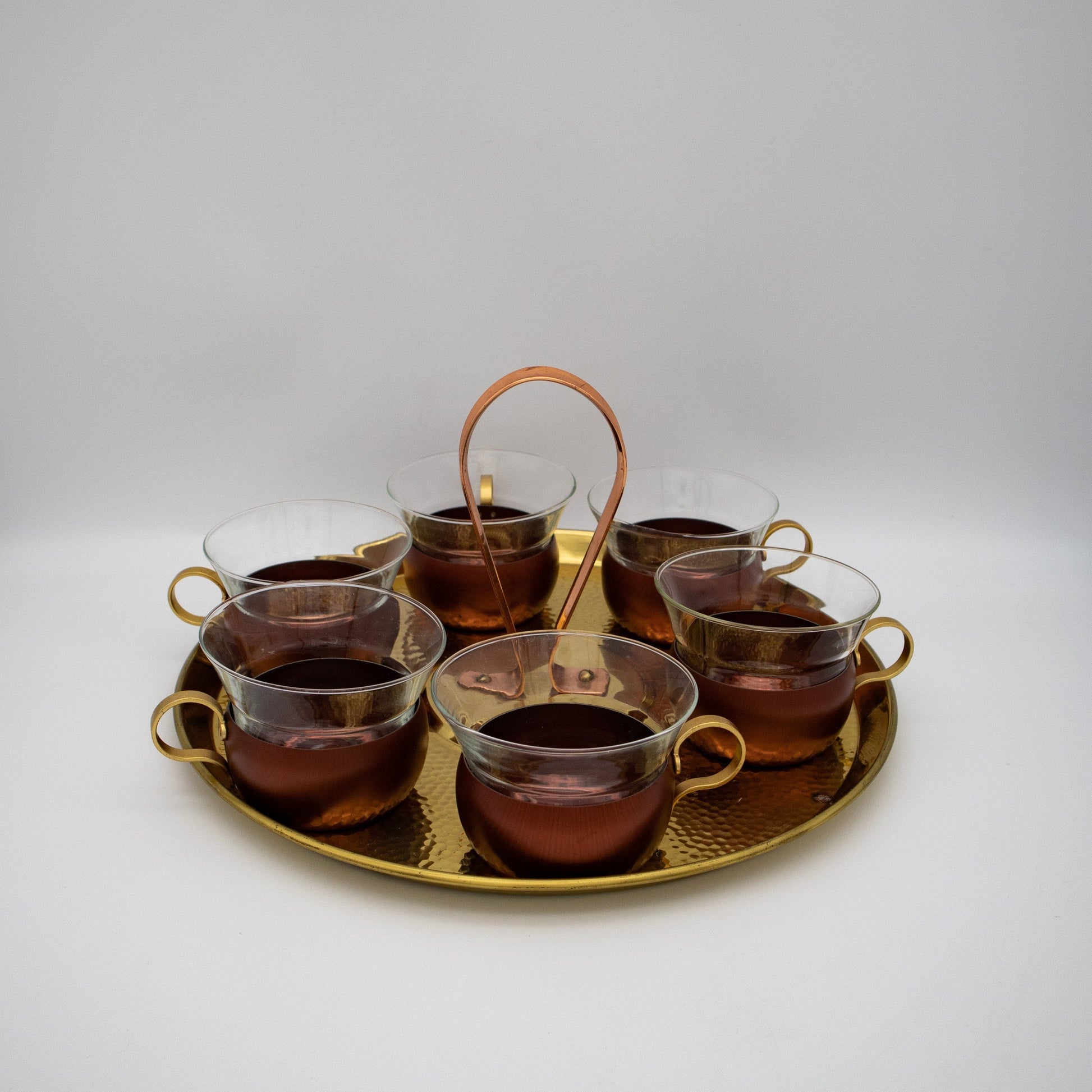 Le magnifique service à thé se compose de 6 tasses en cuivre avec un insert en verre et un plateau. L'ensemble a été produit en Allemagne dans les années 1960. Les coupes sont en cuivre et présentent un beau décor martelé sur leur tiers inférieur. Le thé ou le cacao peuvent être servis à merveille dans ce service.