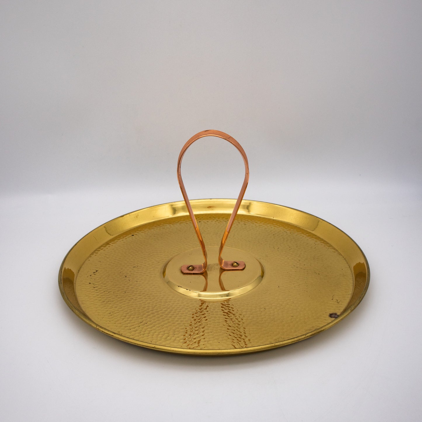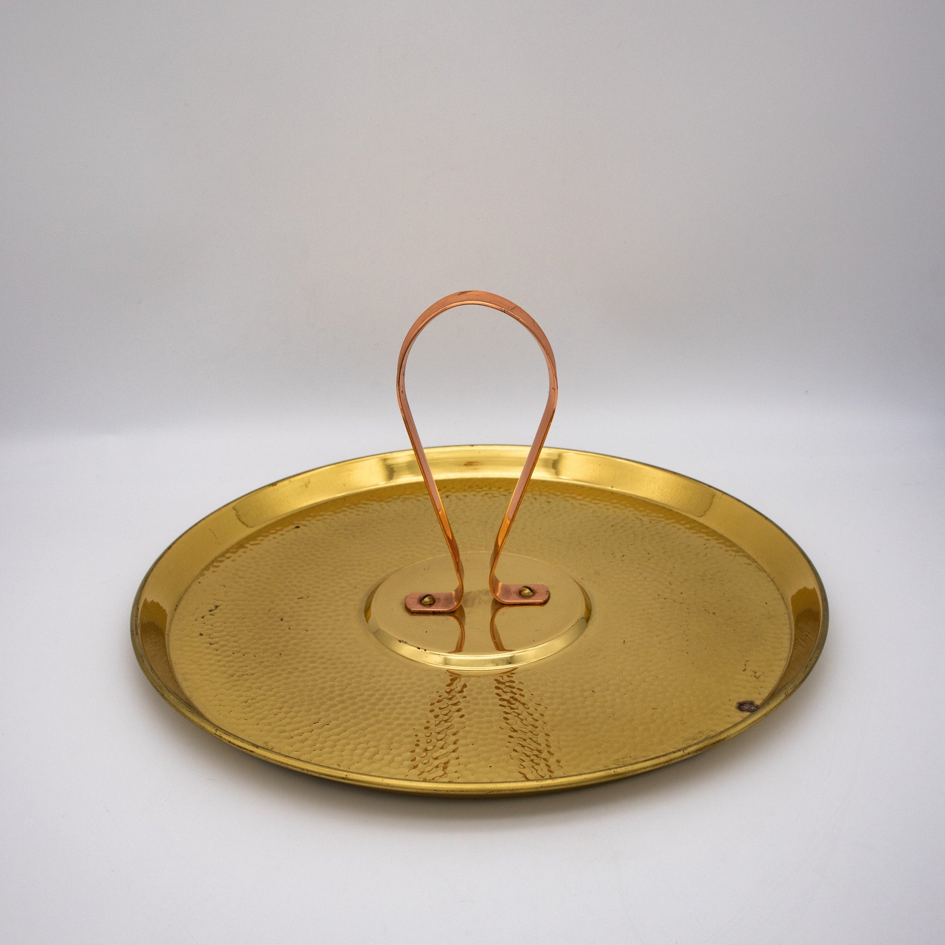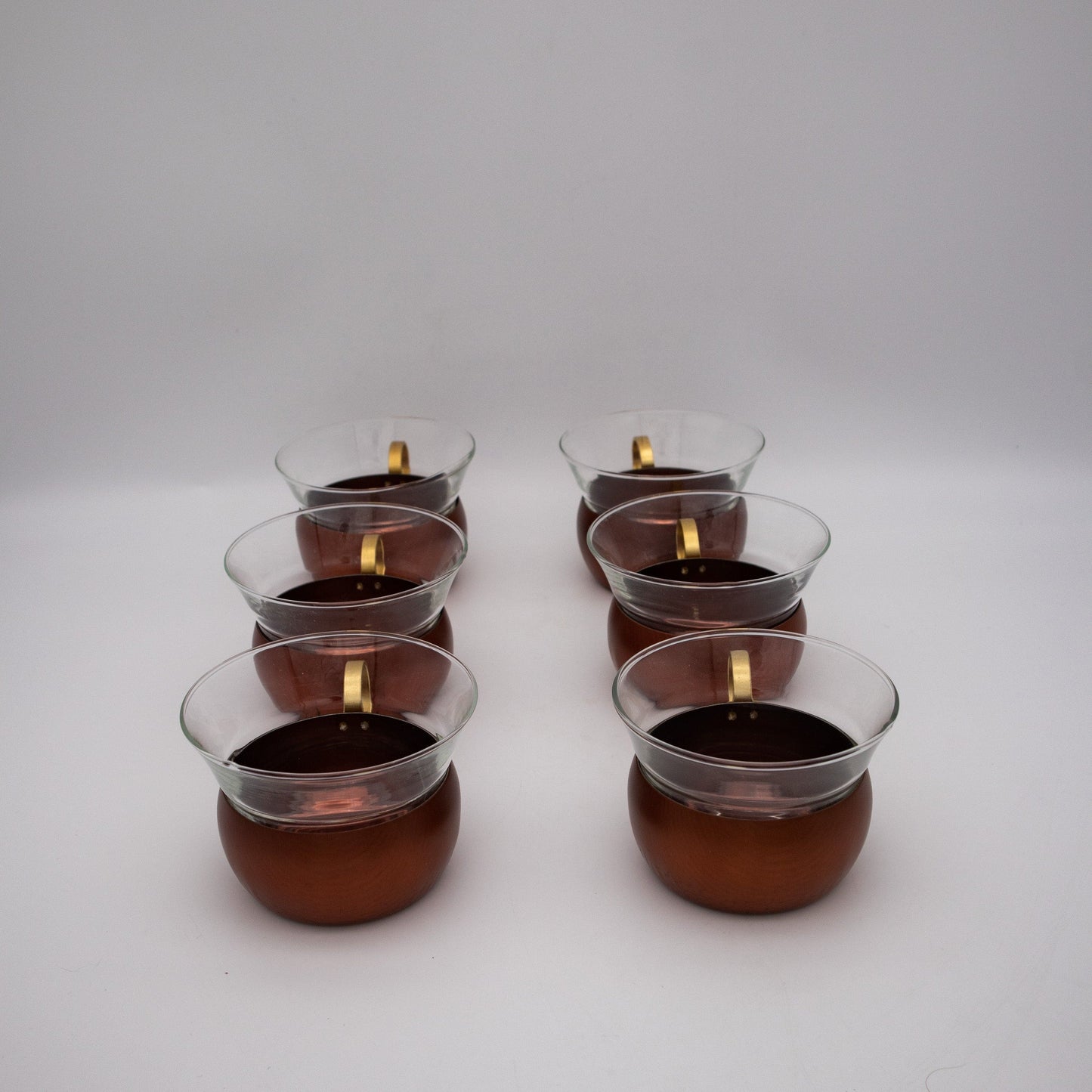 Le magnifique service à thé se compose de 6 tasses en cuivre avec un insert en verre et un plateau. L'ensemble a été produit en Allemagne dans les années 1960. Les coupes sont en cuivre et présentent un beau décor martelé sur leur tiers inférieur. Le thé ou le cacao peuvent être servis à merveille dans ce service.
