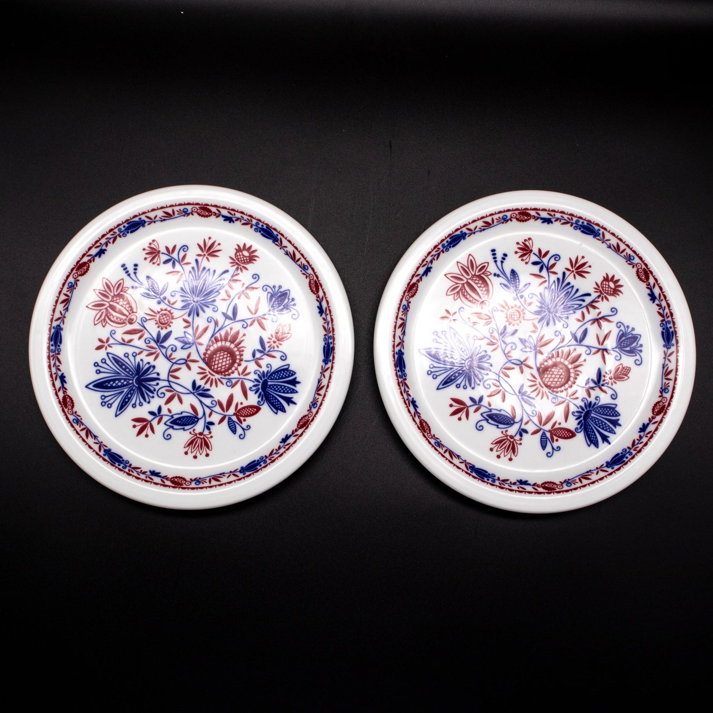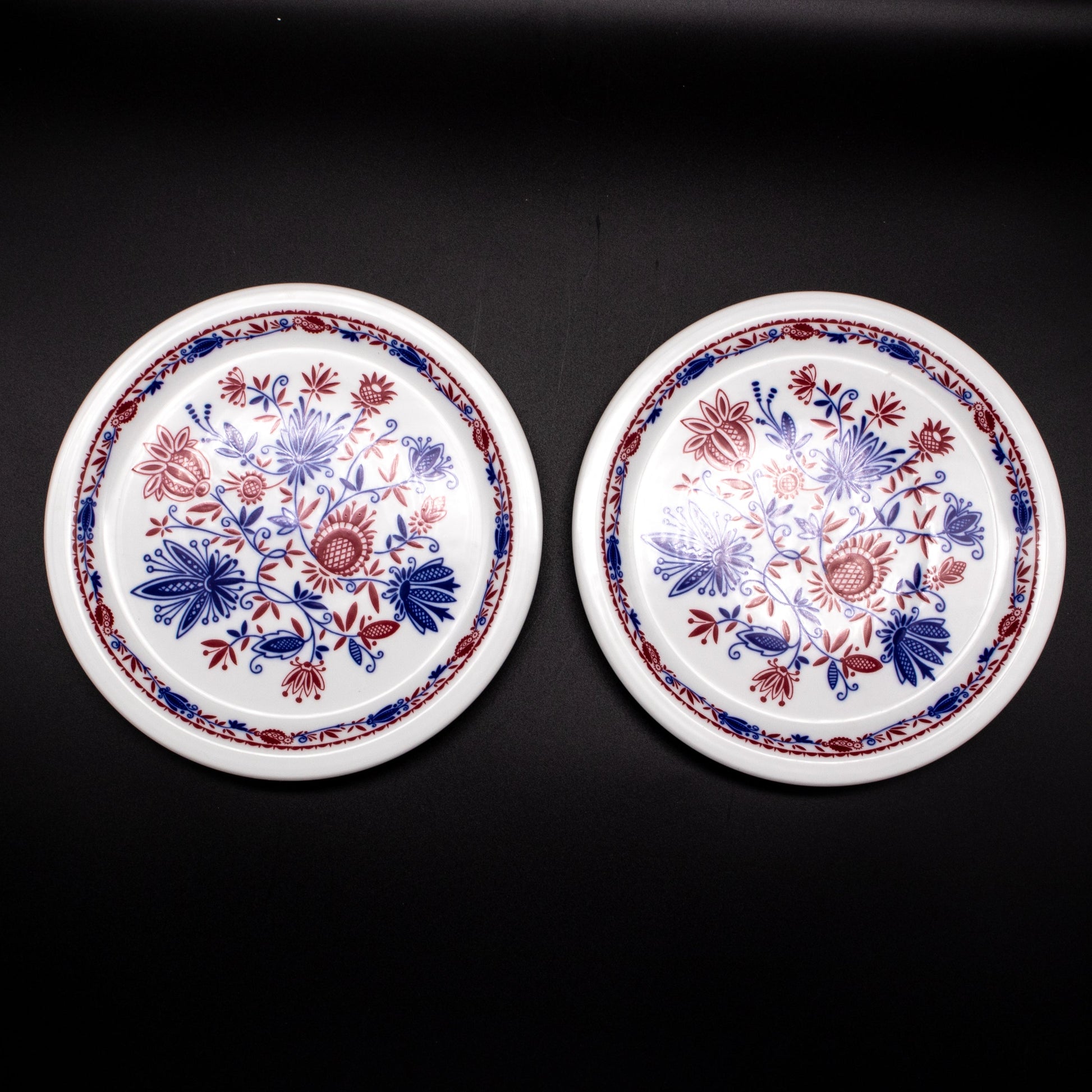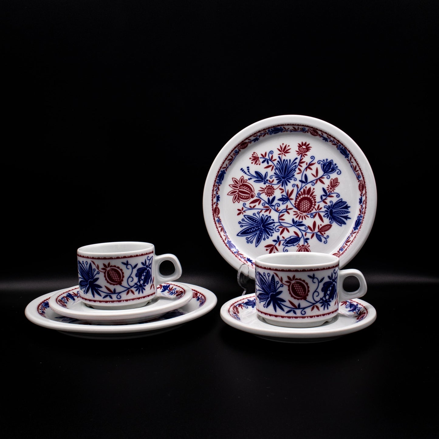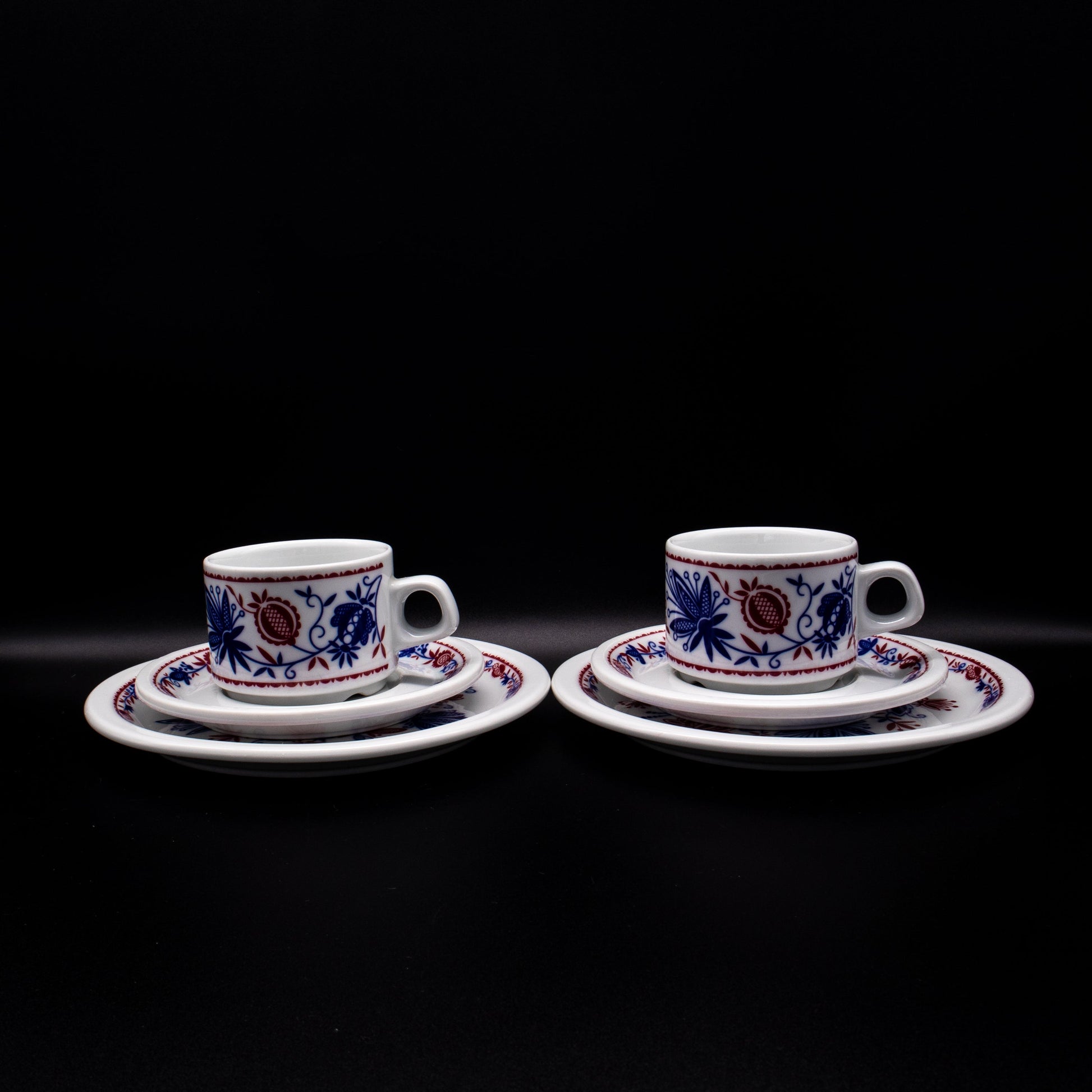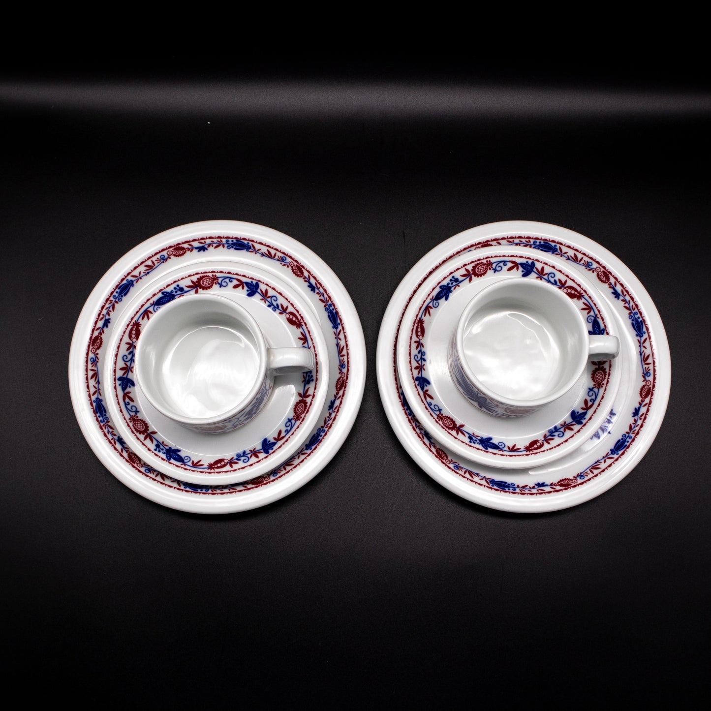 Le service petit-déjeuner de Lilien Porzellan se compose de : 2 tasses à café, 2 soucoupes et 2 petites assiettes. L'ensemble n'est pas le même timbre. Les soucoupes ont été fabriquées entre 1973 et 1974, les assiettes à dessert en 1977 et les tasses en 1989. L'ensemble a la forme Caroline et le décor dolomite.
