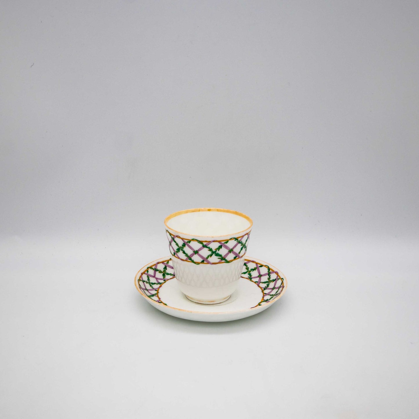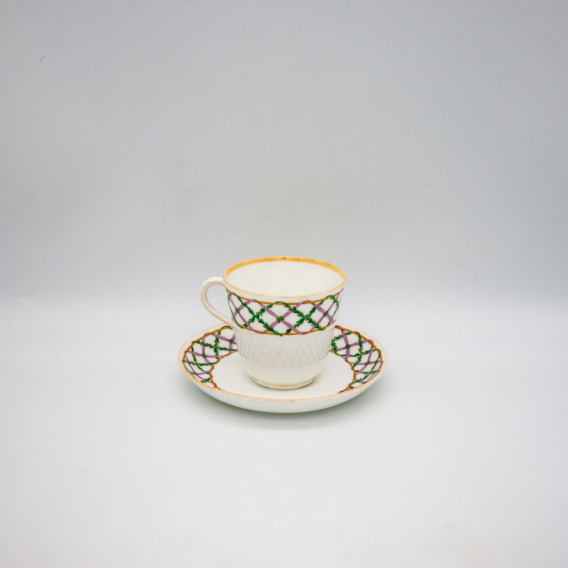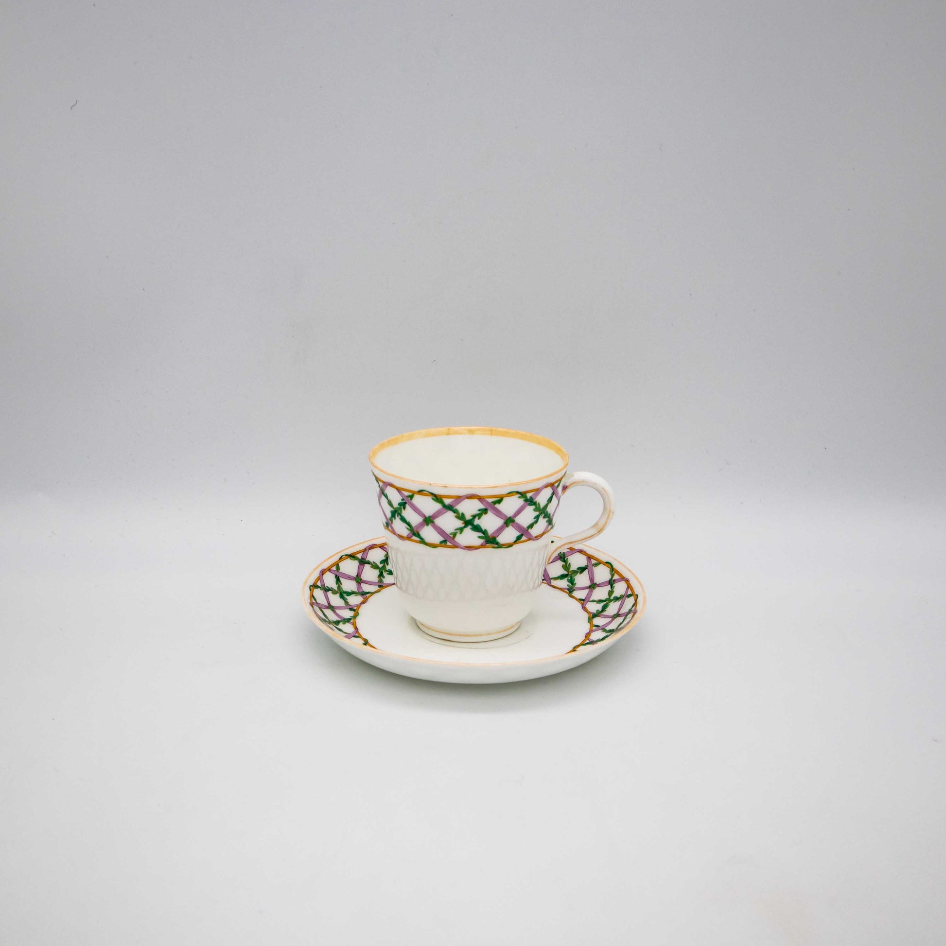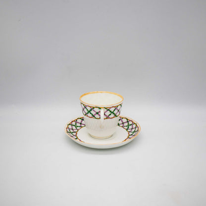 La tasse a été fabriquée par Minton Porcelain en Angleterre entre 1850 et 1870. La tasse et la soucoupe portent le logo de l'entreprise sur le fond. Ils ont été peints à la main et constituent un merveilleux exemple de la délicate production de porcelaine de Minton.