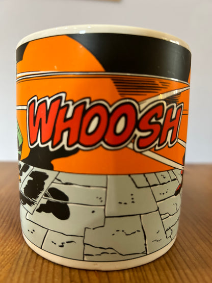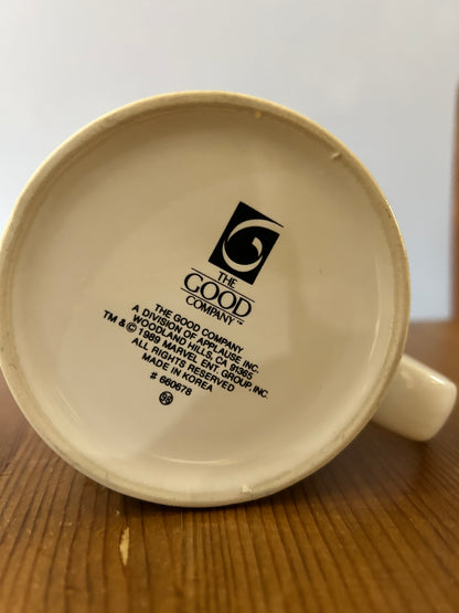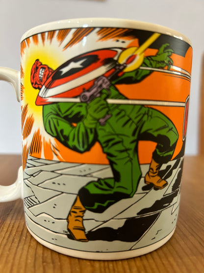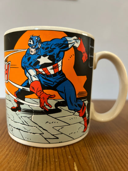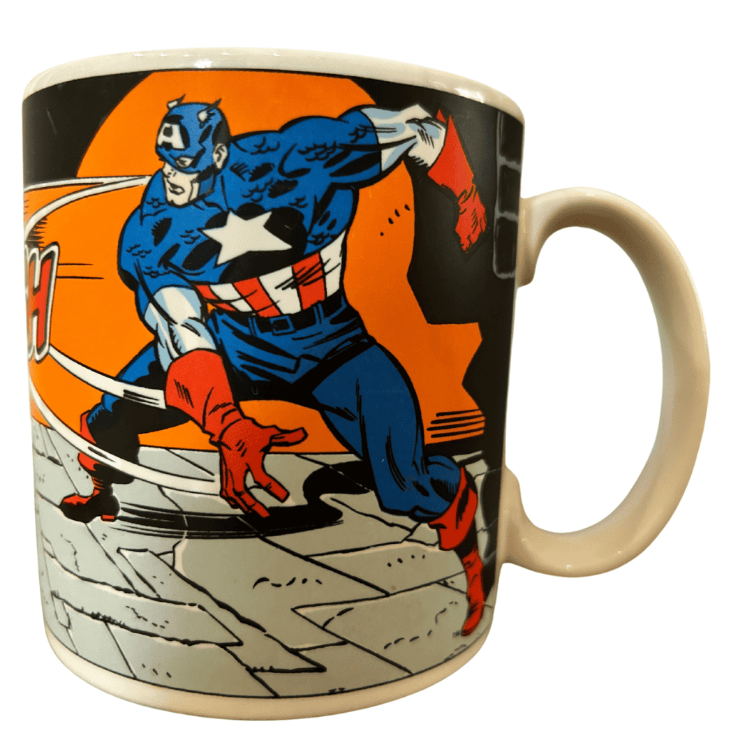 Ce mug est un véritable objet de collection pour les amateurs de culture nerd et de fandom, en particulier les fans de l'emblématique Captain America. Il date de 1989 et présente le héros légendaire en action contre son plus grand adversaire, Red Skull. Un incontournable pour les collectionneurs et admirateurs de cette époque, un morceau de l’histoire de la culture pop.