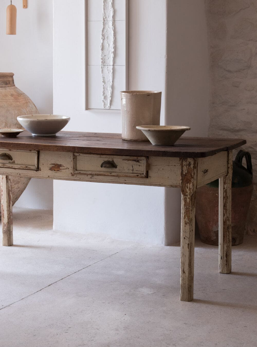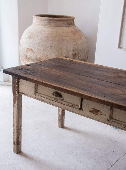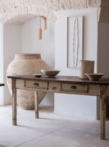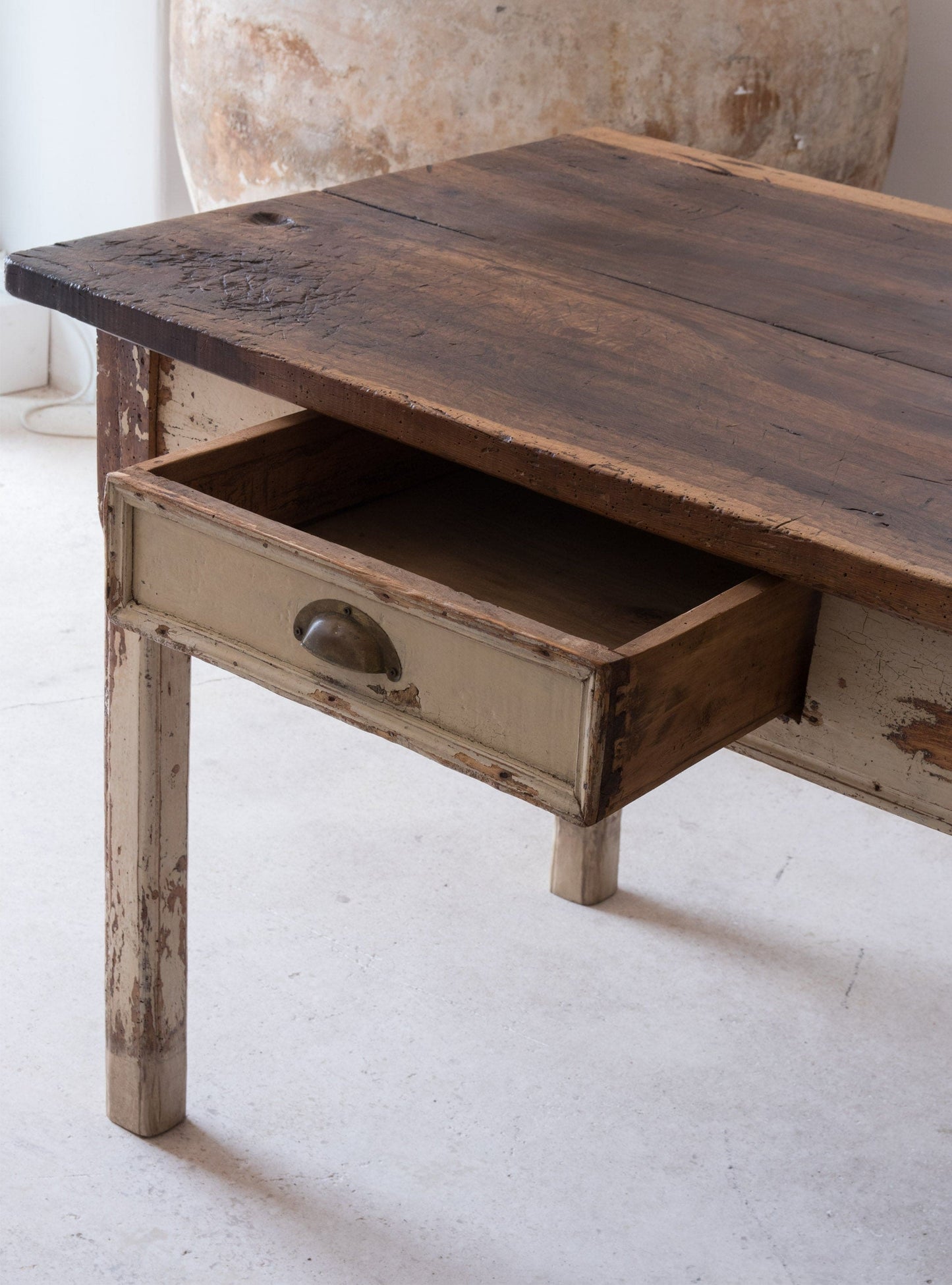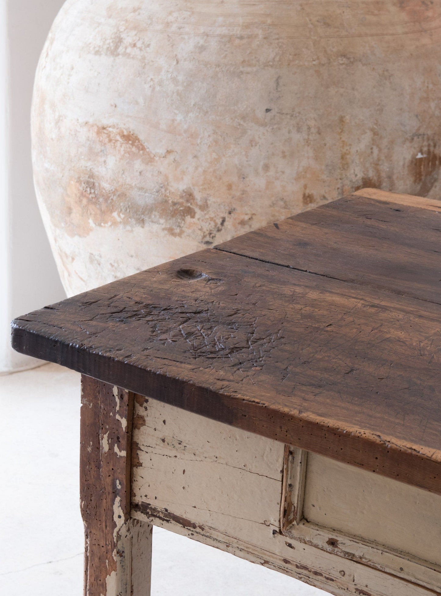 Une table en chêne robuste récupérée dans une vieille maison des Abruzzes. Le plateau épais de la table est fixé à une structure solide avec des pieds effilés décorés. Deux tiroirs frontaux et une table en chêne robuste récupérée dans une vieille maison des Abruzzes. Le plateau épais de la table est fixé à une structure solide avec des pieds effilés décorés. Deux tiroirs frontaux et une table en chêne robuste récupérée dans une vieille maison des Abruzzes. Le plateau épais de la table est fixé à une structure solide avec des pieds effilés décorés. Deux tiroirs en façade et
