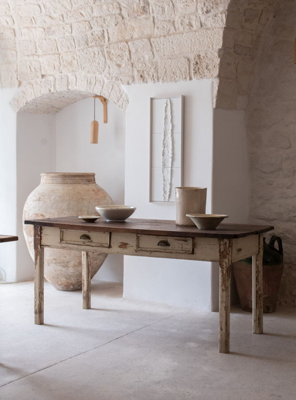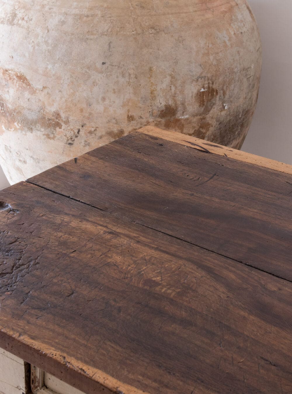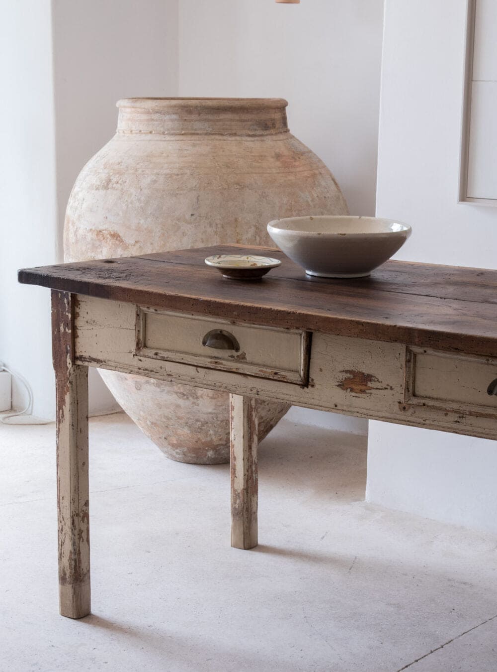 Une table en chêne robuste récupérée dans une vieille maison des Abruzzes. Le plateau épais de la table est fixé à une structure solide avec des pieds effilés décorés. Deux tiroirs frontaux et une table en chêne robuste récupérée dans une vieille maison des Abruzzes. Le plateau épais de la table est fixé à une structure solide avec des pieds effilés décorés. Deux tiroirs frontaux et une table en chêne robuste récupérée dans une vieille maison des Abruzzes. Le plateau épais de la table est fixé à une structure solide avec des pieds effilés décorés. Deux tiroirs en façade et