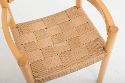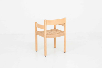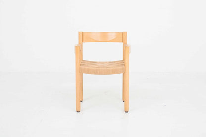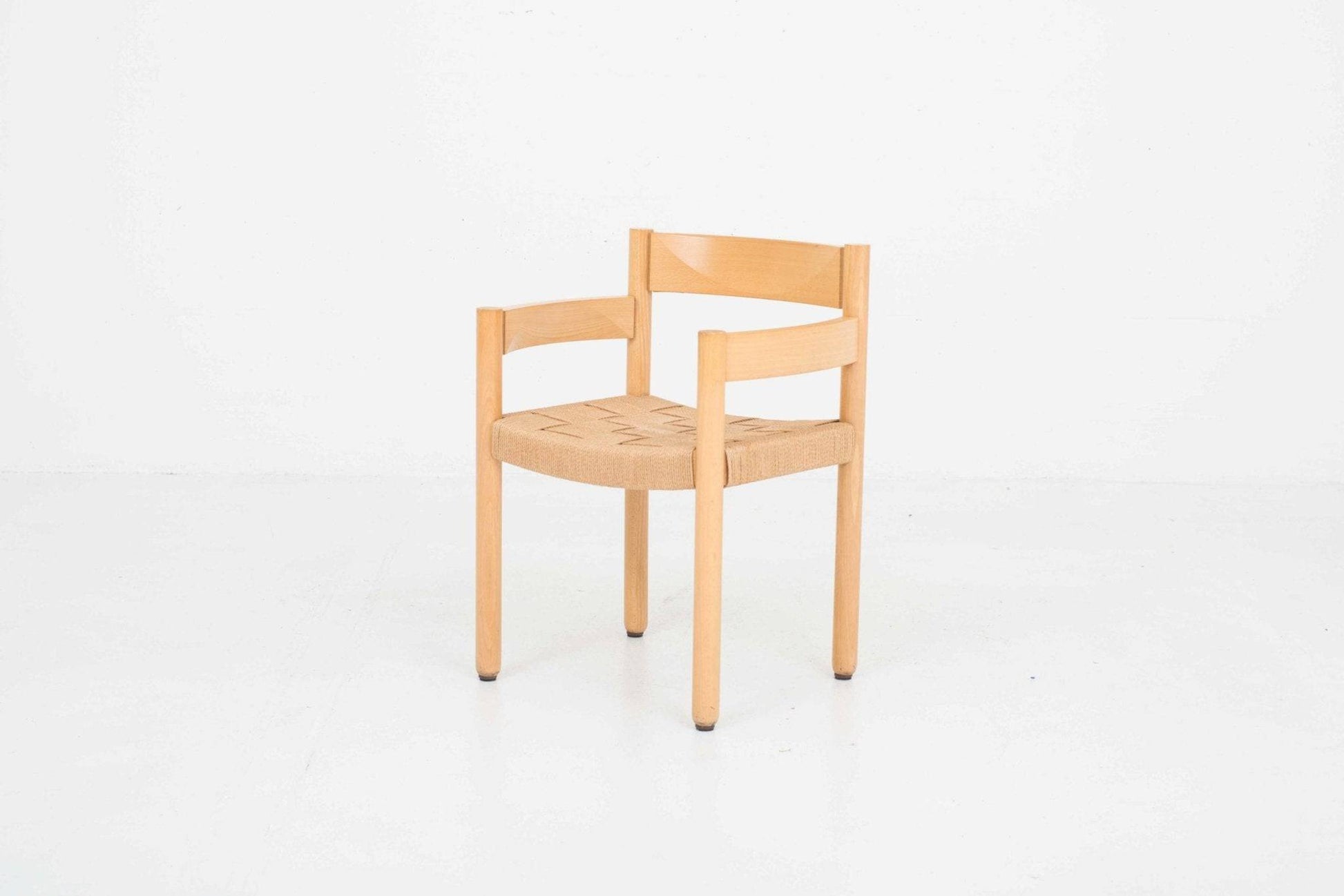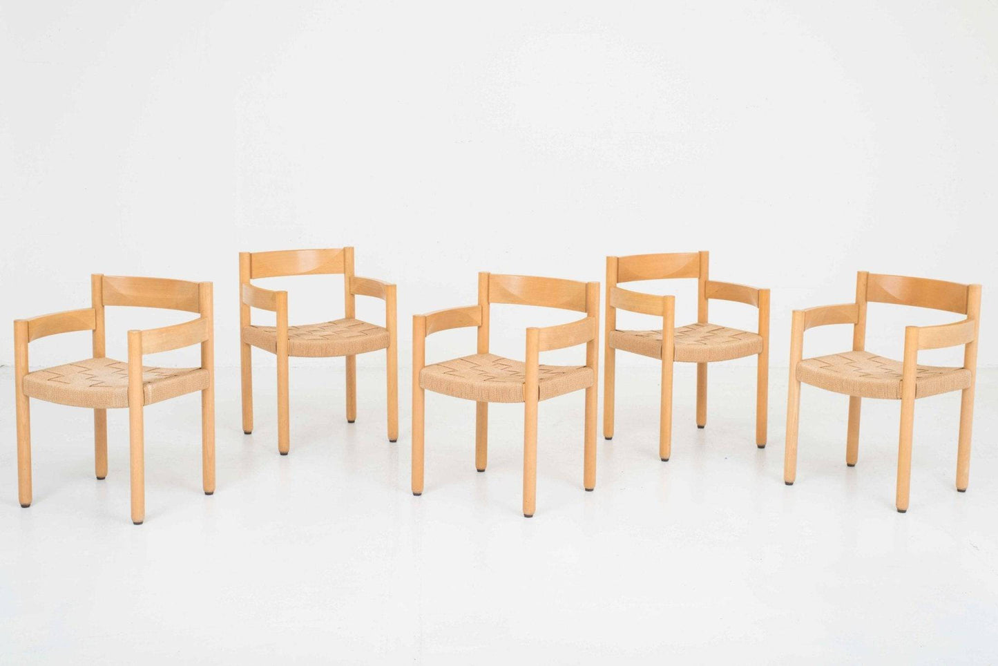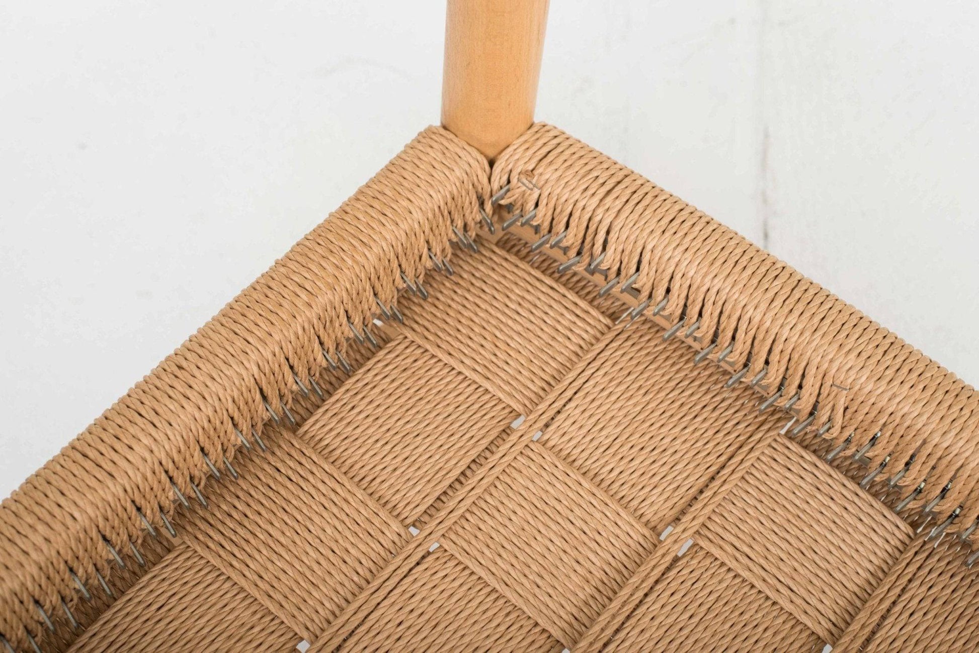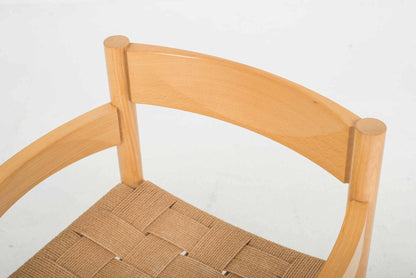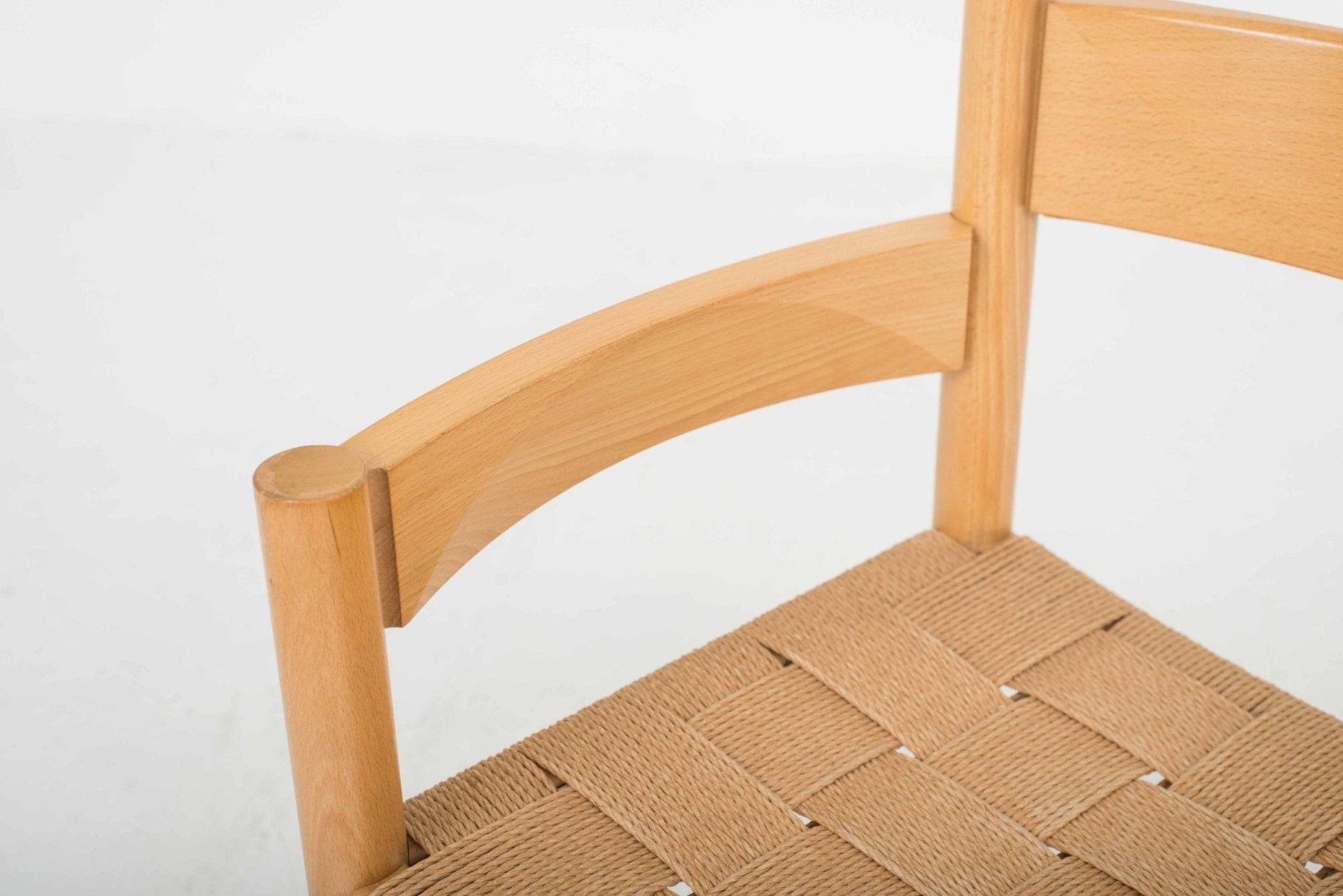 \nUn bureau aux allures d'arc de triomphe en pierre ou une tour à tiroirs en forme de colonne : le duo d'architectes suisses Trix et Robert Haussmann a ironiquement présenté dans les années 1970 les principes fonctionnalistes du modernisme non seulement avec leur architecture, mais aussi avec leur meuble en question. Mais les chaises Stollen au look minimaliste datent d'avant la création du bureau commun « Allgemeine Draftsanstalt », avec lequel ils ont développé leurs célèbres stratégies postmodernes : les chaises en bois massif laqué et l'assise en corde tressée, conçues par Robert Haussmann en 1963, furent les premiers présentés à l'Expo de Lausanne en 1964, ils furent ensuite produits dans diverses variantes. Ces spécimens sont en bon état d'usage ; des signes d'usure occasionnels sont visibles sur les surfaces du bois et des sièges. Le prix est par pièce.