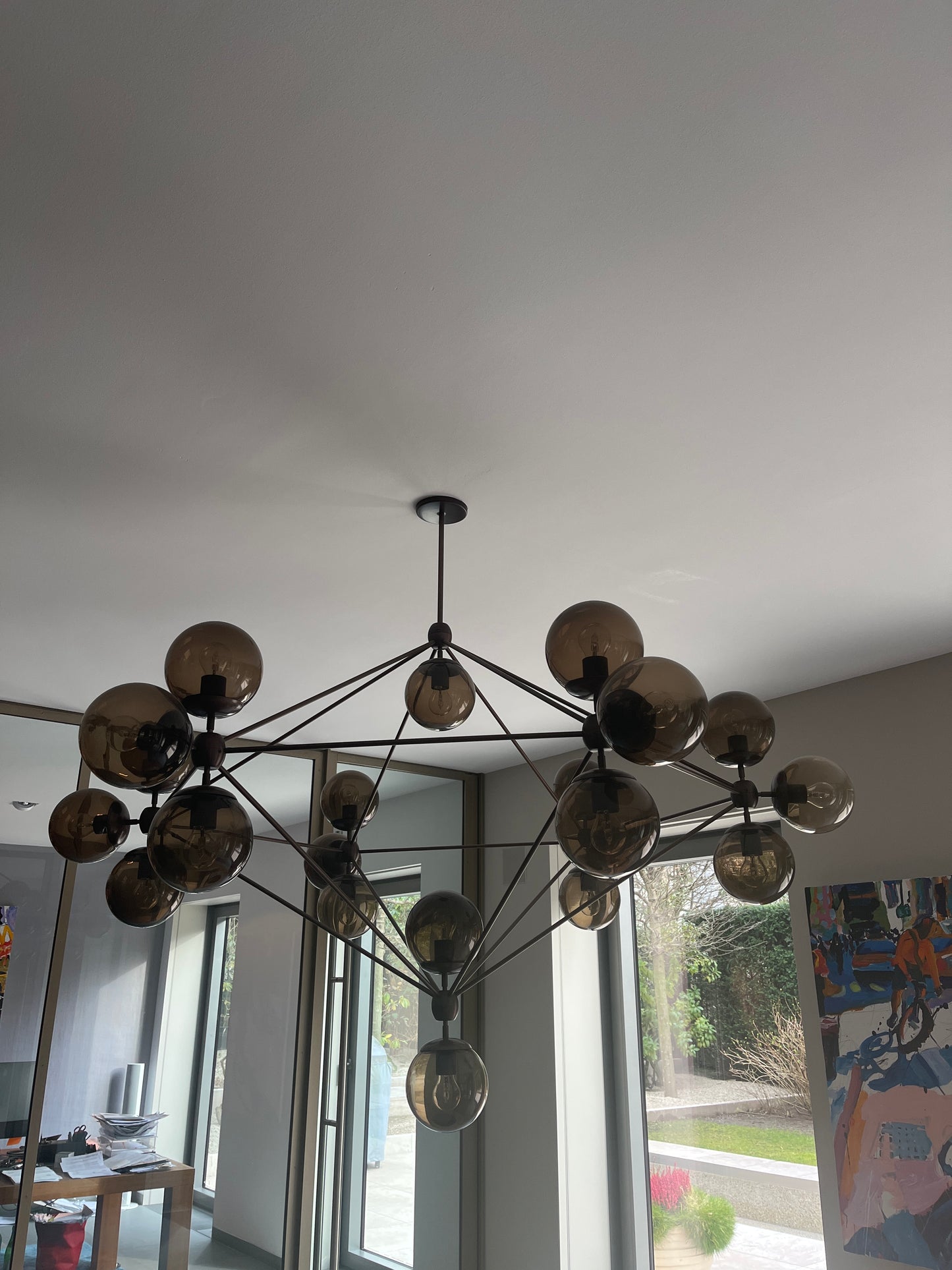 Le lustre Modo de Roll and Hill Hill présente une structure en aluminium parfaitement exécutée en bronze, couronnée d'élégantes boules de verre gris fumé, transparent classique et crème douce et peut être combinée individuellement pour ajouter une touche personnelle.