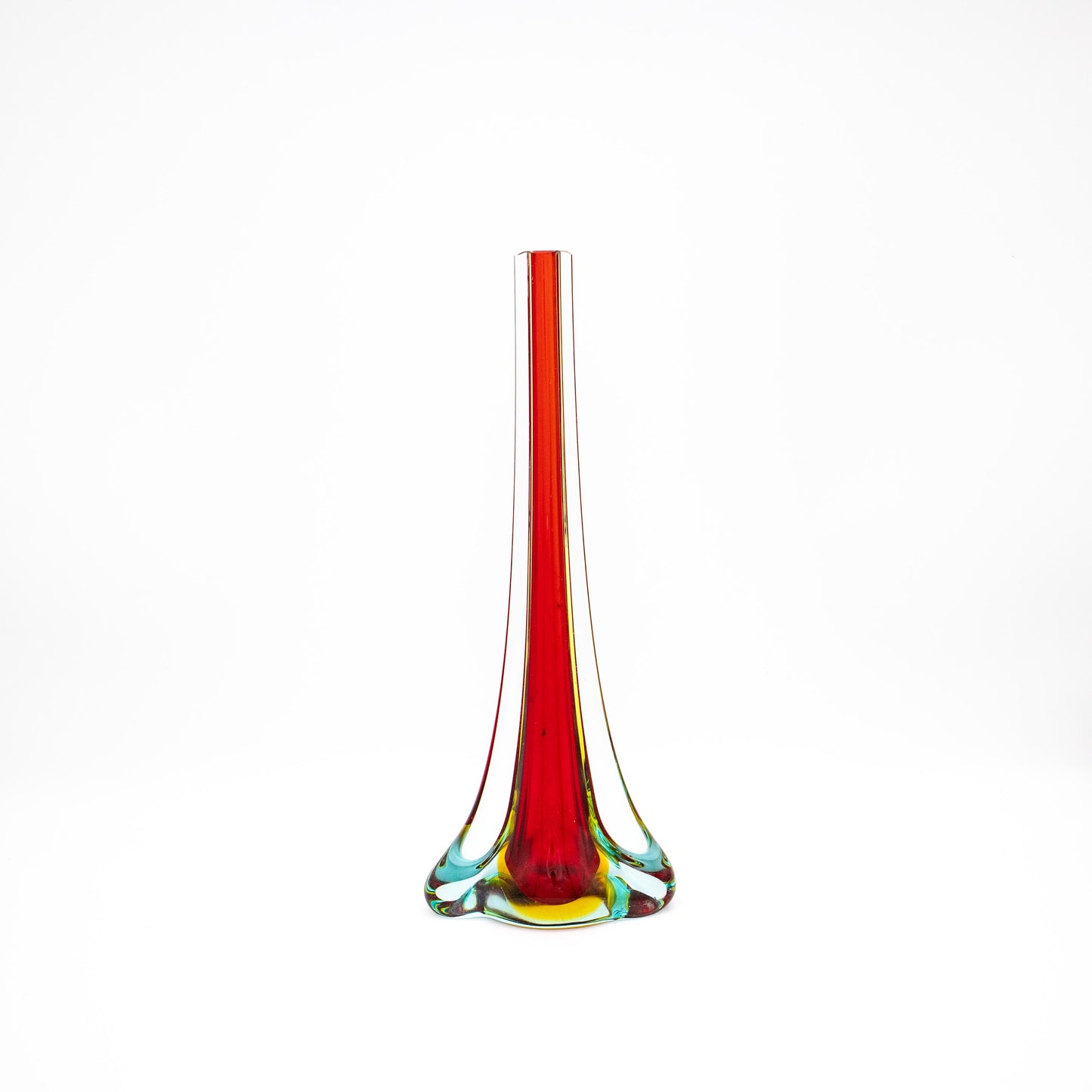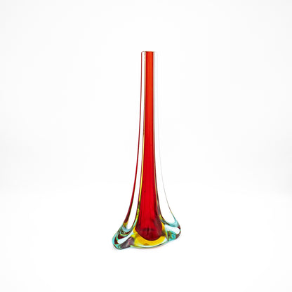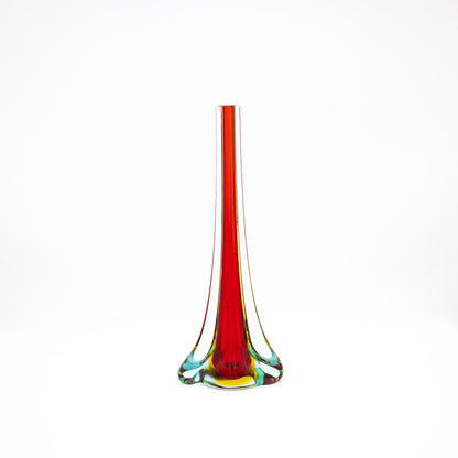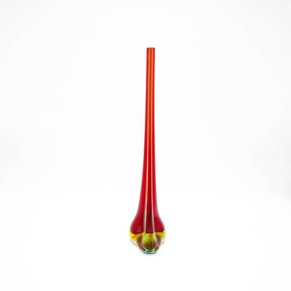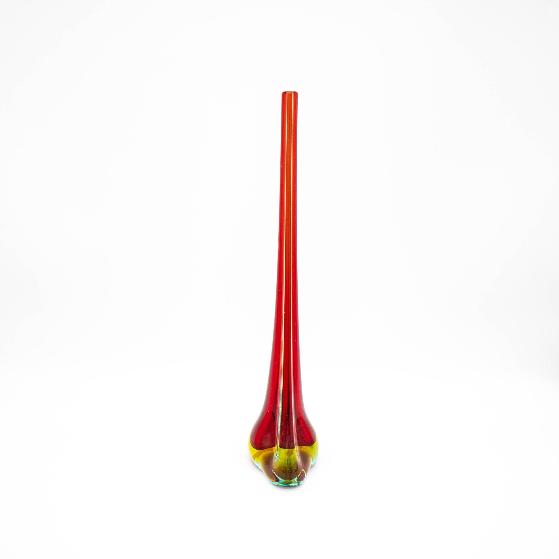 Le vase rouge est unique et se distingue par son design accrocheur. Il est fait de verre rouge entouré de verre clair et jaune. Cette combinaison donne à ce vase bâton sa forme particulière. C'est un excellent cadeau pour tous ceux qui aiment quelque chose d'unique et d'accrocheur.