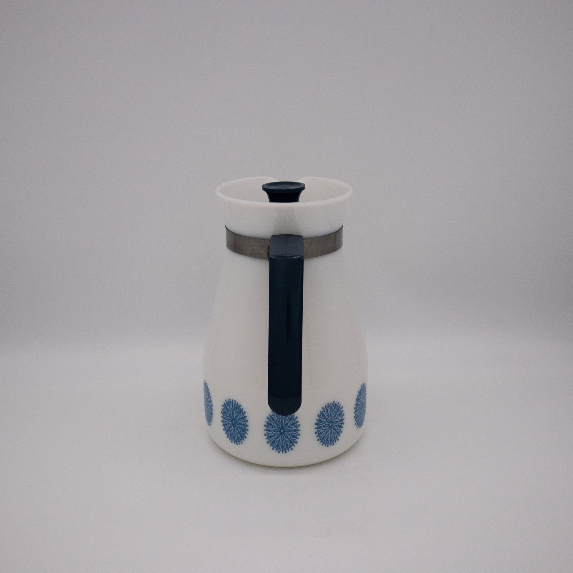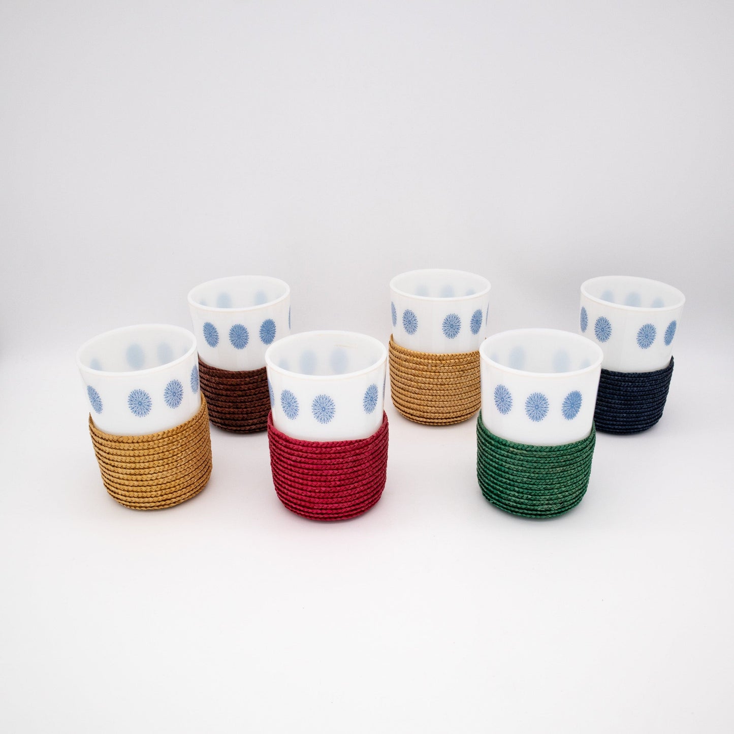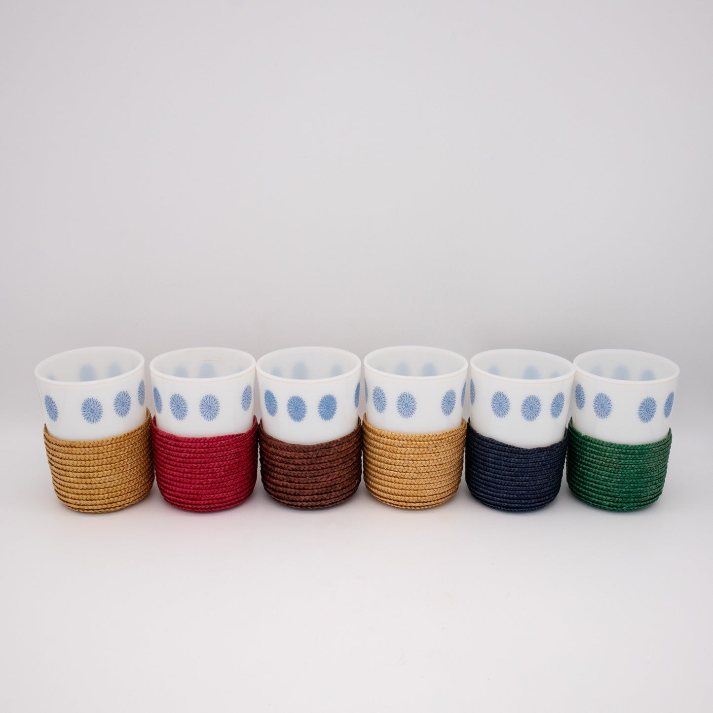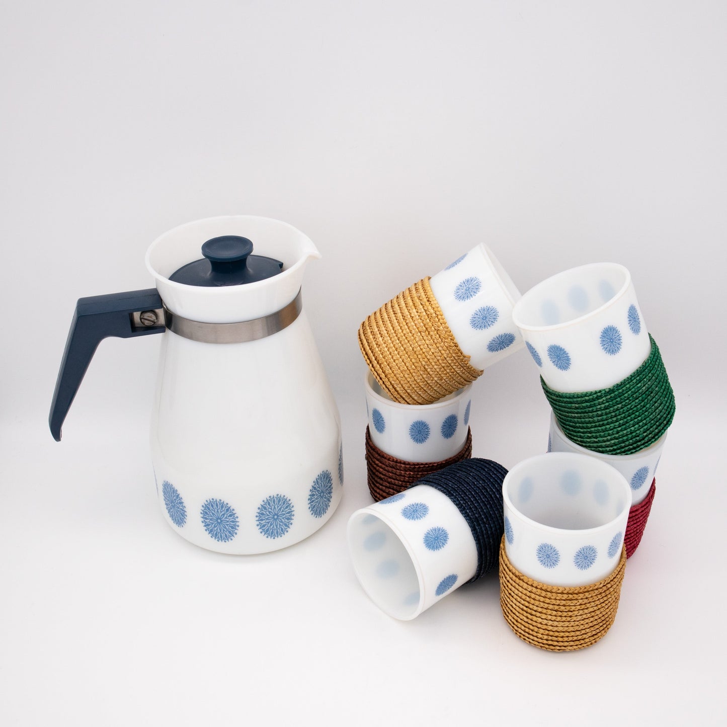 Le beau service à café se compose d'une cafetière et de 6 mugs avec paniers en raphia. Ils ont été fabriqués en verre blanc Jena par Schott Mainz dans les années 1970. Ils sont en excellent état et constituent un merveilleux exemple de la culture de la table des années 70 sauvages.