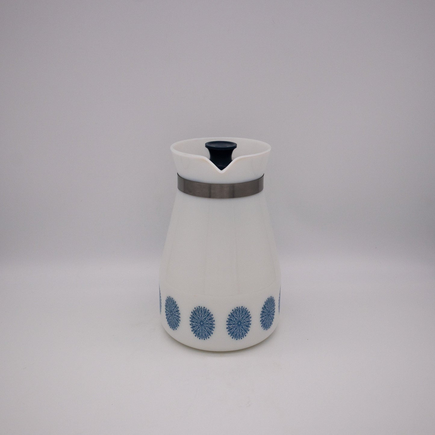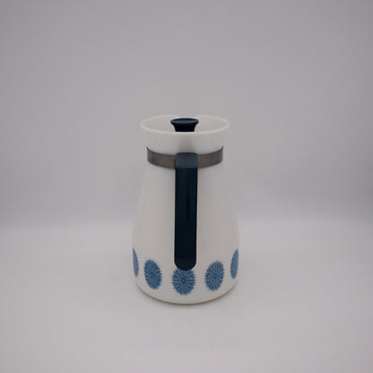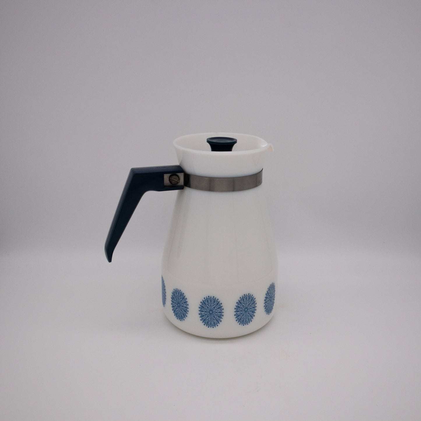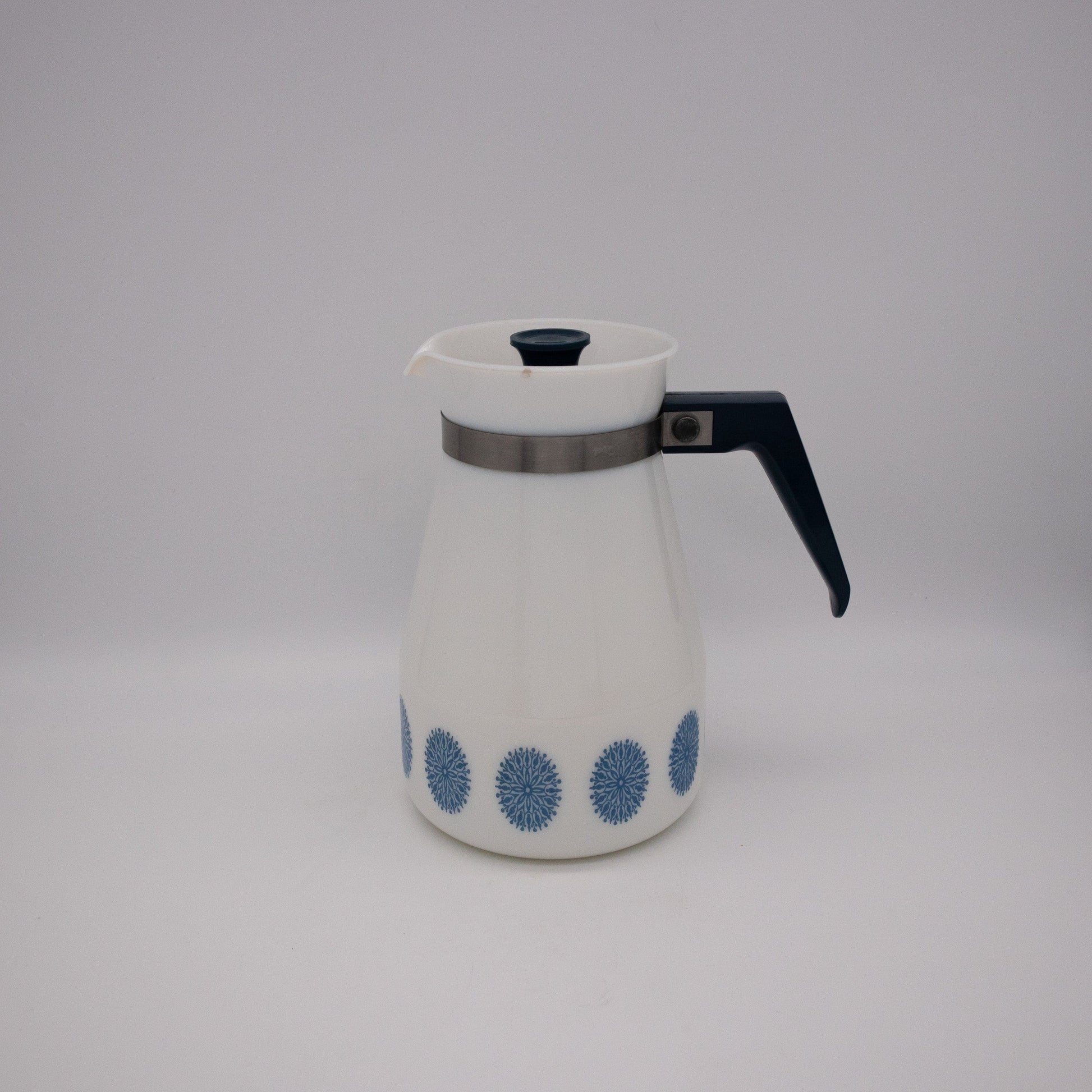 Le beau service à café se compose d'une cafetière et de 6 mugs avec paniers en raphia. Ils ont été fabriqués en verre blanc Jena par Schott Mainz dans les années 1970. Ils sont en excellent état et constituent un merveilleux exemple de la culture de la table des années 70 sauvages.