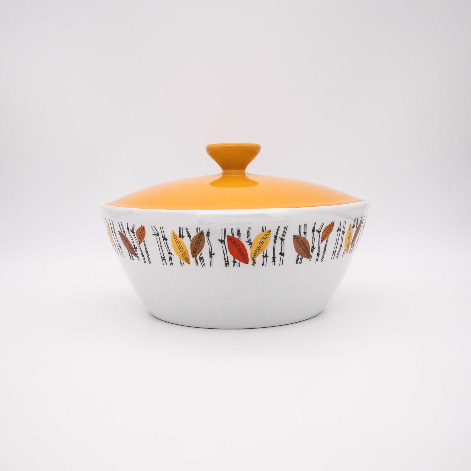 Notre terrine estivale, avec son jaune intense et ses jolis détails de feuilles, est le choix parfait pour tout dîner. Ce trésor vintage a été fabriqué par Alfred Meakin (Tunstall) LTD. produit en Angleterre. C'est beau et donne à la table une atmosphère charmante et estivale.