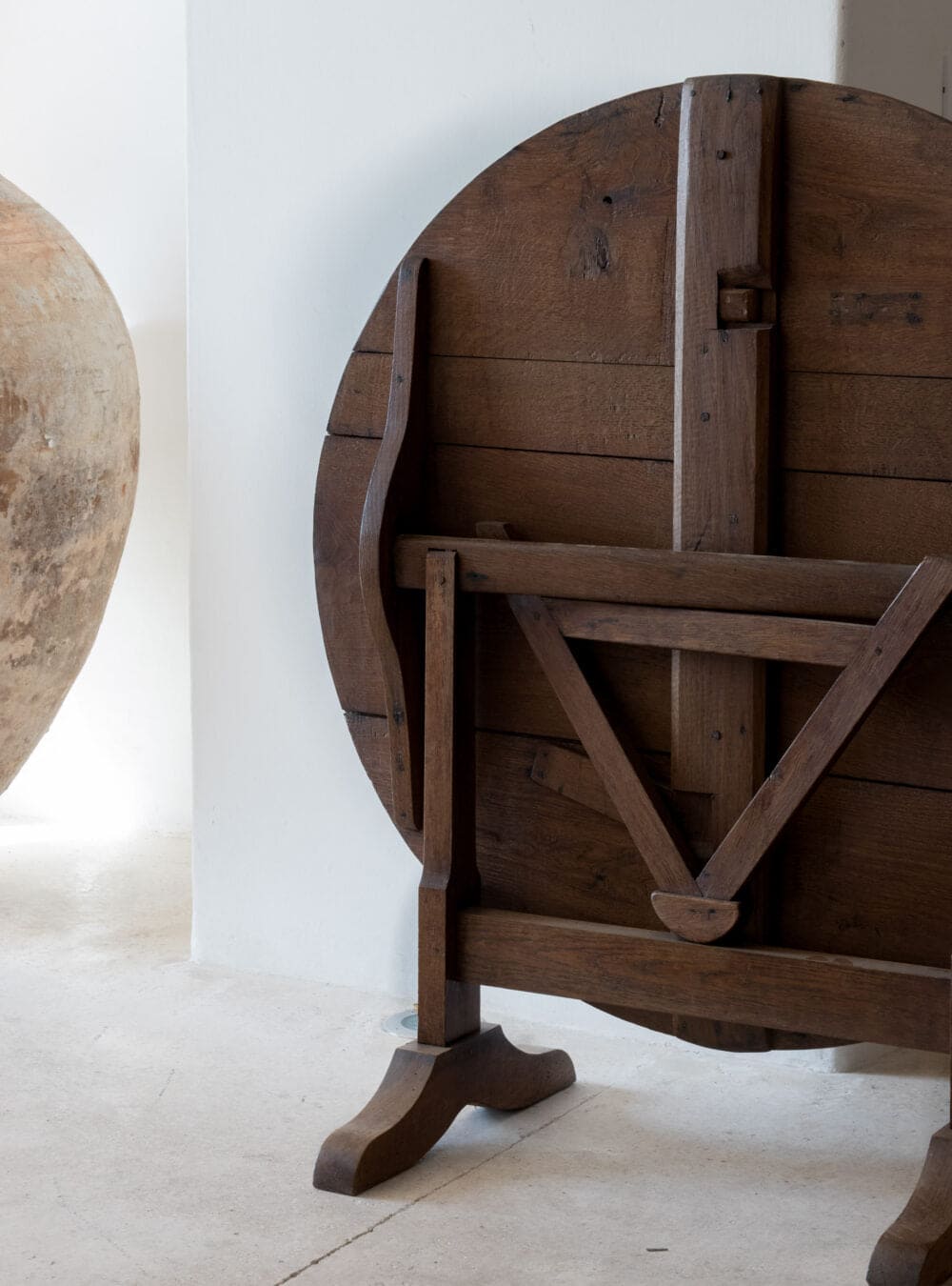 Une table de présentation française inclinable du milieu du XIXe siècle, autrefois utilisée comme table de dégustation de vin. Grand plateau rond en noyer sur une base à tréteaux en chêne avec une simple table de vente française inclinable du milieu du XIXe siècle, autrefois utilisée comme table de dégustation de vins. Grand plateau rond en noyer sur une base à tréteaux en chêne avec une simple table de vente française inclinable du milieu du XIXe siècle, autrefois utilisée comme table de dégustation de vin. Grande assiette ronde en noyer sur un socle en tréteau en chêne avec un simple