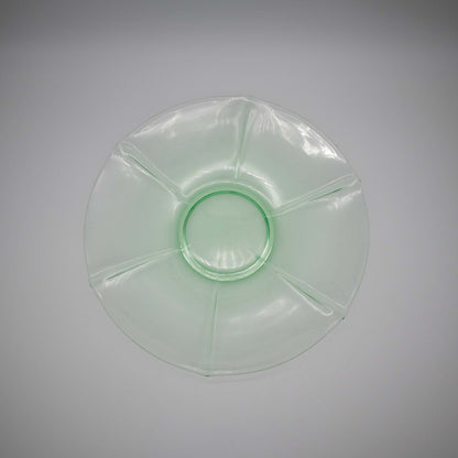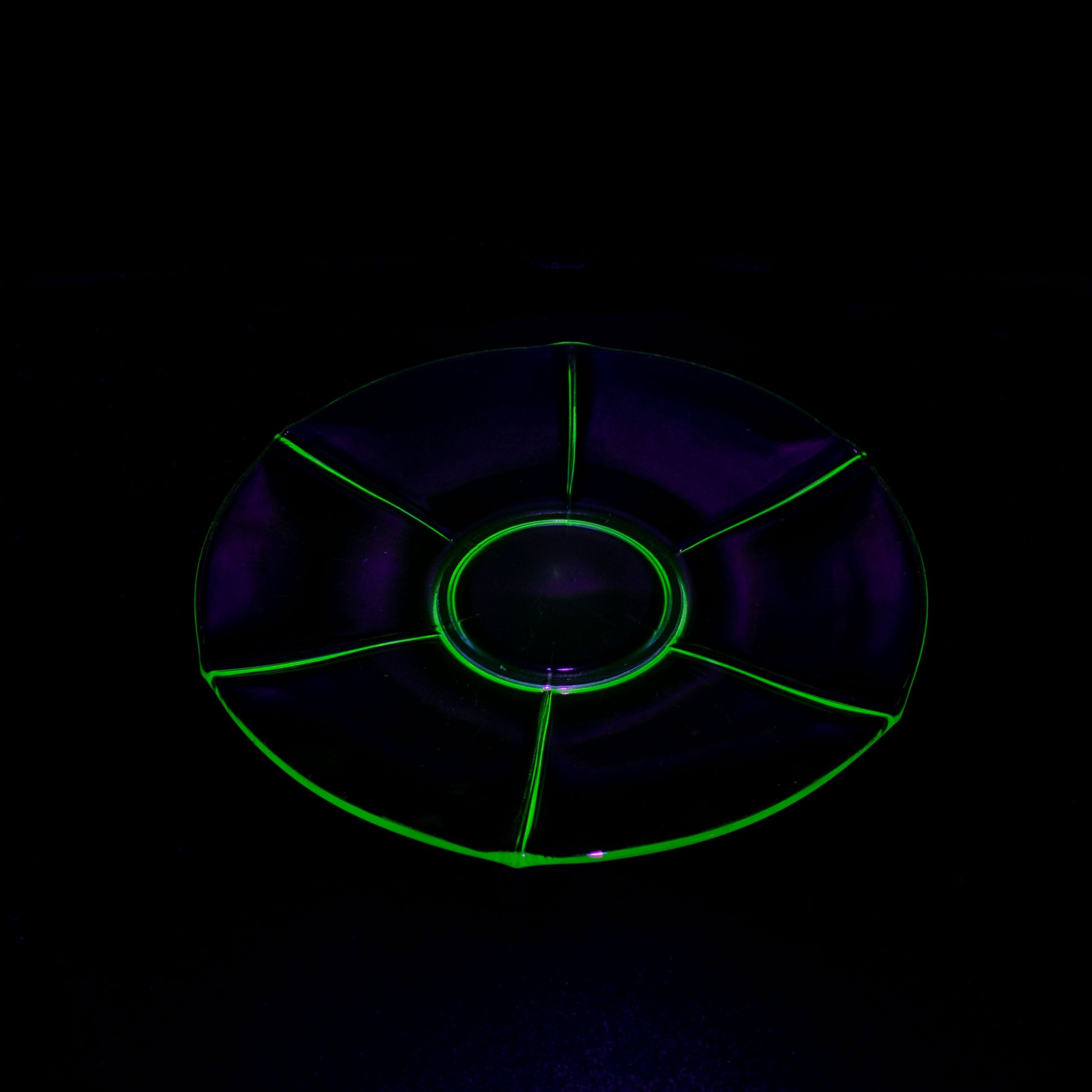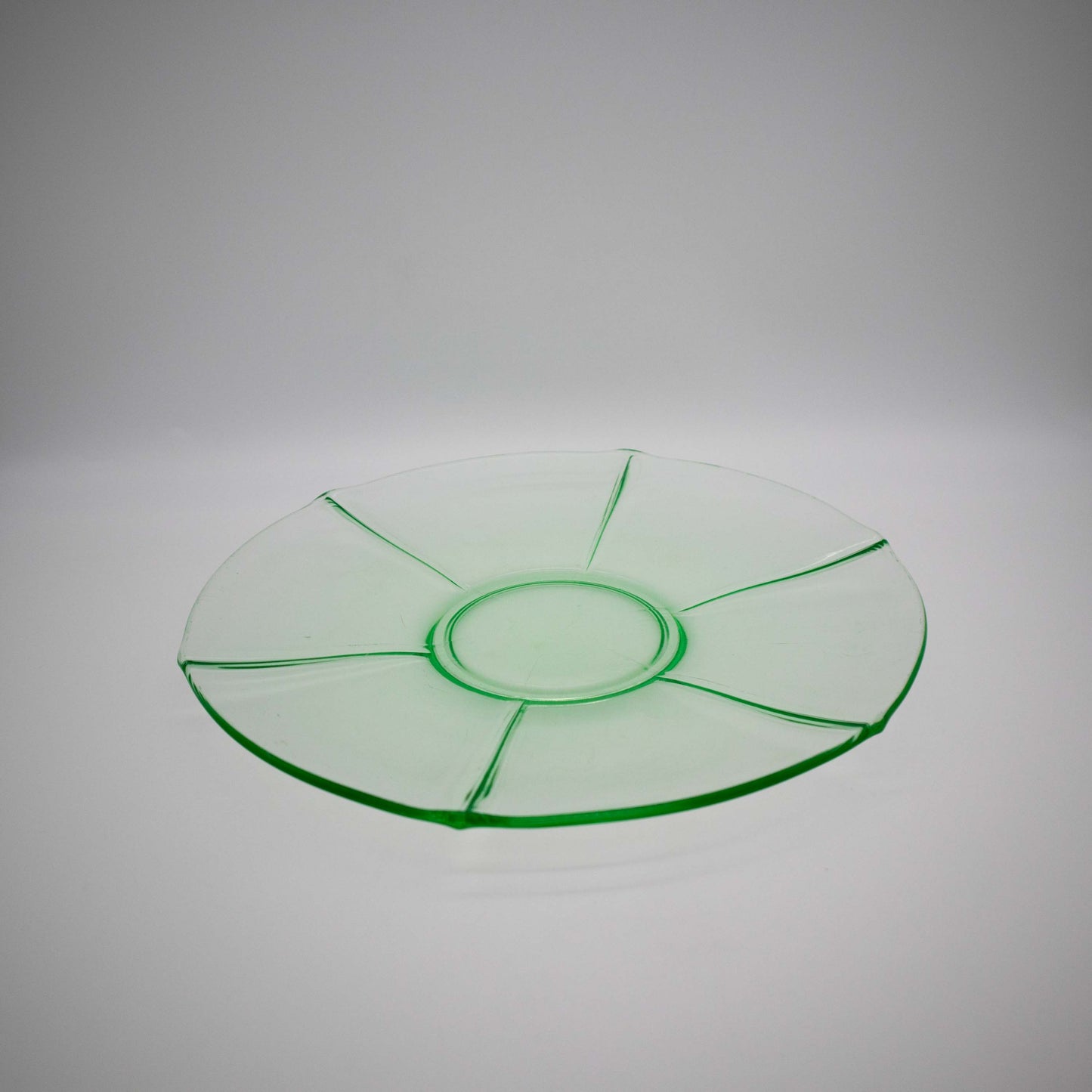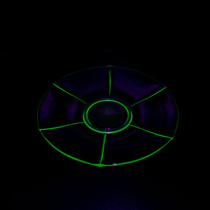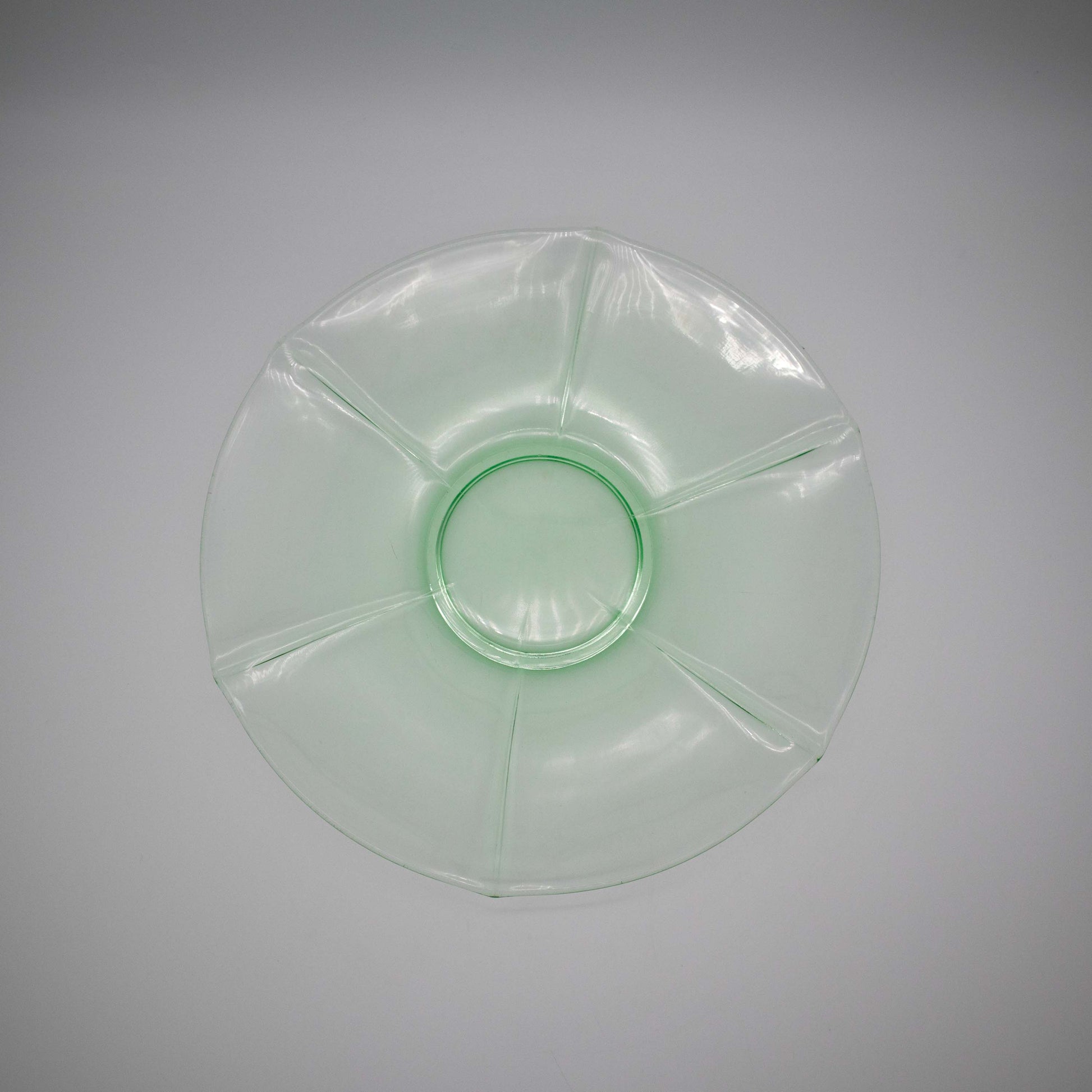 La belle assiette à gâteau en verre d'uranium date d'environ 1930 et est une belle pièce. Sa couleur éclatante et son éclat radieux en font un véritable accroche-regard. Grâce à ses coins et bords solides, il s'intègre parfaitement dans n'importe quel service de table.