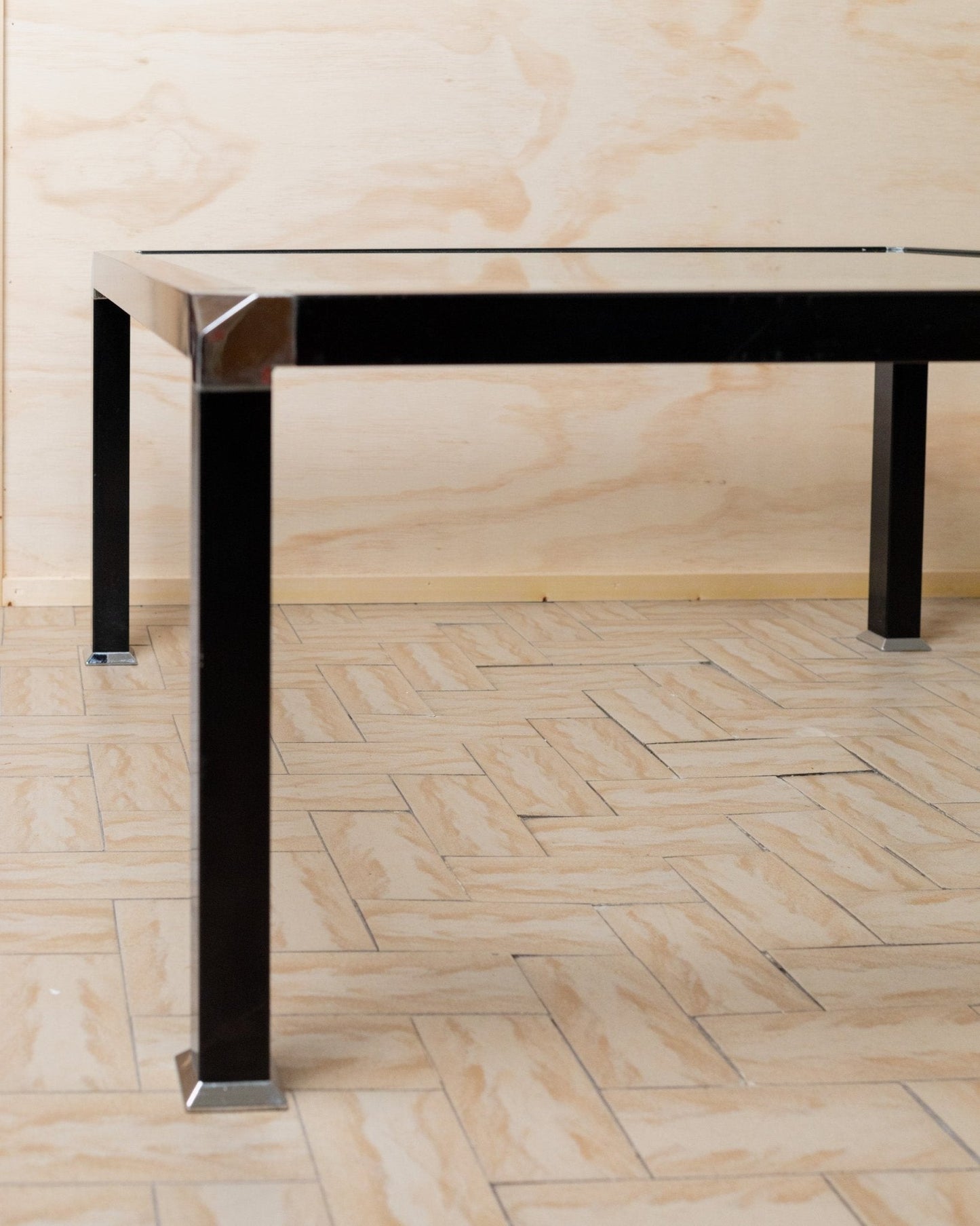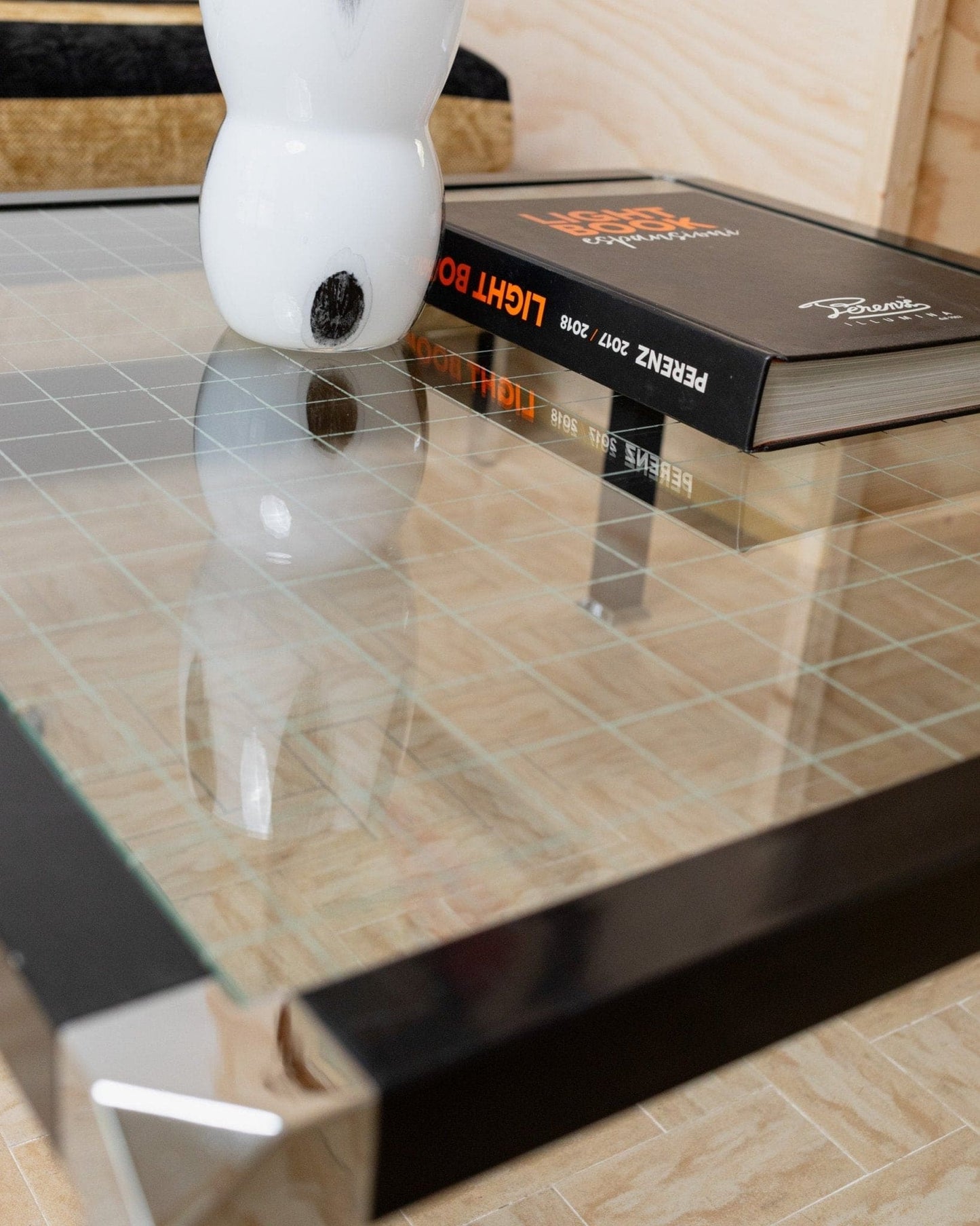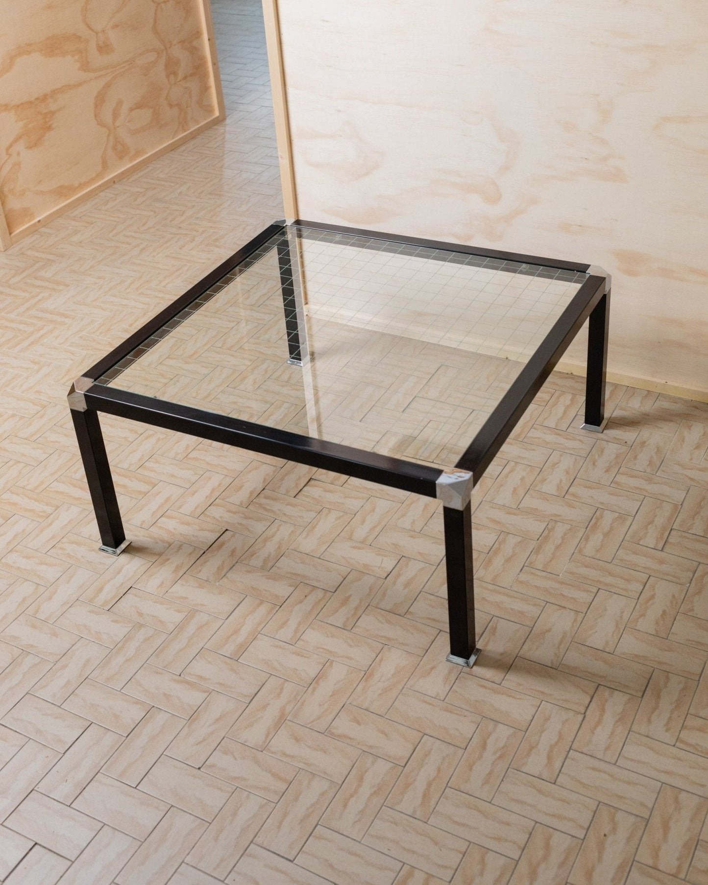 - Matière : Métal laqué noir, coins chromés, verre à carreaux
