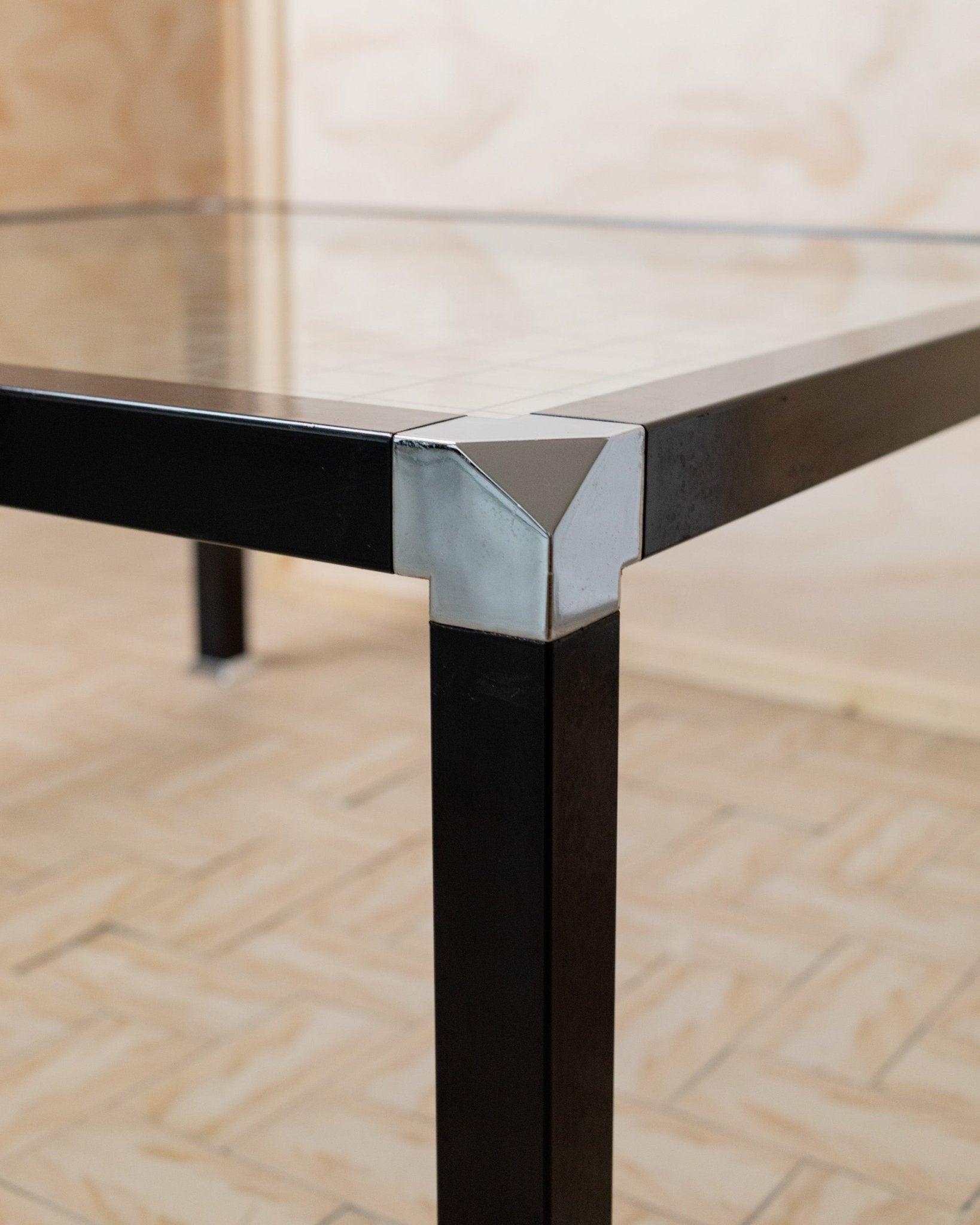 - **Matière :** Métal laqué noir, coins chromés, verre à carreaux