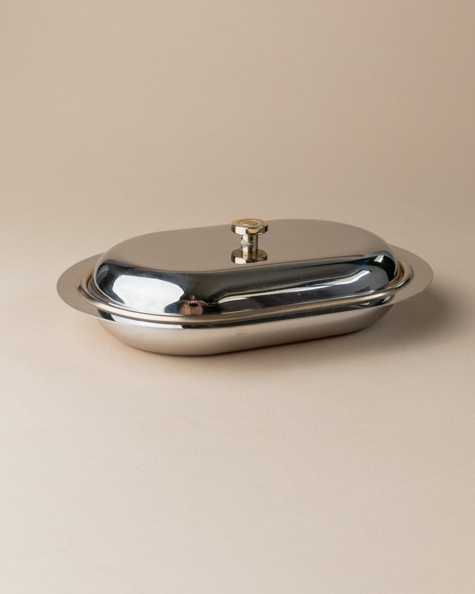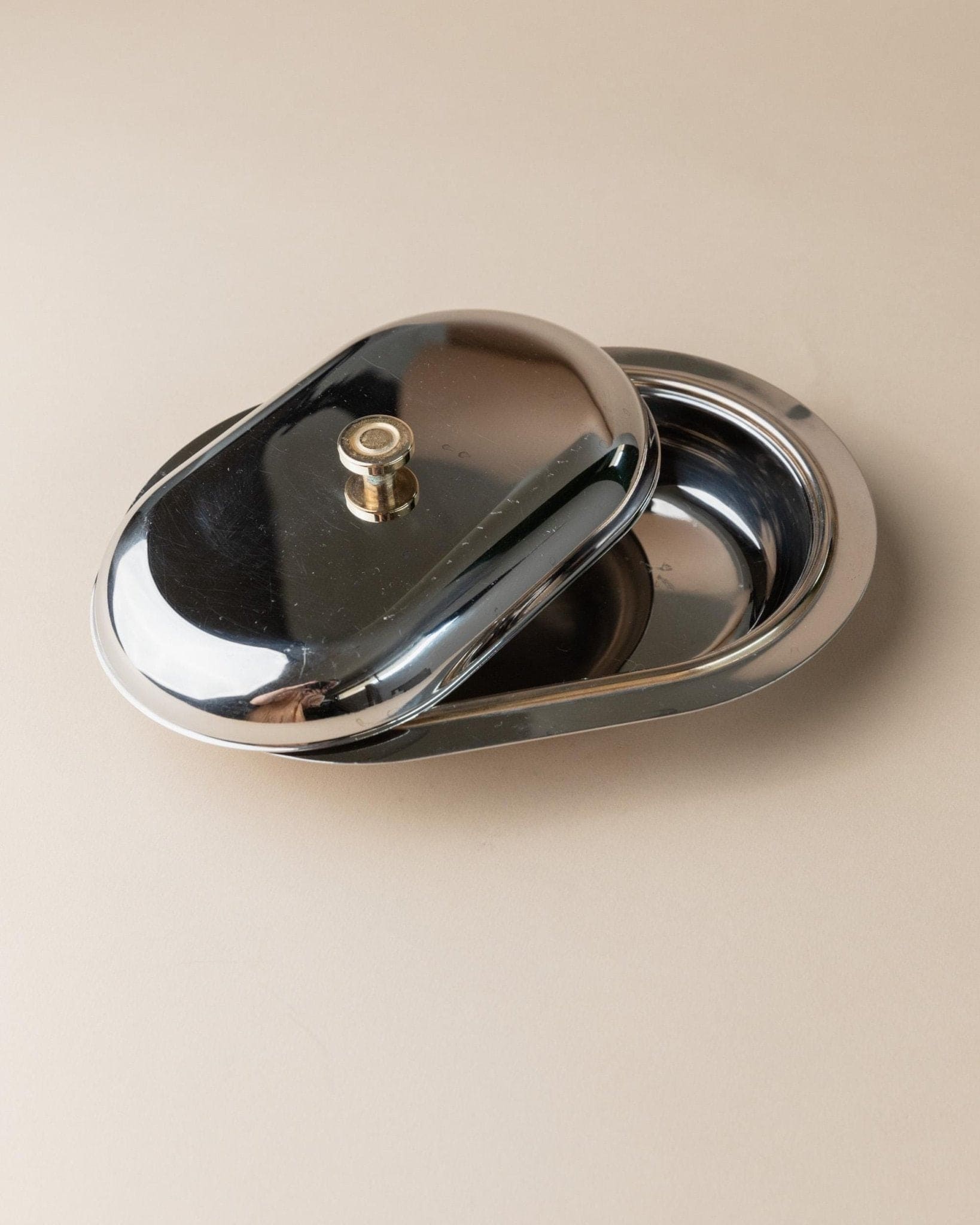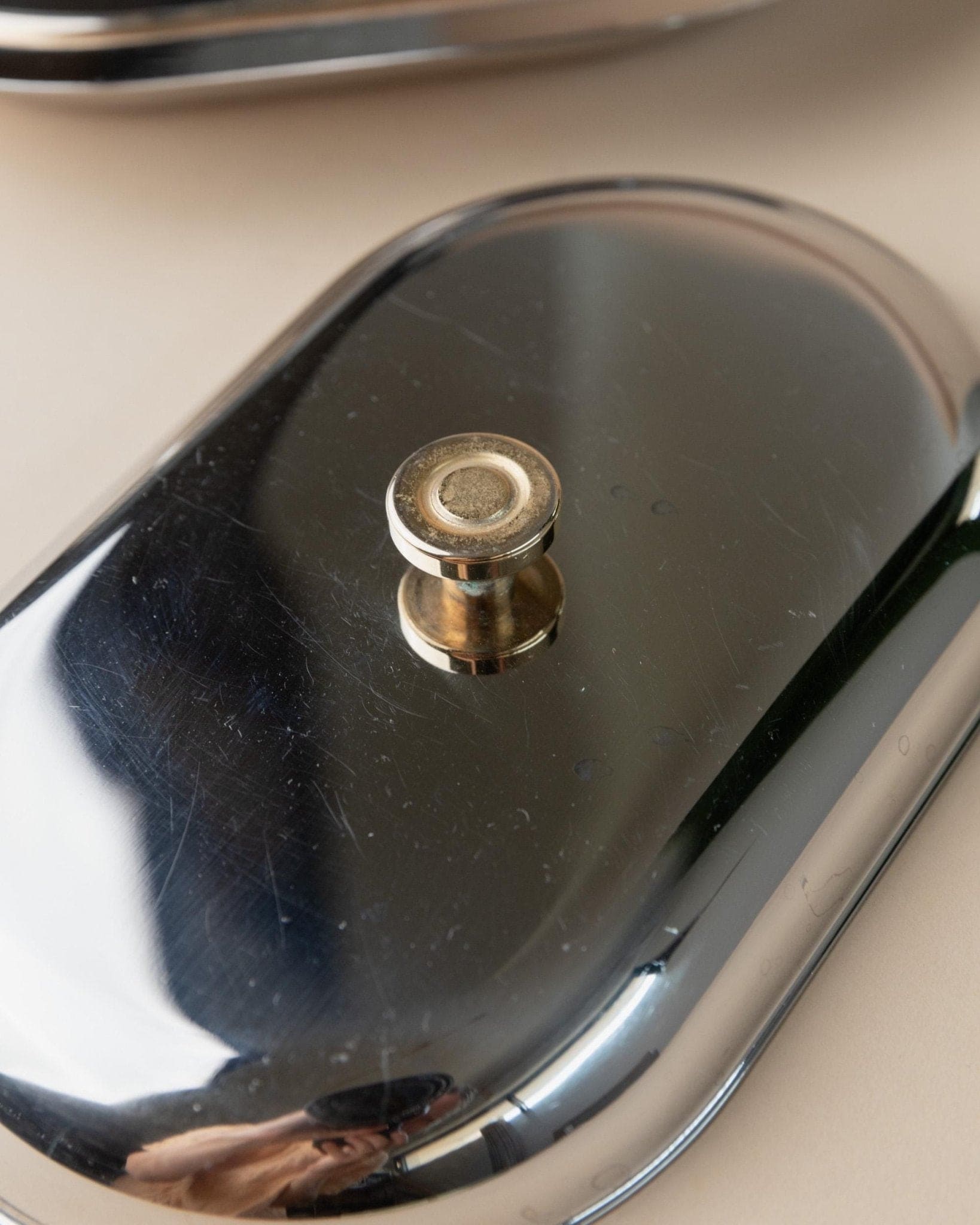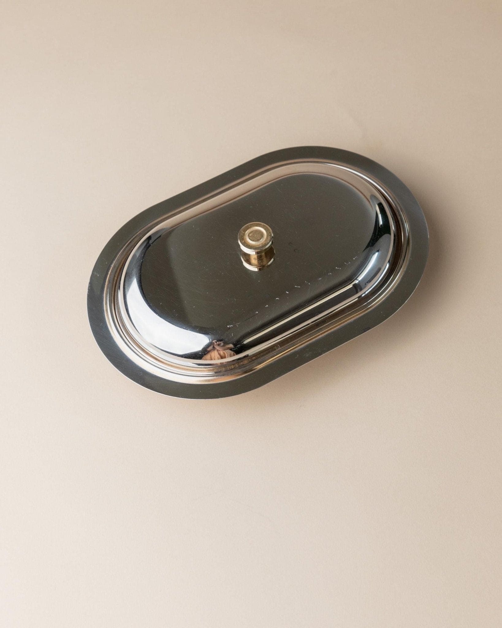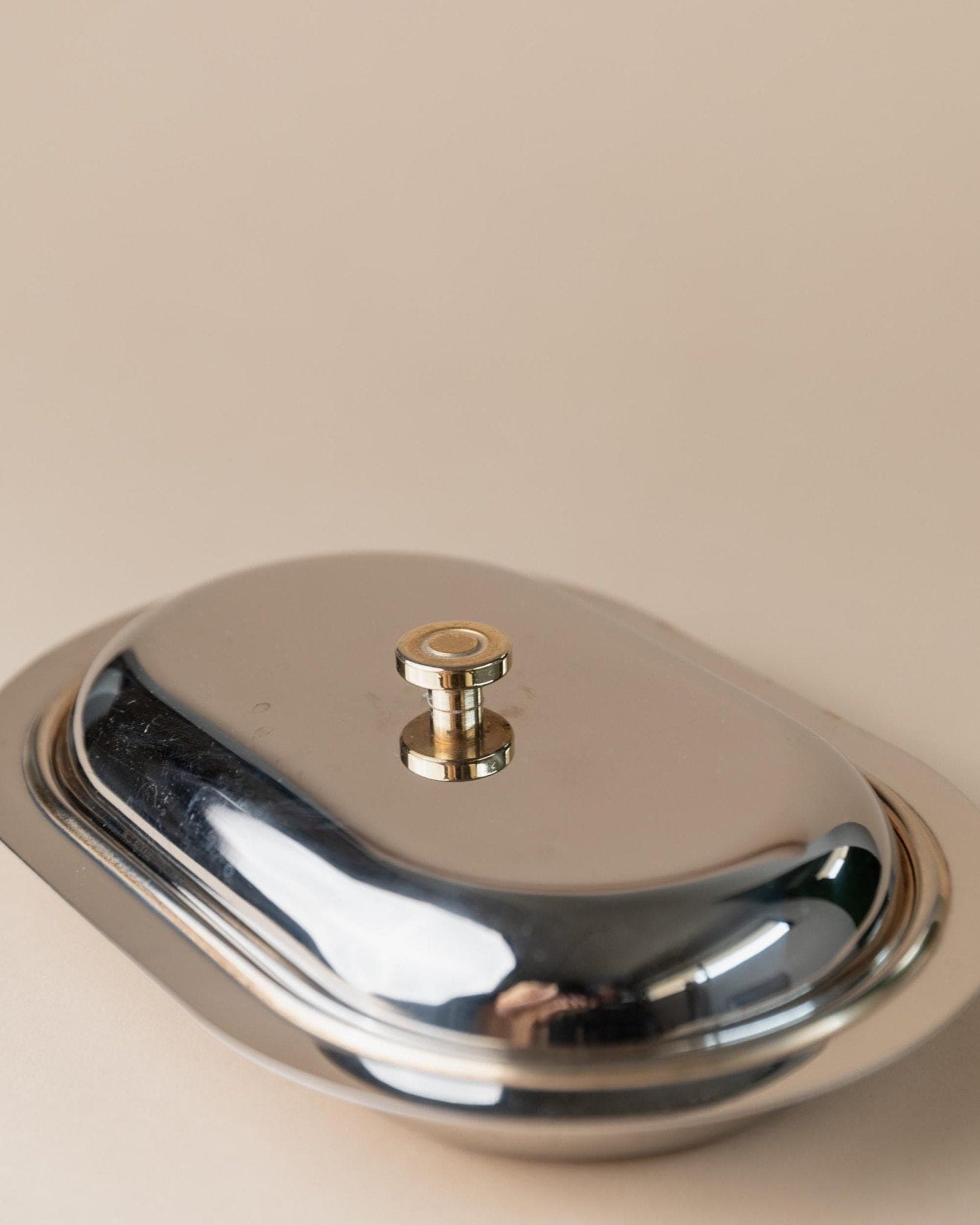 Beurrier vintage en acier inoxydable avec couvercle et détails dorés, Italie années 1970