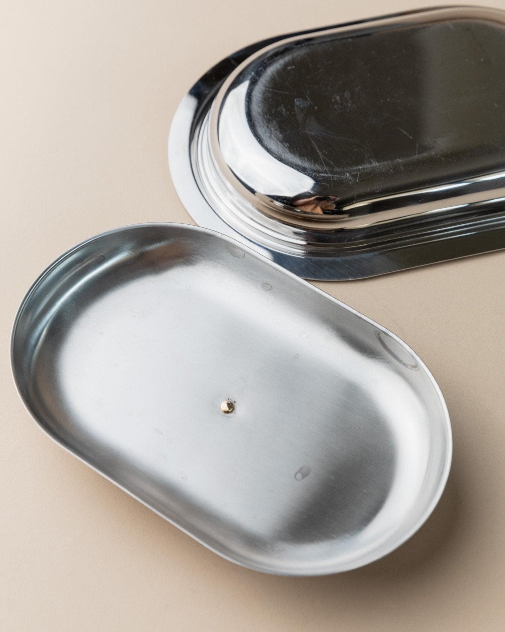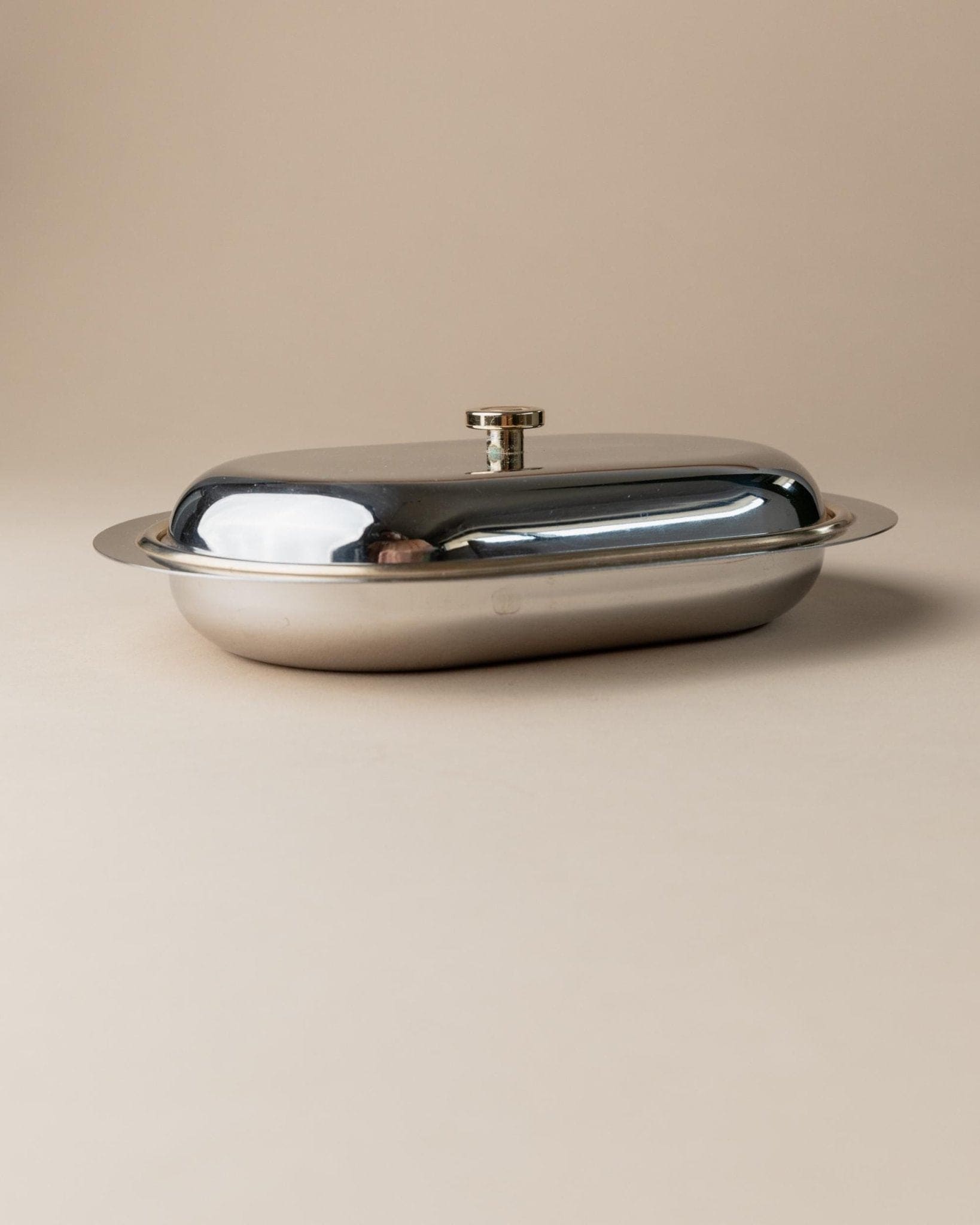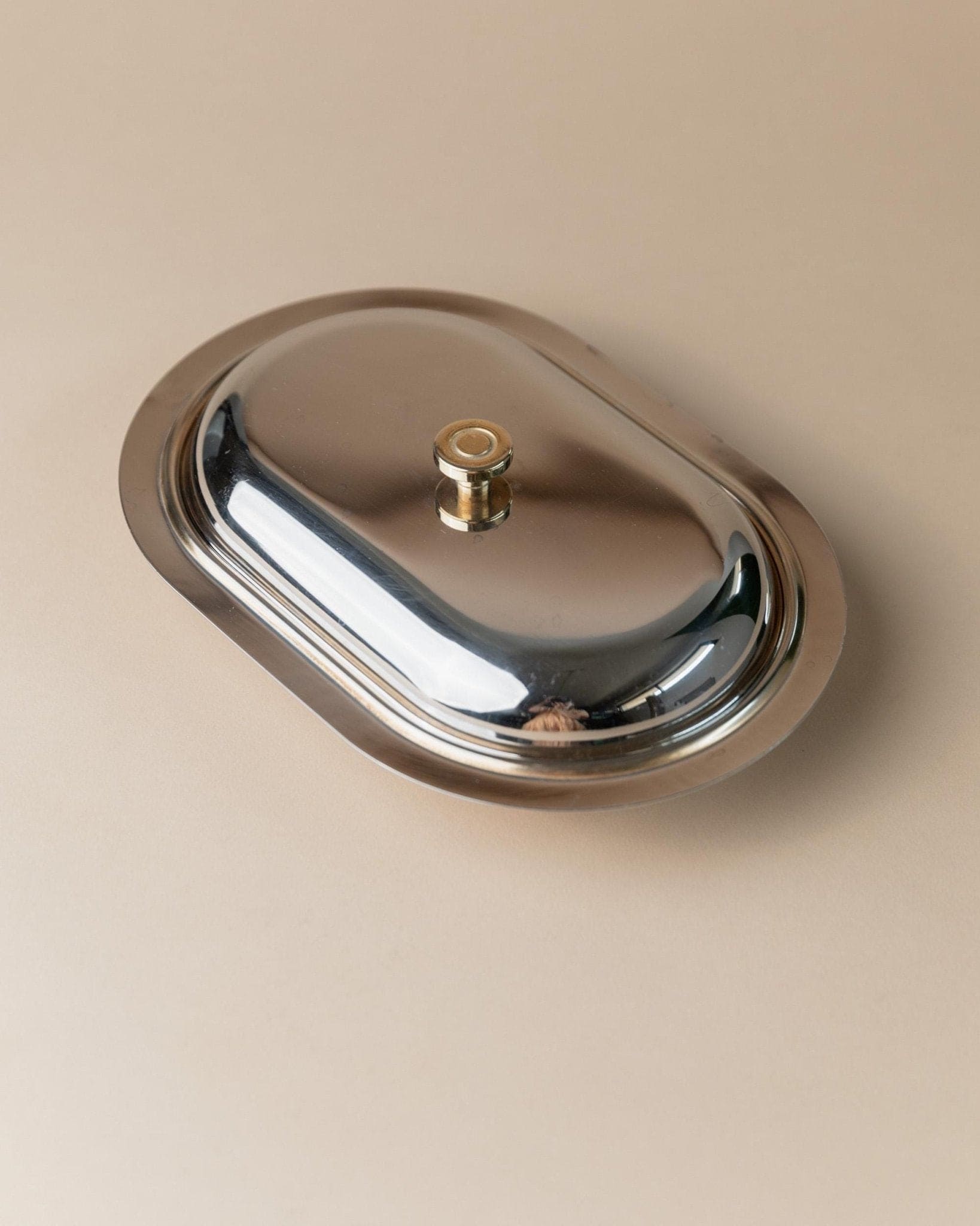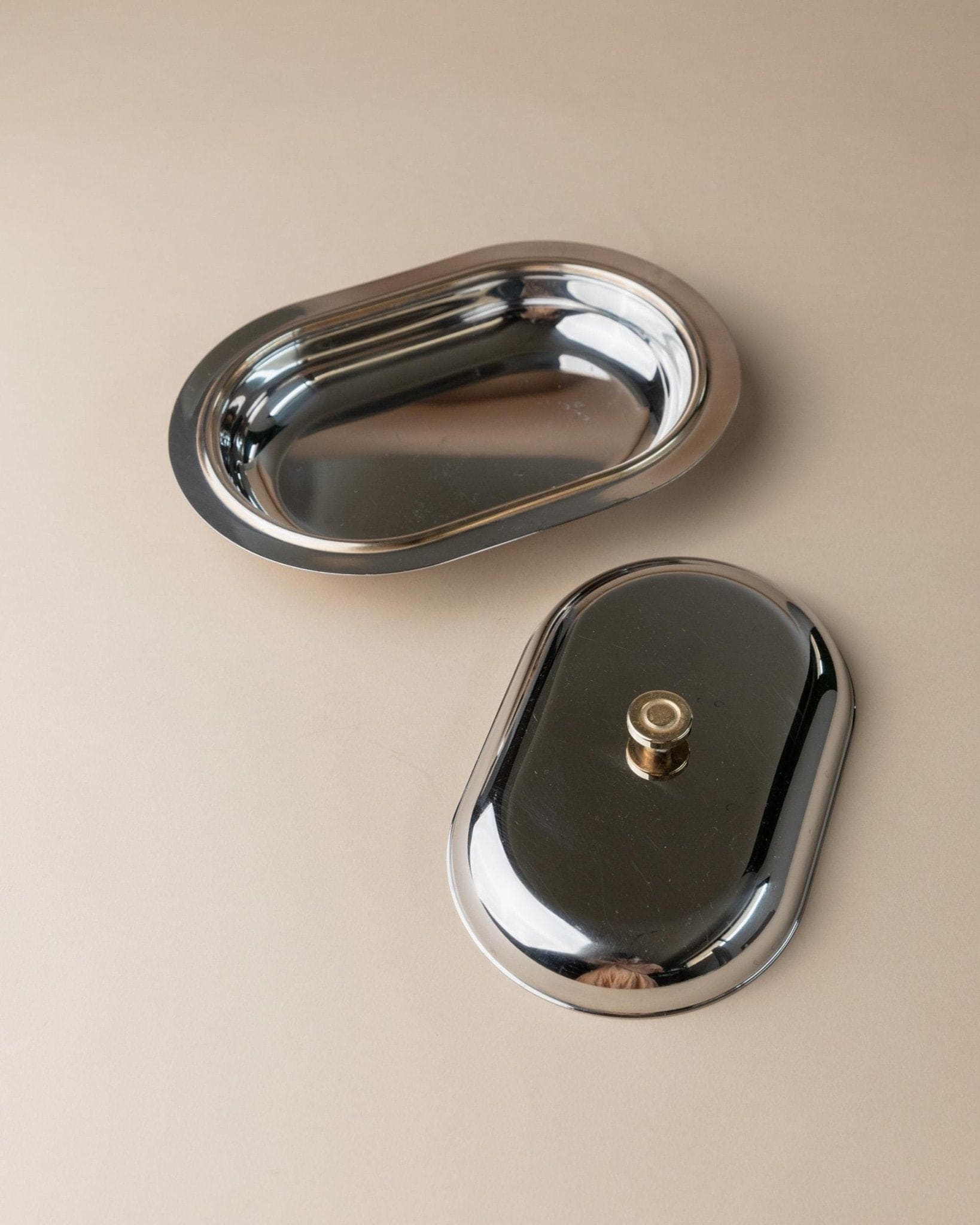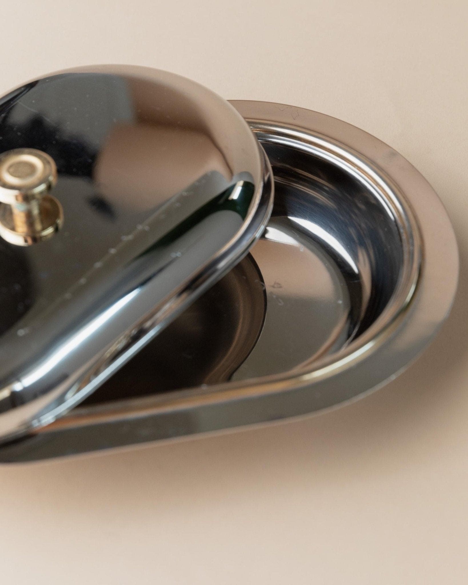 Beurrier vintage en acier inoxydable avec couvercle et détails dorés, Italie années 1970