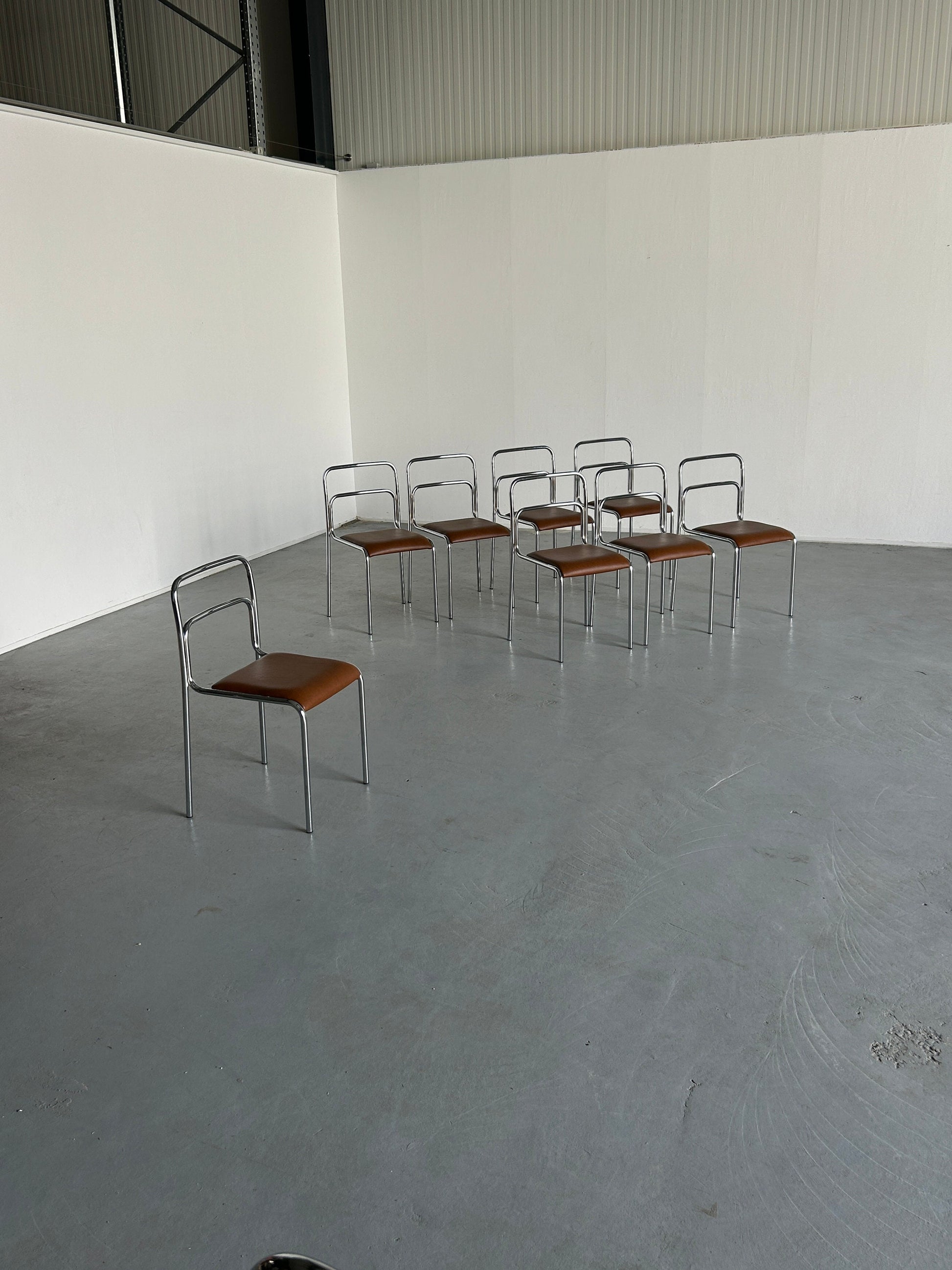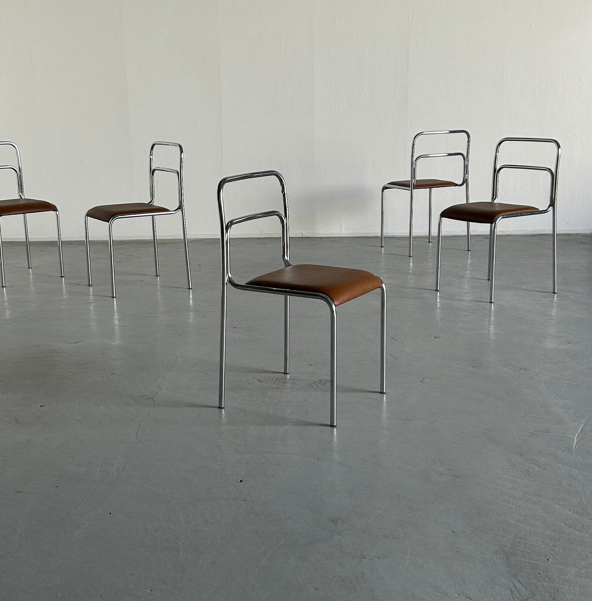 Découvrez le charme du vintage avec cette chaise de salle à manger de style Bauhaus des années 1980. Inspirée du modernisme italien et du style emblématique de l'ère spatiale, cette chaise allie esthétique intemporelle et élégance fonctionnelle. Son remarquable cadre tubulaire chromé et son assise de haute qualité, récemment recouverte de similicuir marron, en font un élément accrocheur dans n'importe quelle pièce. Parfaite pour la salle à manger, le salon ou comme pièce unique et élégante.