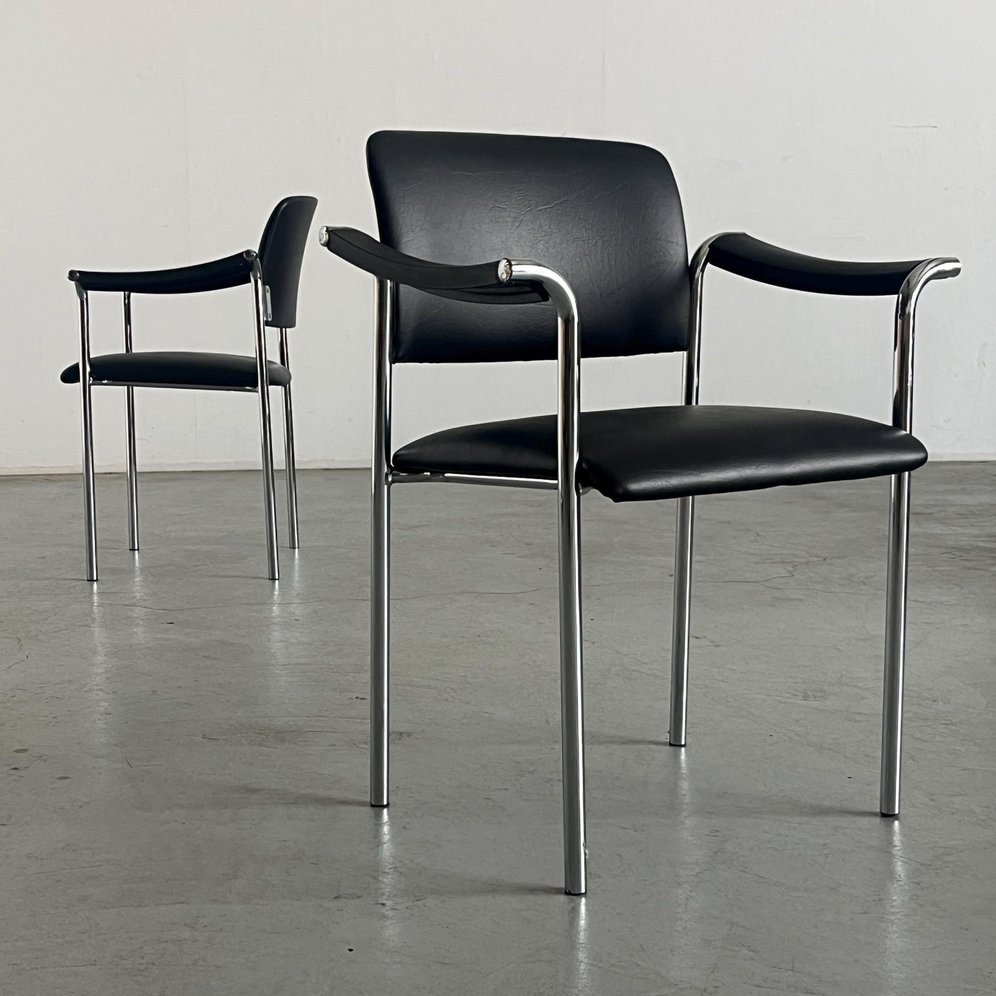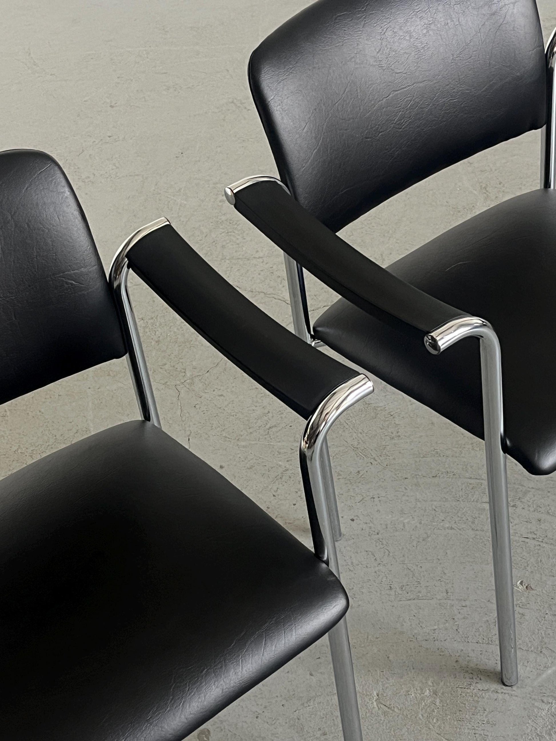 Découvrez le design italien authentique avec cette chaise de salle à manger vintage des années 1980, un véritable incontournable pour les amateurs de mobilier moderne et futuriste du milieu du siècle. Alliant élégance classique et confort fonctionnel, elle apporte le charme d'antan à votre intérieur. Son similicuir noir, retapissé et ses accoudoirs en plastique noir, lui confèrent une allure élégante et intemporelle. Les pieds en acier chromé soulignent la qualité de fabrication et garantissent une longue durée de vie à cette chaise.