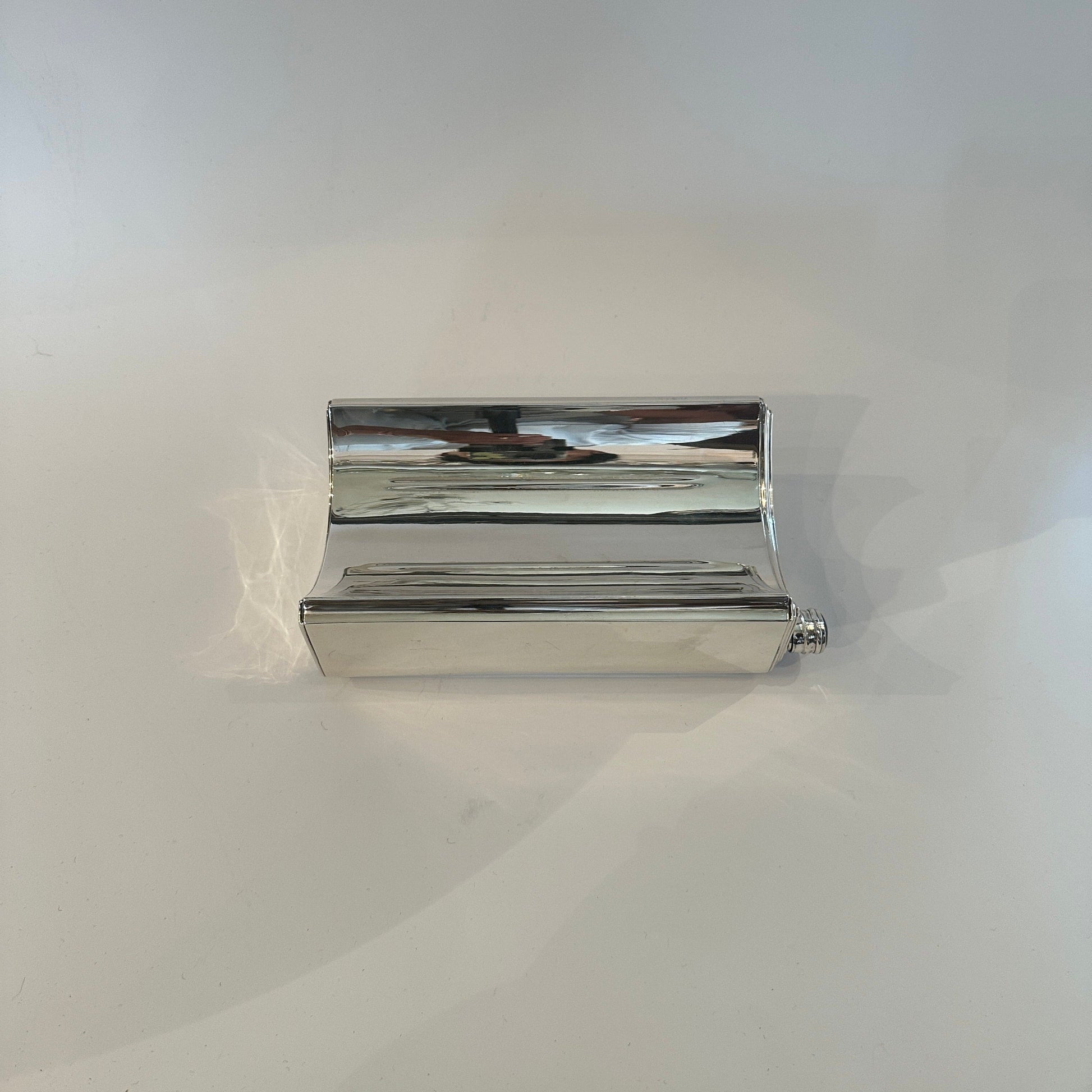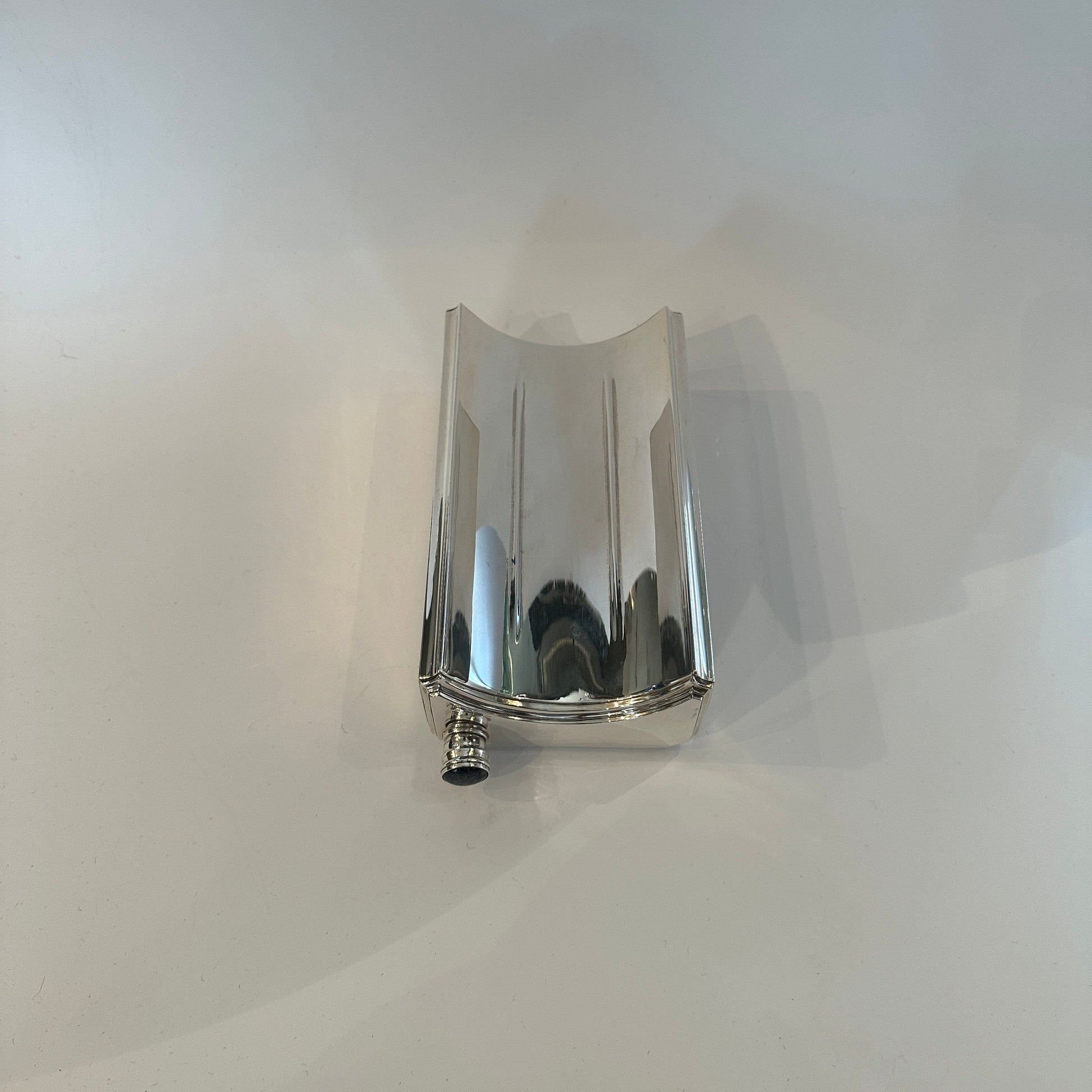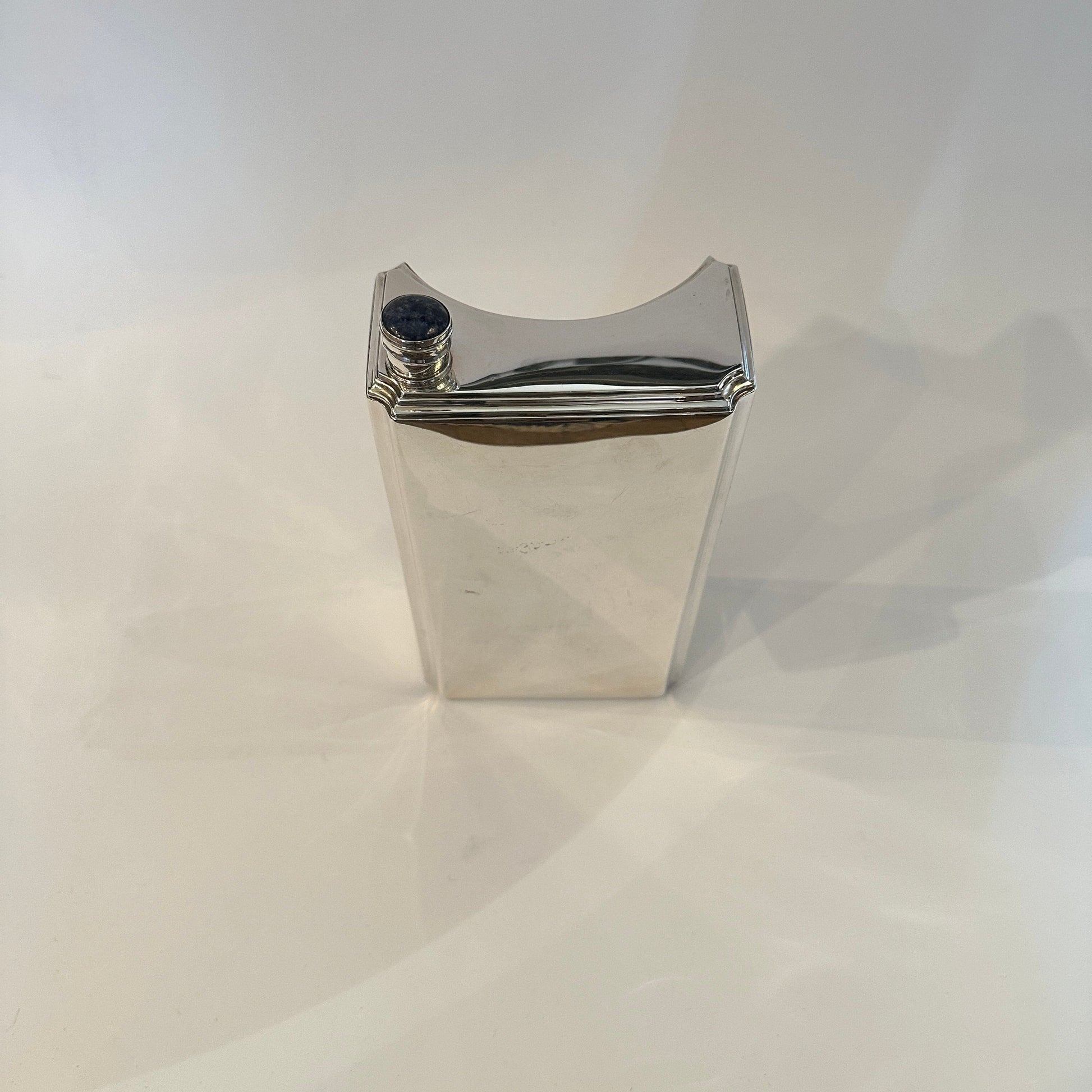 Découvrez une flasque vintage exceptionnelle en argent massif, conçue par la célèbre marque de luxe Cartier. Cette pièce de collection exclusive, datant de la période Art Déco (vers 1930-1945), impressionne par ses lignes épurées et architecturales et son dos élégamment incurvé. Le bouchon à vis d'origine est orné d'un précieux cabochon en lapis-lazuli, soulignant son design luxueux. Sa forme minimaliste allie fonctionnalité, touche Space Age et détails classiques : un véritable atout pour les amateurs de modernité du milieu du siècle et de qualité exceptionnelle.