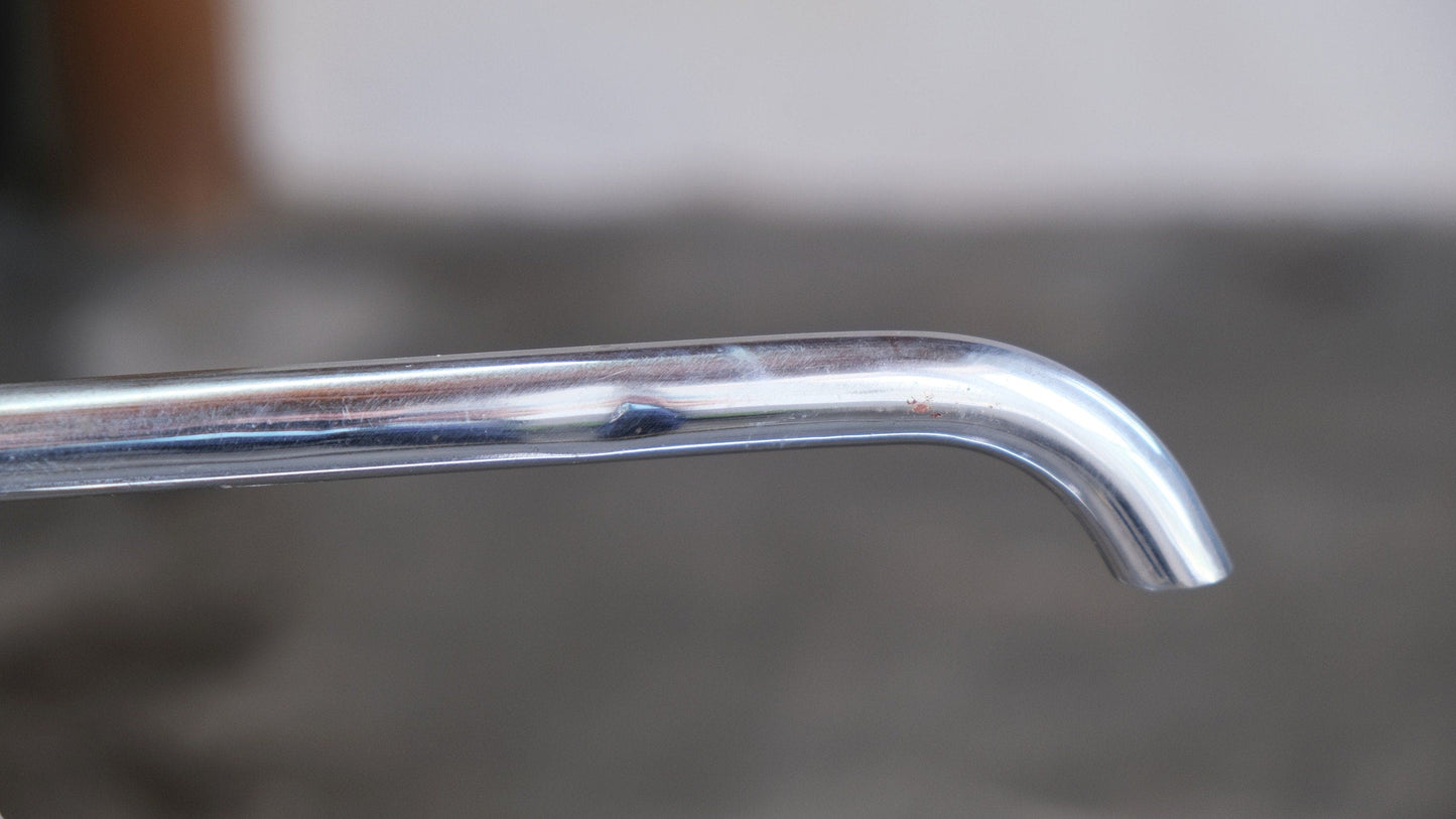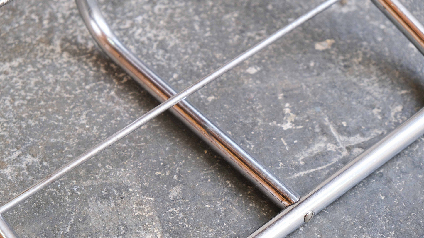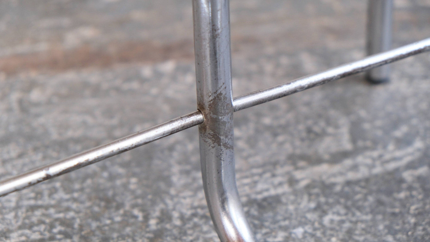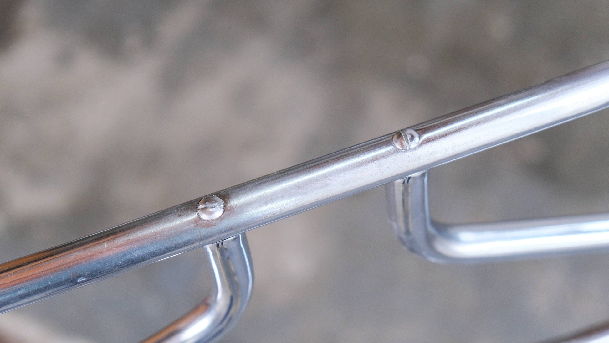 Le tube en acier présente de fortes traces de corrosion et de rayures, notamment au niveau de la partie inférieure des traverses ; le chromage présente par ailleurs un bel éclat. Entièrement démonté, nettoyé et poli.