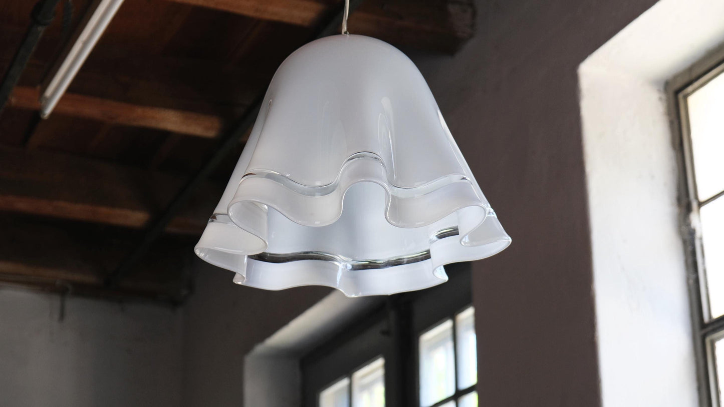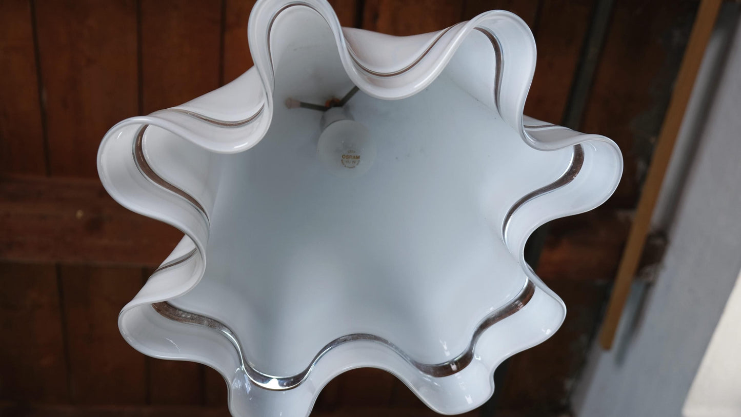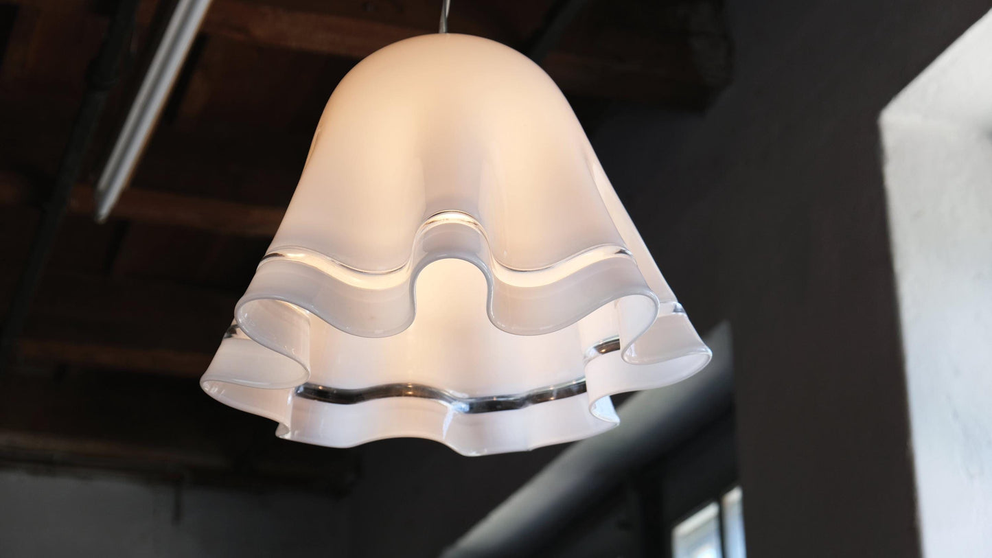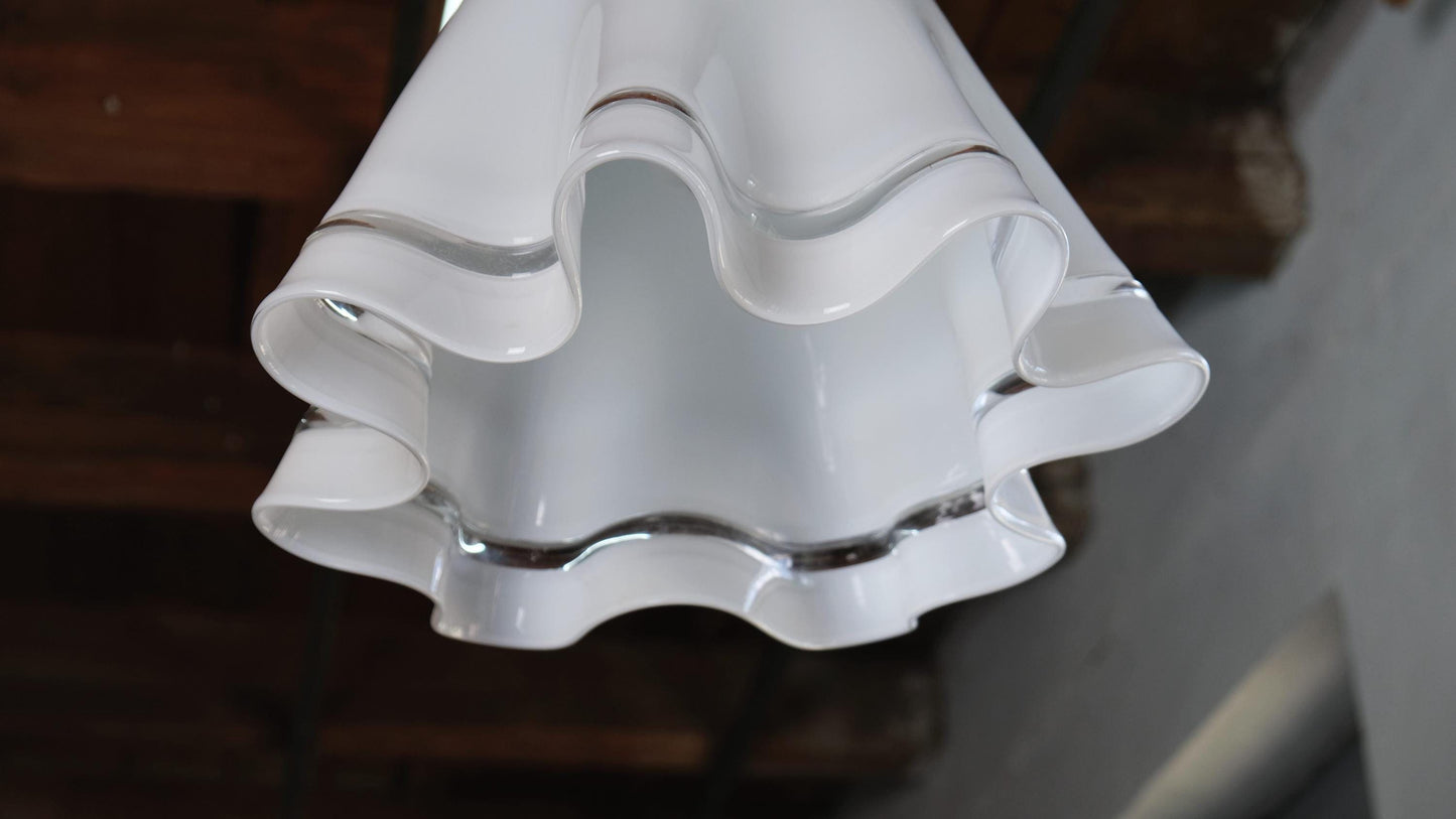 Exceptionnelle suspension des années 1970 / Italie; réalisée en verre artisanal blanc.