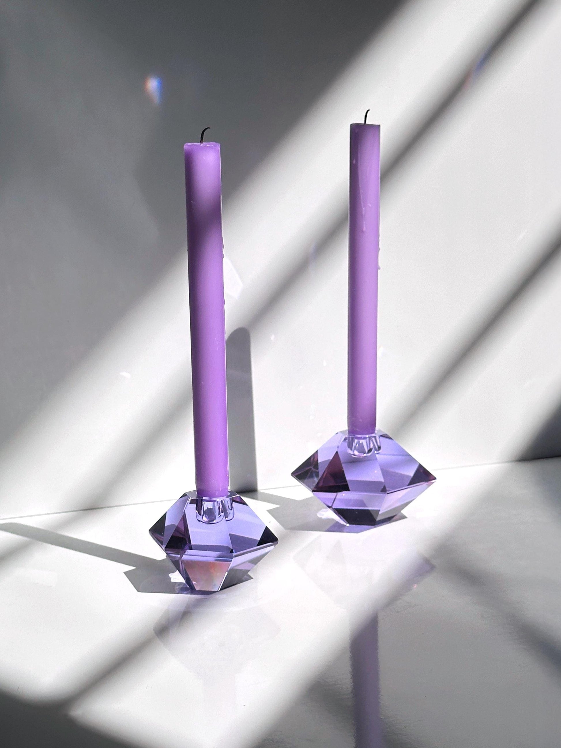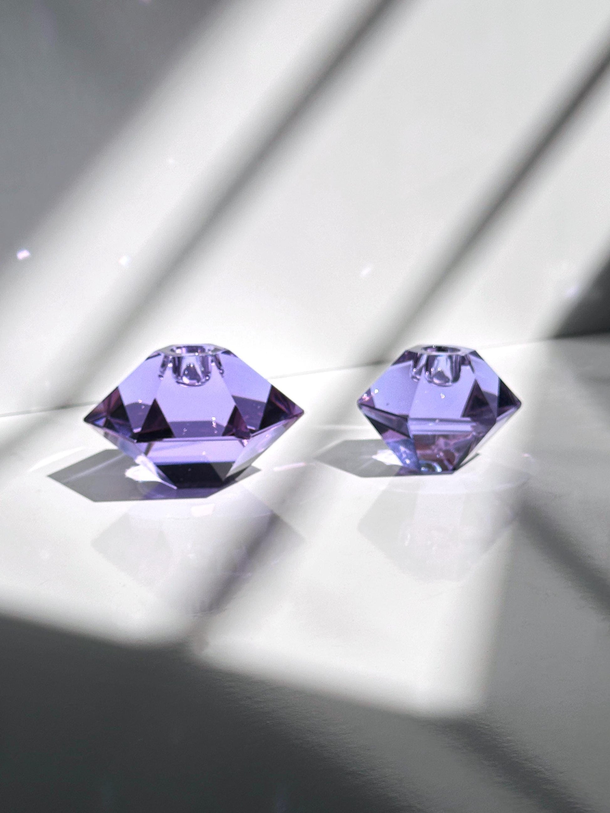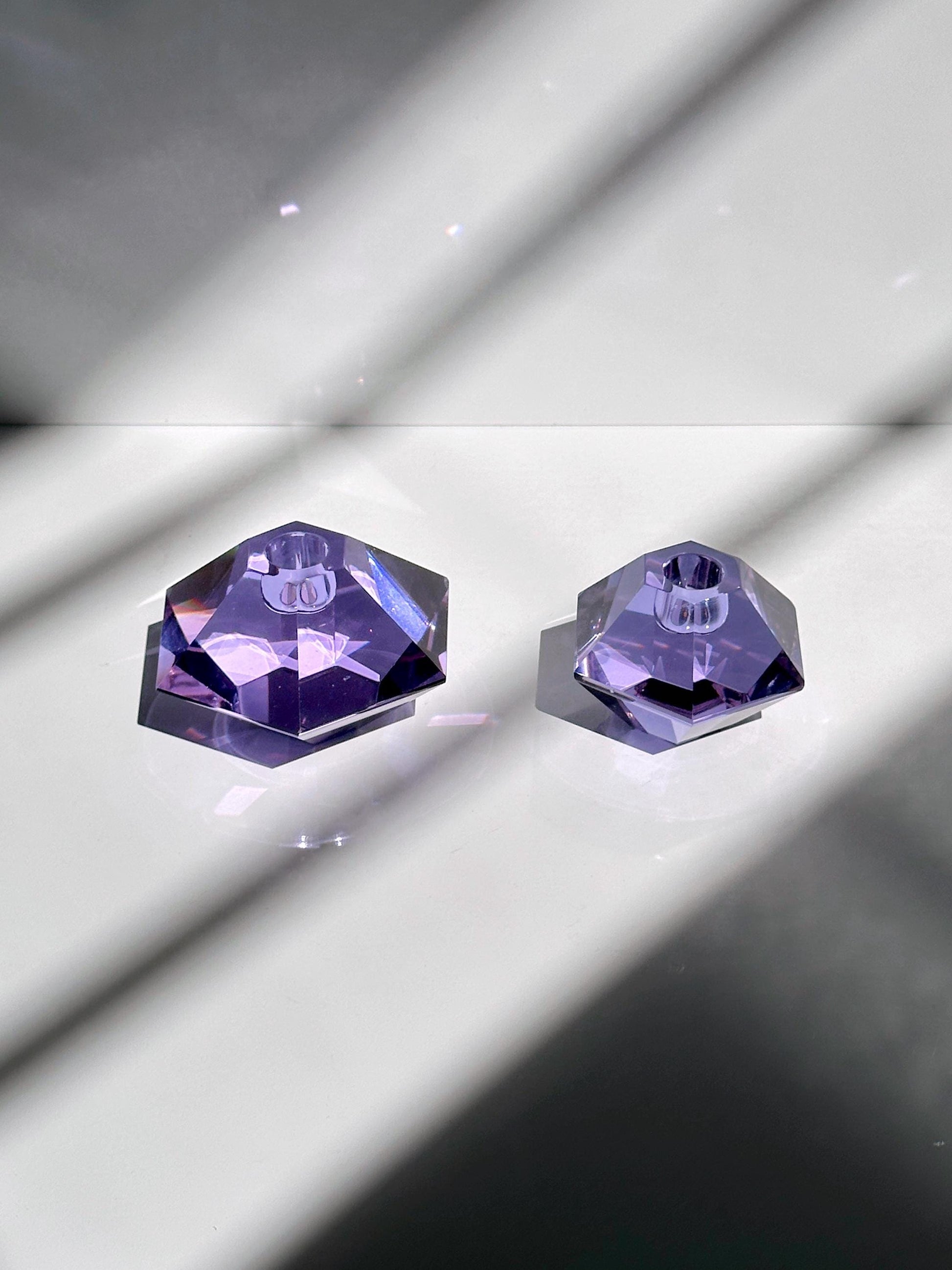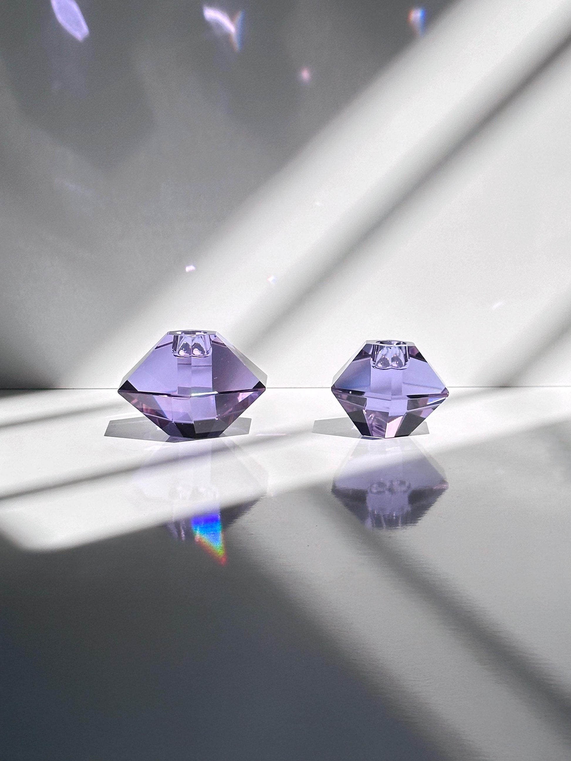 Découvrez une extraordinaire paire de bougeoirs vintage en verre alexandrite massif, un véritable bijou pour les amateurs de design Space Age et Mid-Century Modern. Ces bougeoirs italiens des années 1980 allient le renouveau Art déco à une fascinante forme prismatique qui réfracte la lumière de manière unique. Le verre alexandrite crée un jeu de couleurs unique : à la lumière du jour, les bougeoirs arborent une teinte lilas ou rose délicate, tandis que sous une lumière froide, ils se parent d'élégantes nuances de violet, voire de bleu clair. Un ensemble élégant qui apporte une touche de charme rétro et de grande qualité à n'importe quelle pièce.