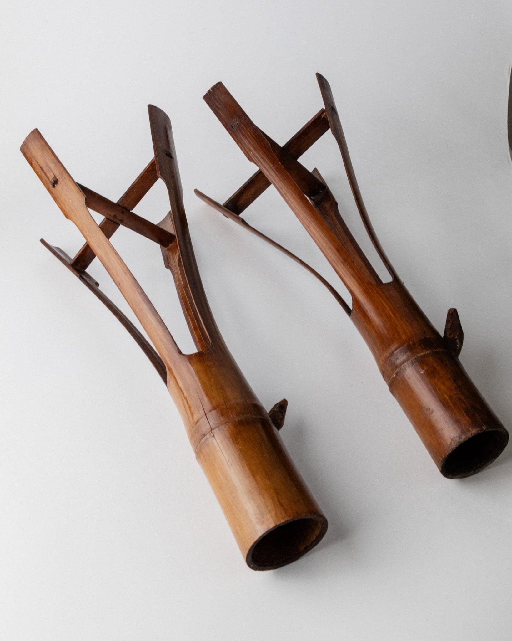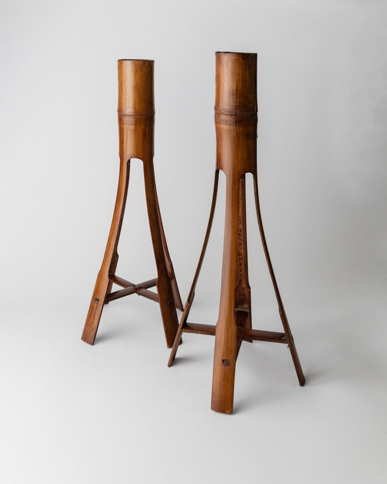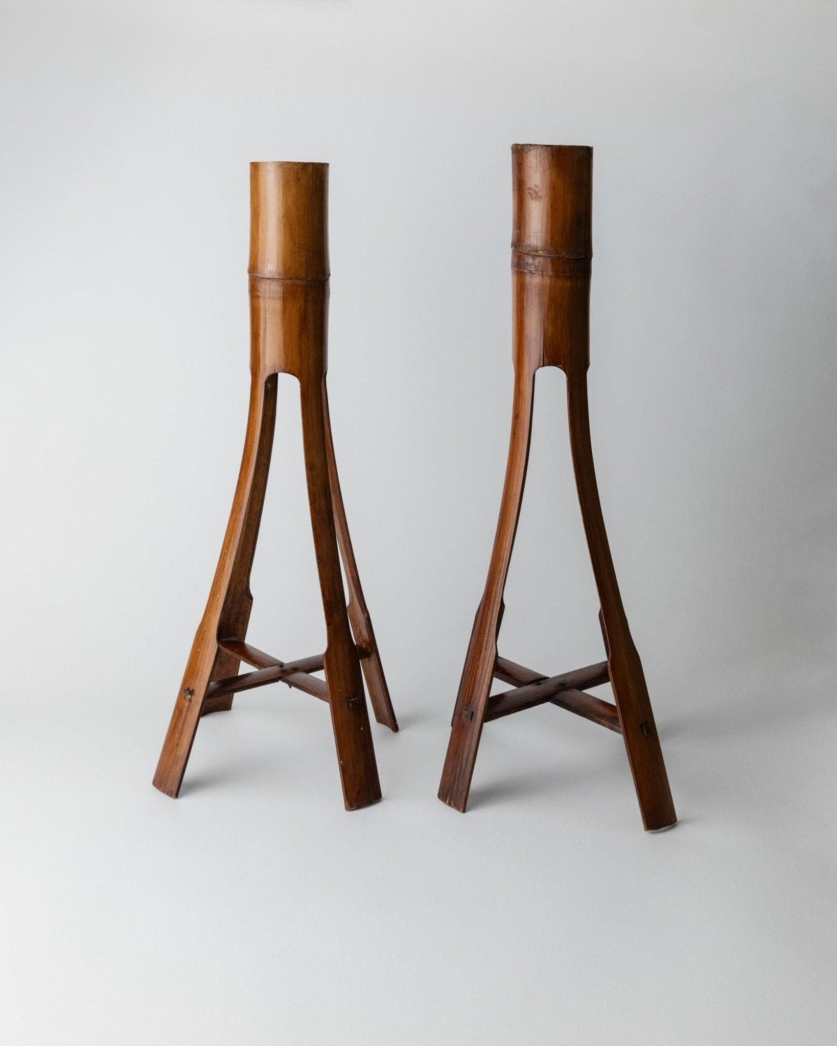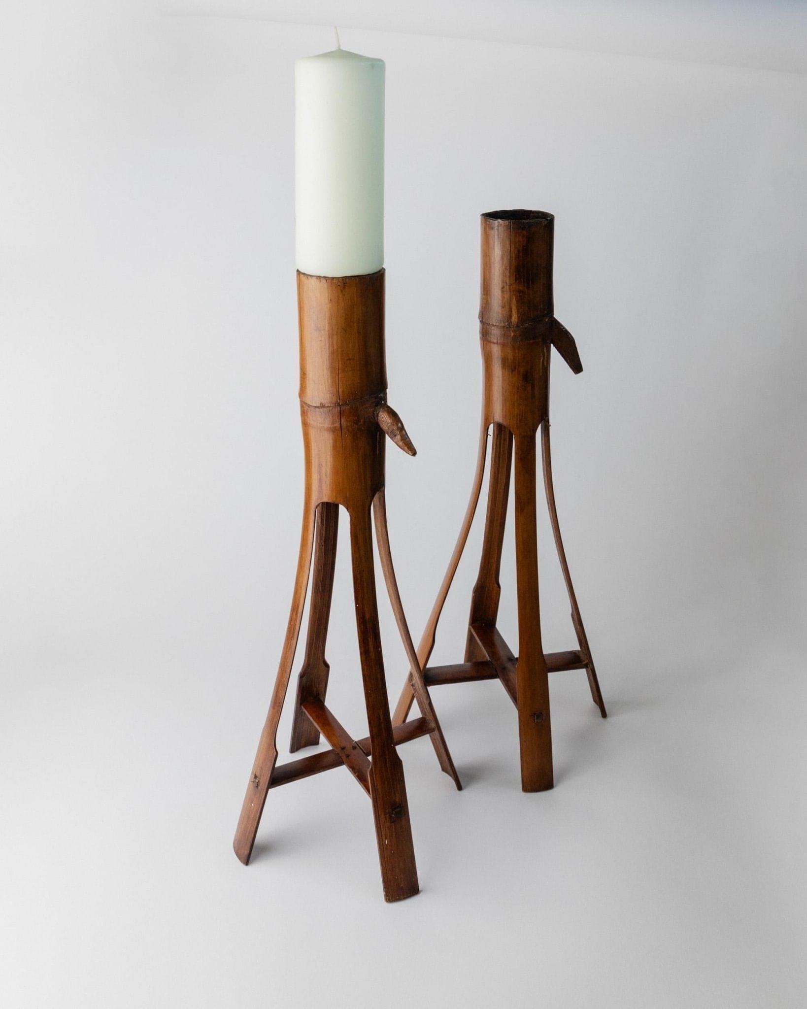 Ajoutez une touche de charme vintage à votre intérieur avec ces bougeoirs originaux en bambou au style bohème. Originaires d'Italie dans les années 1960, ces deux bougeoirs impressionnent par leur forme organique, leur matériau naturel chaleureux et leur magnifique patine. Leur design sculptural en fait un véritable accroche-regard : parfaits en centre de table, sur un buffet ou même comme décoration de sol élégante. Ces pièces modernes du milieu du siècle apportent une touche d'élégance spatiale et naturelle à n'importe quelle pièce.