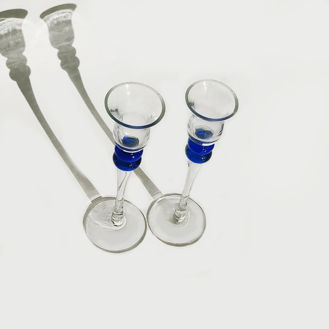 Découvrez le design intemporel de l'ensemble de 2 bougeoirs vintage en verre bleu. Ces élégants bougeoirs apportent une touche de modernité et d'ère spatiale du milieu du siècle à votre maison. La combinaison du verre transparent et bleu ajoute une touche élégante à n'importe quelle pièce. Parfait pour les occasions spéciales ou pour ajouter une touche d'élégance à votre quotidien.