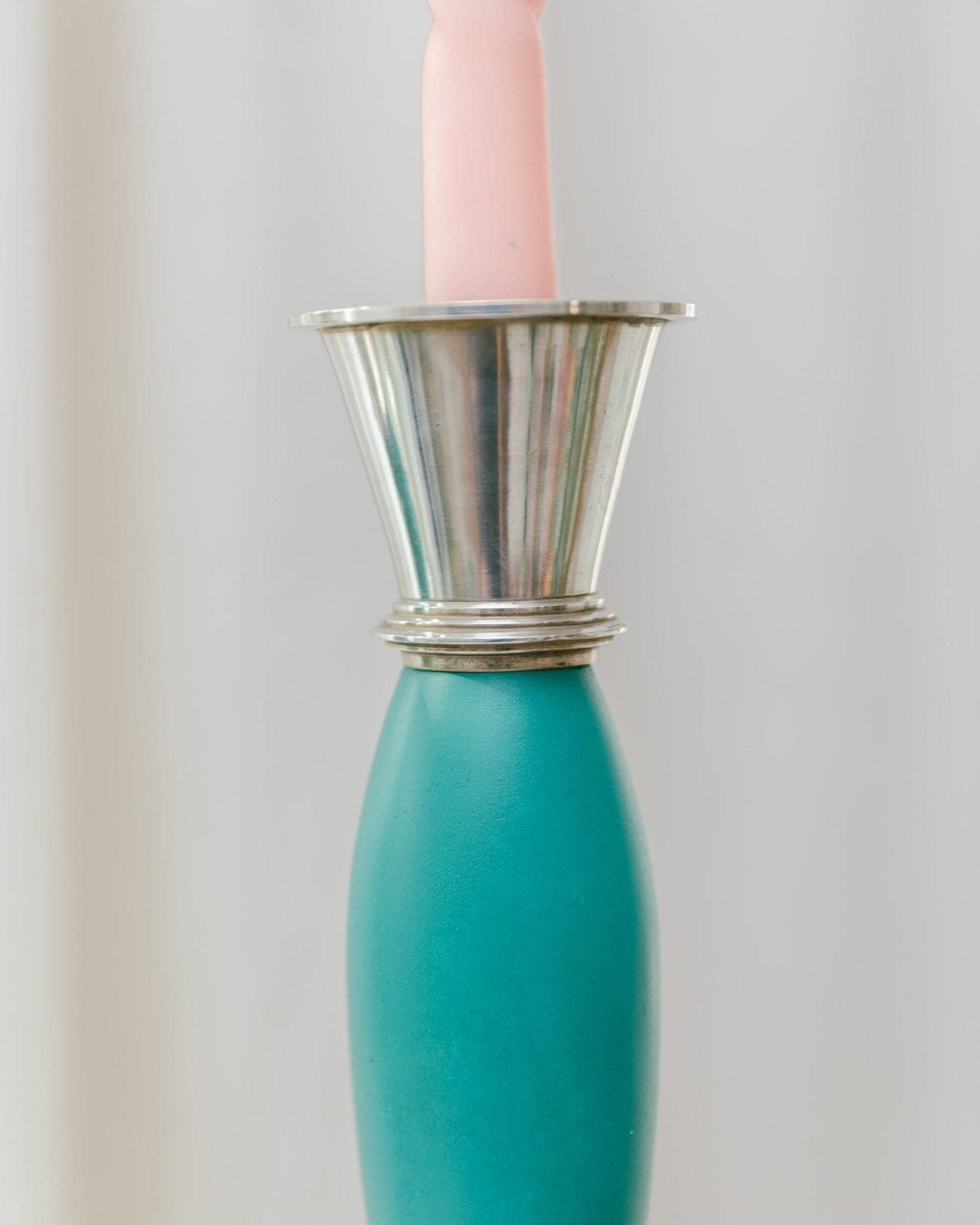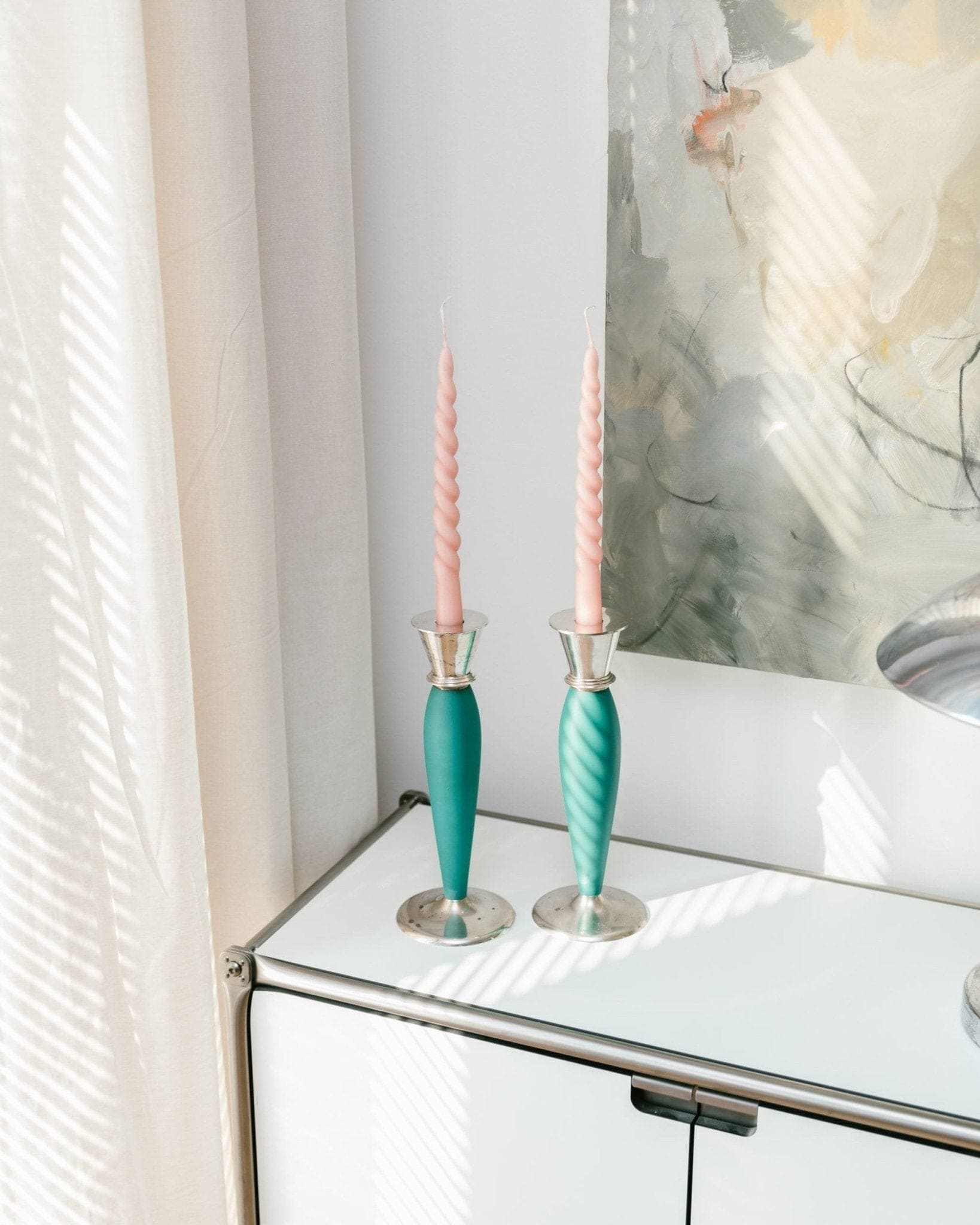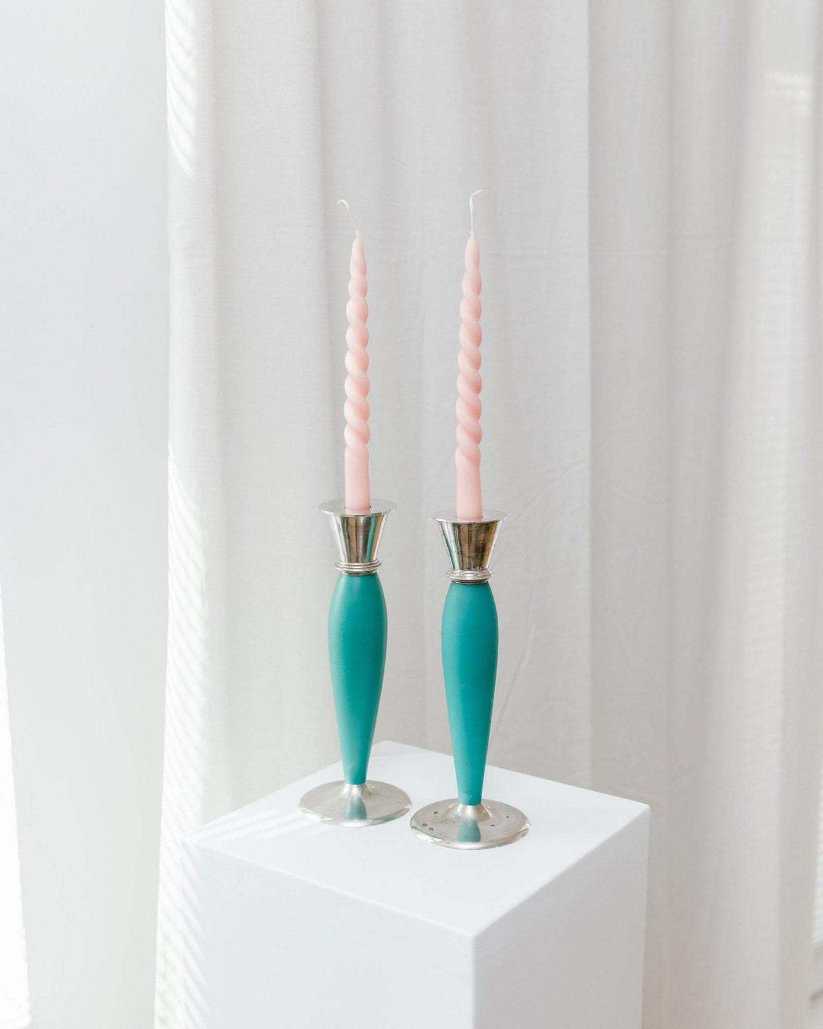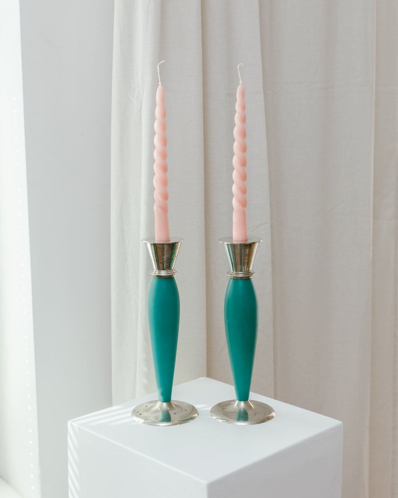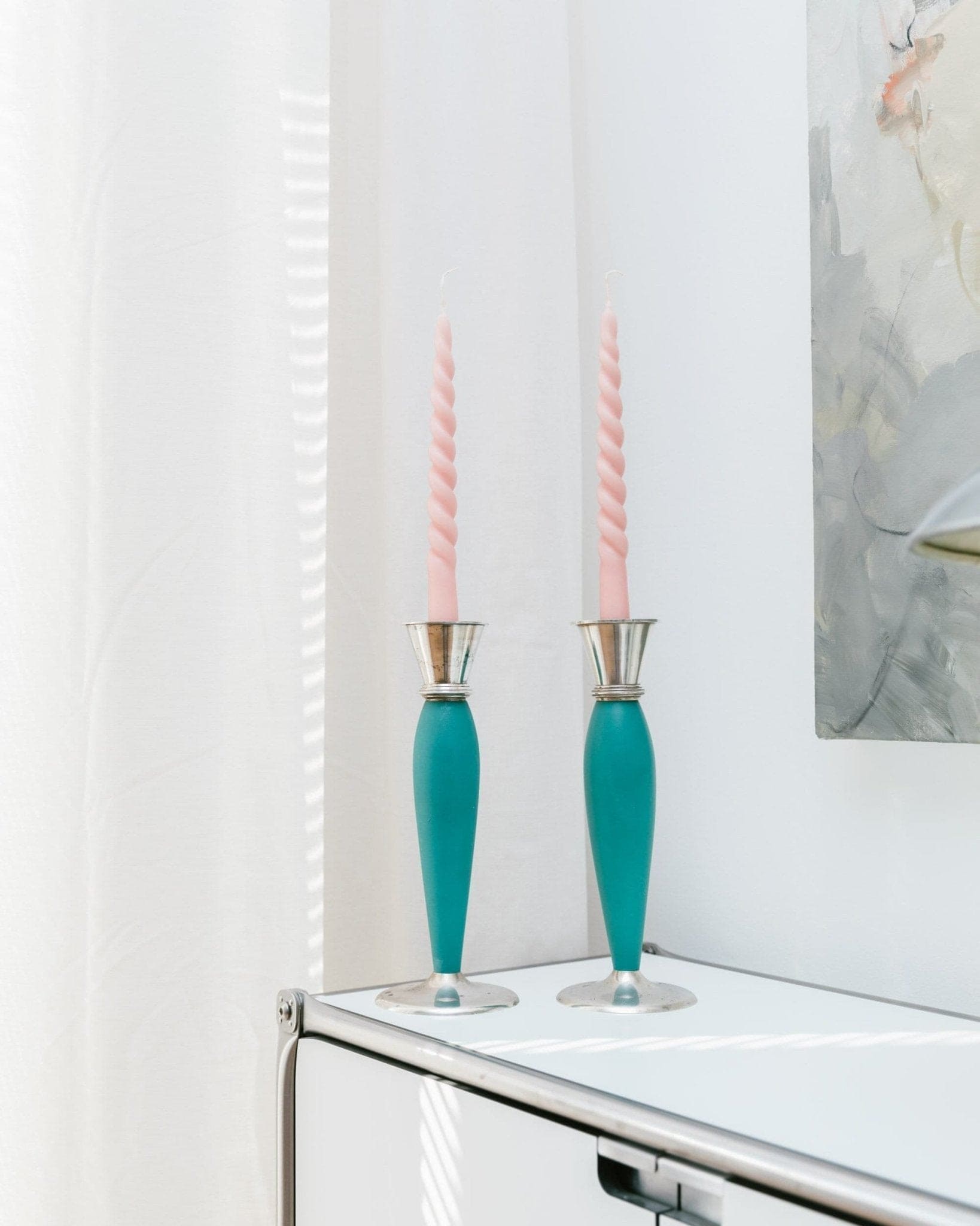 Apportez une touche Space Age et Mid-Century Modern à votre intérieur avec cet ensemble unique de deux bougeoirs vintage au style Memphis rétro postmoderne du début des années 2000. Leur forme conique et leur design original en font un véritable accroche-regard sur une table à manger ou un buffet. Leur excellente qualité et leur style vintage authentique créent une ambiance élégante et s'intègrent parfaitement dans n'importe quelle pièce. Parfait pour les amateurs de design en quête d'originalité.